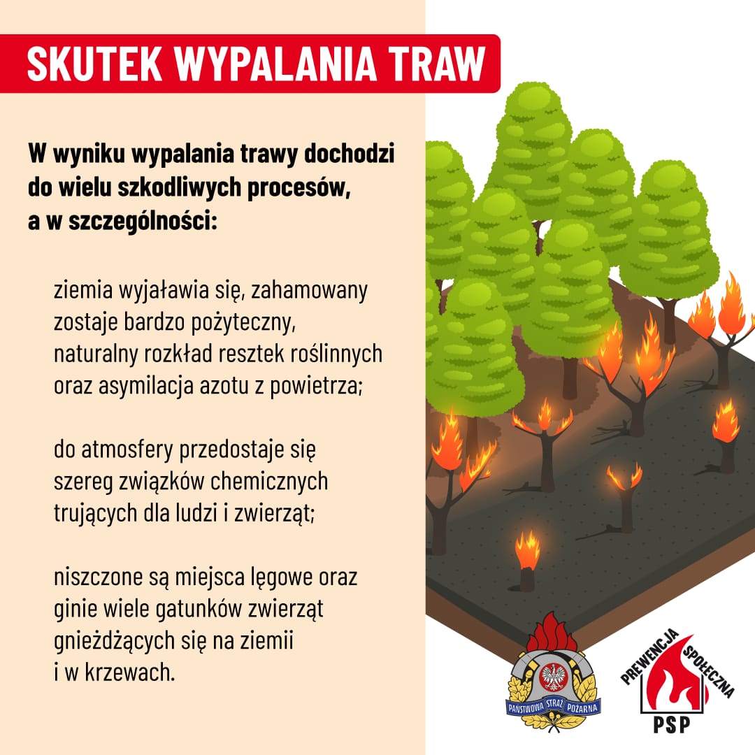 Wypalanie traw jest również przyczyną wielu pożarów, które niejednokrotnie prowadzą niestety także do wypadków śmiertelnych.