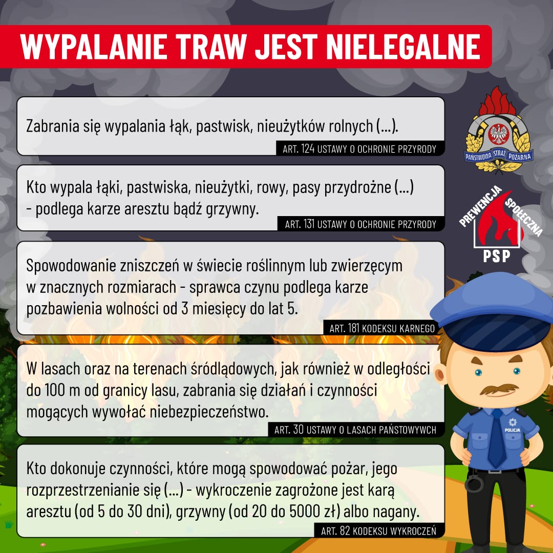 Ci, którzy mimo wszystko chcą ryzykować, muszą również liczyć się z konsekwencjami prawnymi, a więcej informacji o tym i o całej kampanii społecznej „Stop pożarom traw”, dostępne jest na stronie Komendy Głównej PSP pod linkiem poniżej.