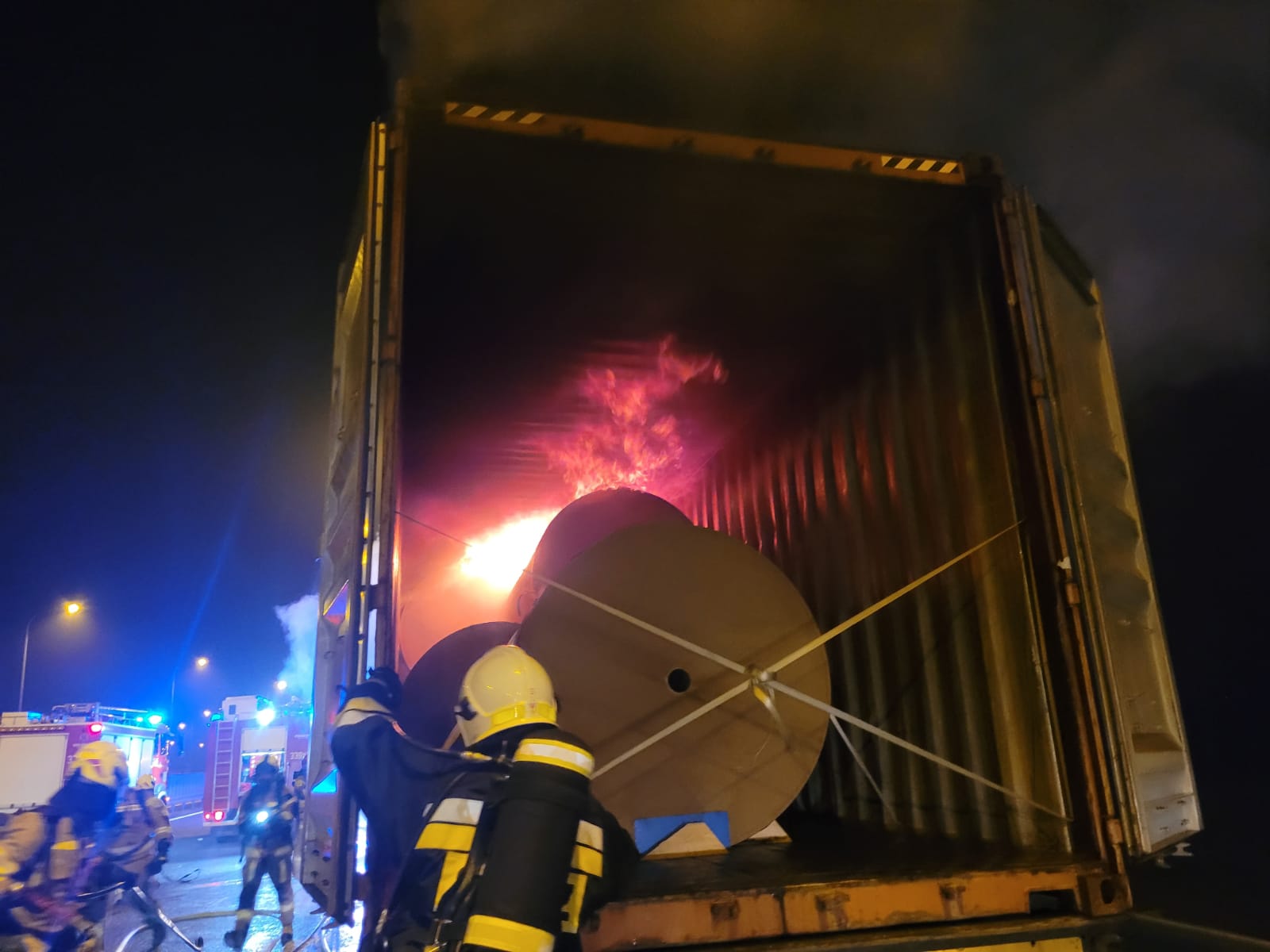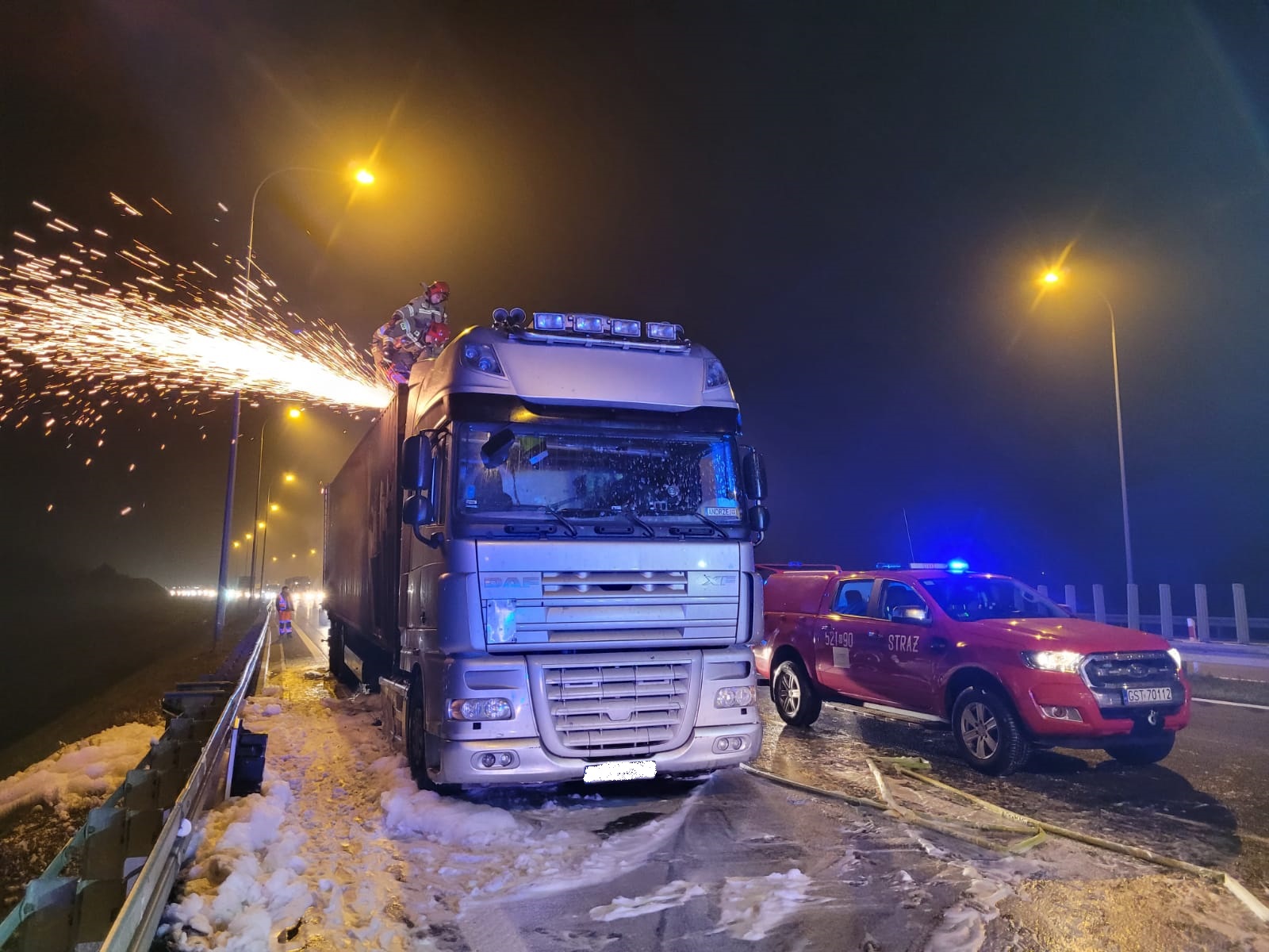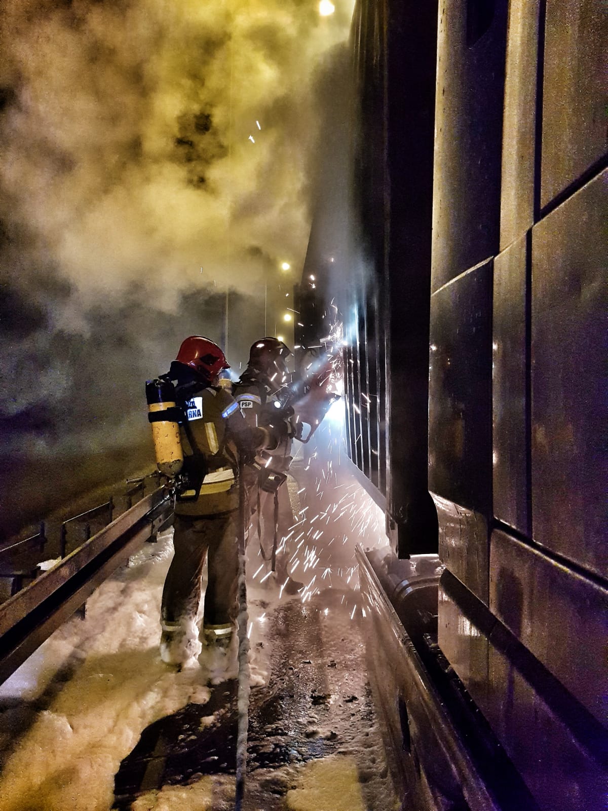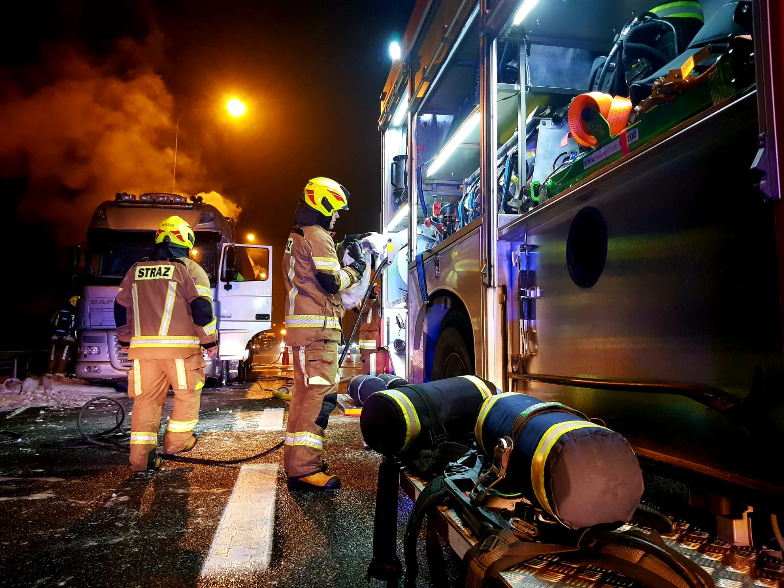 16 listopada 2021 roku do Stanowiska Kierowania Komendanta Powiatowego Państwowej Straży Pożarnej w Pruszczu Gdańskim wpłynęło zgłoszenie, z którego wynikało, że na autostradzie A1 na pasie awaryjnym w kierunku Gdańska w miejscowości Kleszczewko znajduje się ciągnik siodłowy z naczepą kontenerową, które objęte są pożarem. Po przybyciu na miejsce zdarzenia KDR potwierdził zgłoszenie, palił się tył kabiny oraz część naczepy, w której znajdował się papier w rolach. Brak osób poszkodowanych. Stwierdzono również uszkodzenie zbiornika paliwa o pojemności około 500 litrów, które mogło doprowadzić do rozszerzenia się pożaru. Działania strażaków polegały na zabezpieczeniu i oświetleniu miejsca zdarzenia, wstrzymaniu ruchu na obydwu pasach A1, podaniu prądów wody i piany na źródło pożaru oraz położeniu poduszki piany gaśniczej pod uszkodzony zbiornik paliwa. Koniecznym było wykonanie otworów rewizyjnych w poszyciu bocznym i dachu kontenera w celu dogaszenia zarzewi ognia z użyciem lancy gaśniczej. Na miejsce działań zadysponowano Specjalistyczną Grupę Ratownictwa Chemiczno-Ekologicznego Starogard, która przy użyciu pompy beczkowej przepompowała paliwo z uszkodzonego zbiornika do zbiorników zastępczych dostarczonych na miejsce przez obsługę autostrady. W działaniach brały udział zastępy z JRG Pruszcz Gdański, OSP Łęgowo, OSP Pszczółki, Specjalistyczna Grupa Ratownictwa Chemiczno-Ekologicznego Starogard, Zespół Ratownictwa Medycznego, Policja i Służby Utrzymania Autostrady.