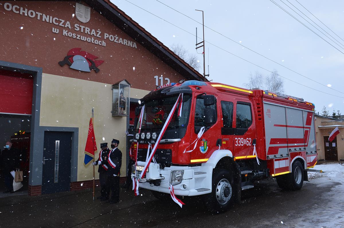 W dniu 04.02.2021 r. o godz. 15:00 w Ochotniczej Straży Pożarnej w Koszwałach odbyła się uroczysta zbiórka w związku z przekazaniem nowego samochodu pożarniczego GBA 3/16 na podwoziu VOLVO FL.