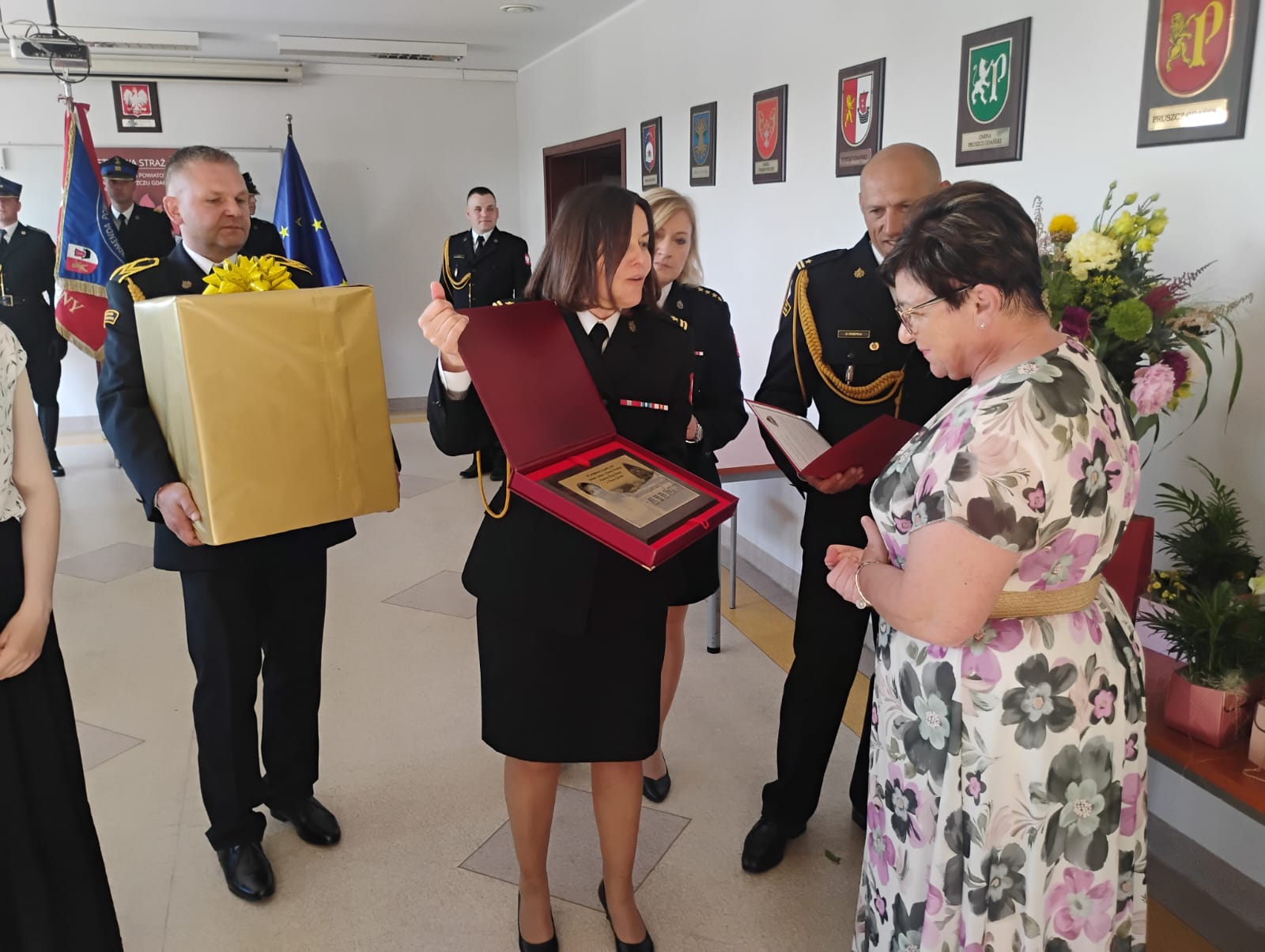 Na koniec spotkania nastąpiło pożegnanie z Panią Marią Soją długoletnią pracownicą cywilną w Komendzie Powiatowej PSP w Pruszczu Gdańskim z okazji przejścia na zasłużoną emeryturę. W zbiórce uczestniczyli byli i obecni funkcjonariusze i pracownicy cywilni Komendy Powiatowej Państwowej Straży Pożarnej w Pruszczu Gdańskim, którzy mieli okazję współpracować z Panią Marią, a także jej najbliżsi. Komendant Powiatowy PSP w imieniu całej załogi wręczył pamiątkowy upominek od współpracowników.