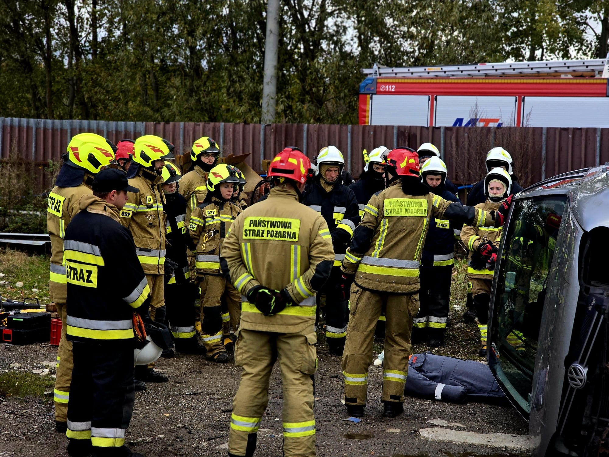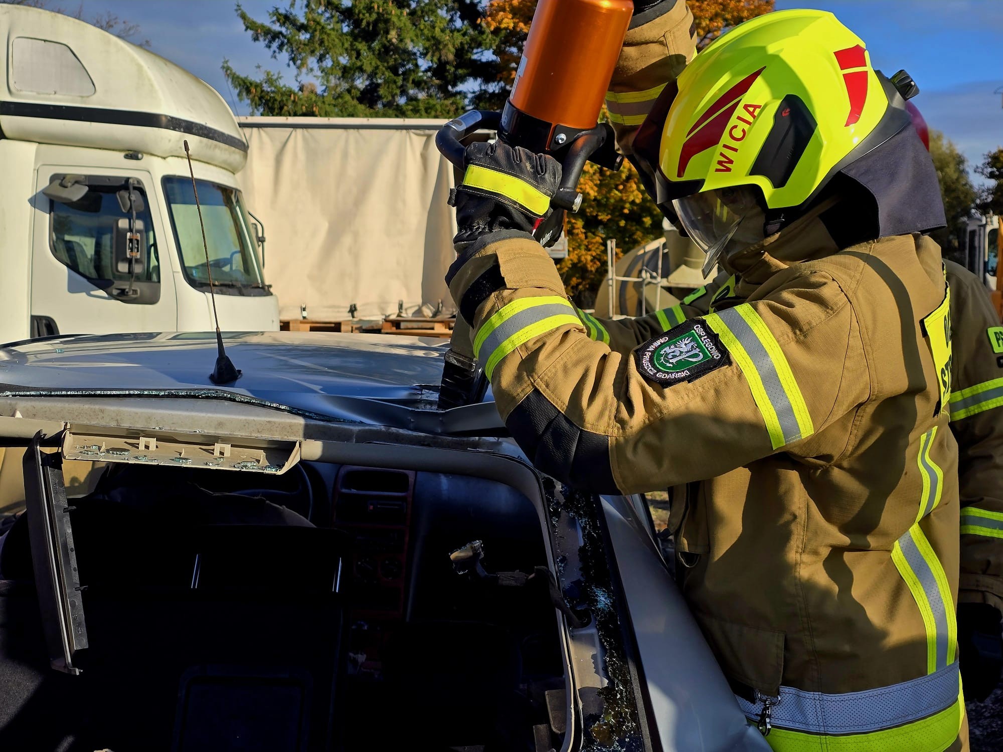 A dzisiaj spędzili prawie cały dzień z ratownictwem technicznym. Uczestnicy szkolenia wyposażeni w specjalistyczne narzędzia do cięcia, podnoszenia, odginania elementów utrudniajacych dostęp uczyli się skomplikowanych działań uwalniania osób poszkodowanych z samochodów zniszczonych w wyniku wypadków drogowych. To bardzo ważny aspekt pracy strażaków PSP i OSP, niejednokrotnie ratujący zdrowie i życie.
