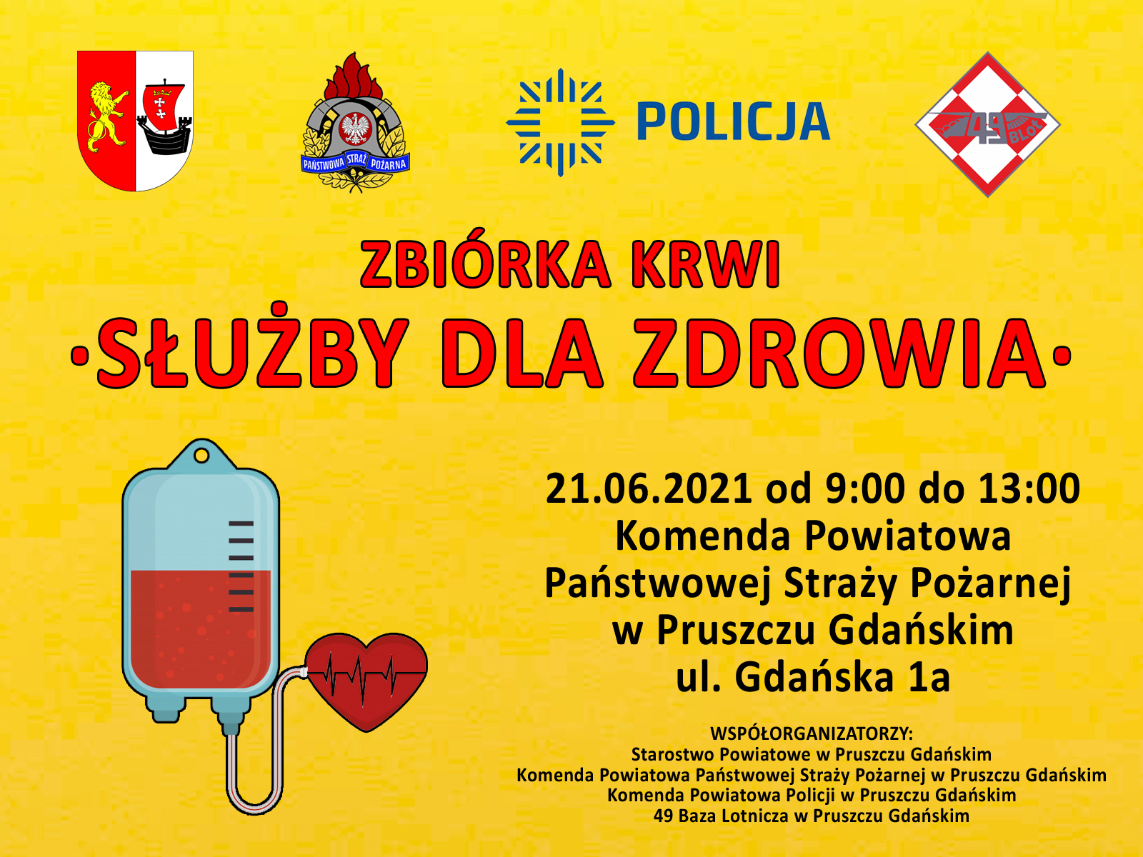 W poniedziałek 21 czerwca 2021 r. odbędzie się akcja zbiórki krwi pod hasłem „SŁUŻBY DLA ZDROWIA”, skierowana do wszystkich pełnoletnich osób z rejonu Powiatu Gdańskiego i nie tylko. Rozpoczęcie akcji od godziny 9.00 i zakończenie około 13.00 na terenie Komendy Powiatowej Państwowej Straży Pożarnej w Pruszczu Gdańskim – wejście bramą od ulicy Krótkiej (możliwość parkowania samochodu na parkingu przy Komendzie).