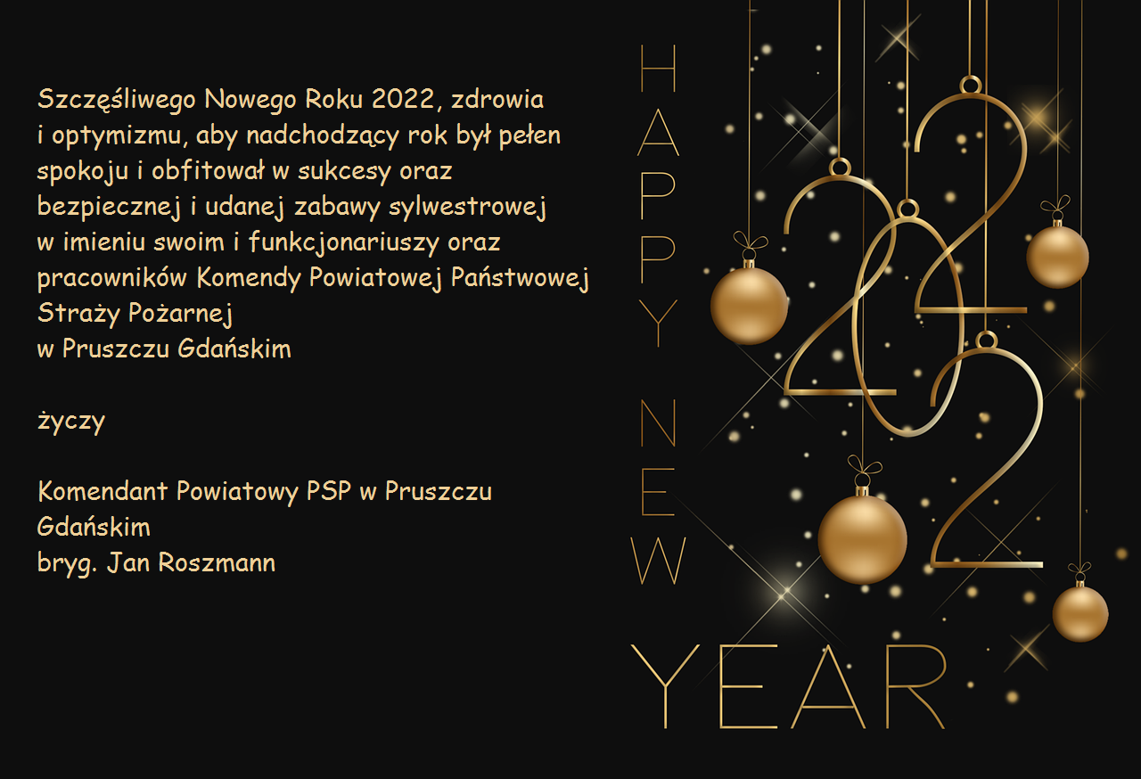 Szczęśliwego Nowego Roku 2022, zdrowia i optymizmu, aby nadchodzący rok był pełen spokoju i obfitował w sukcesy oraz bezpiecznej i udanej zabawy sylwestrowej w imieniu swoim i funkcjonariuszy oraz pracowników Komendy Powiatowej Państwowej Straży Pożarnej w Pruszczu Gdańskim życzy Komendant Powiatowy PSP w Pruszczu Gdańskim bryg. Jan Roszmann