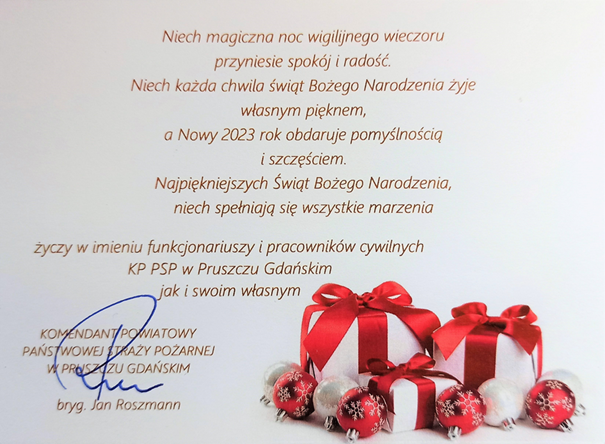 ŻYCZENIA ŚWIĄTECZNO-NOWOROCZNE KOMENDANTA POWIATOWEGO PSP W PRUSZCZU GDAŃSKIM