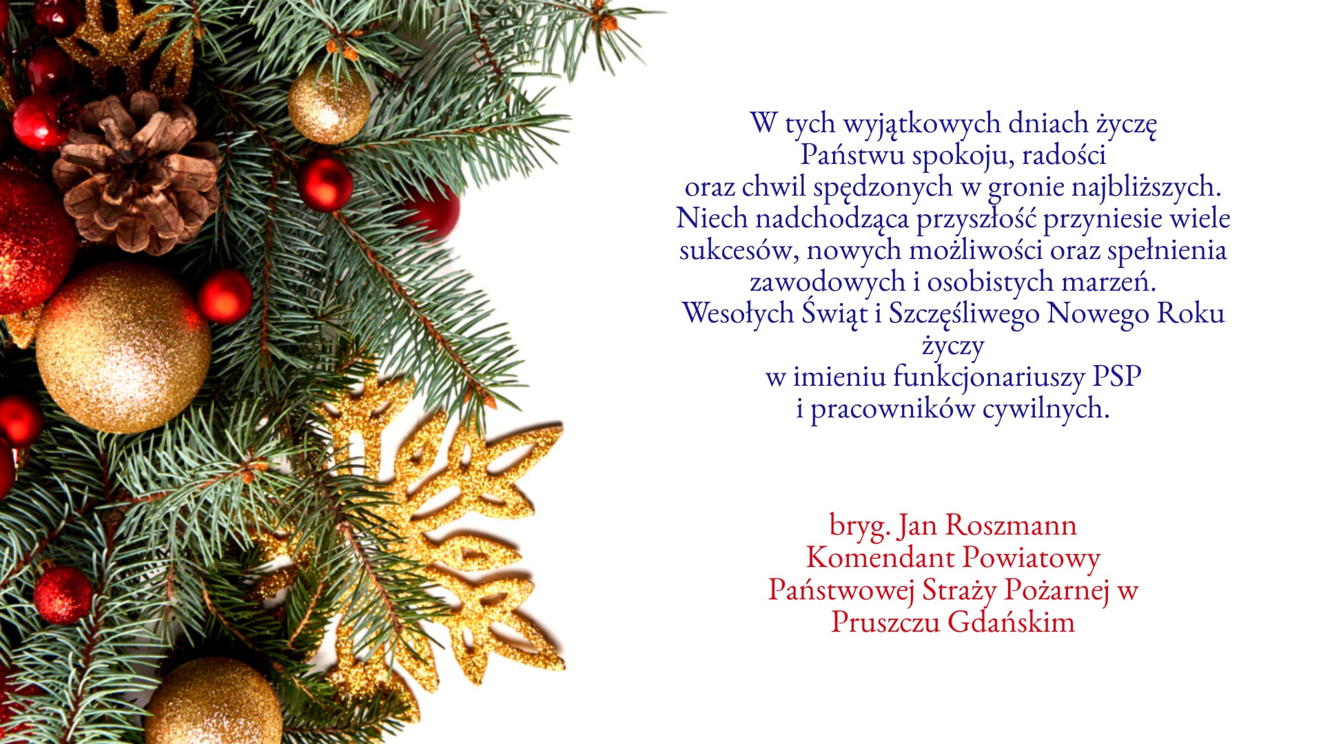 ŻYCZENIA ŚWIĄTECZNO-NOWOROCZNE KOMENDANTA POWIATOWEGO PSP W PRUSZCZU GDAŃSKIM 21.12.2023 Zdjęcia (1) Pokaż zdjęcie 1 z galerii.
