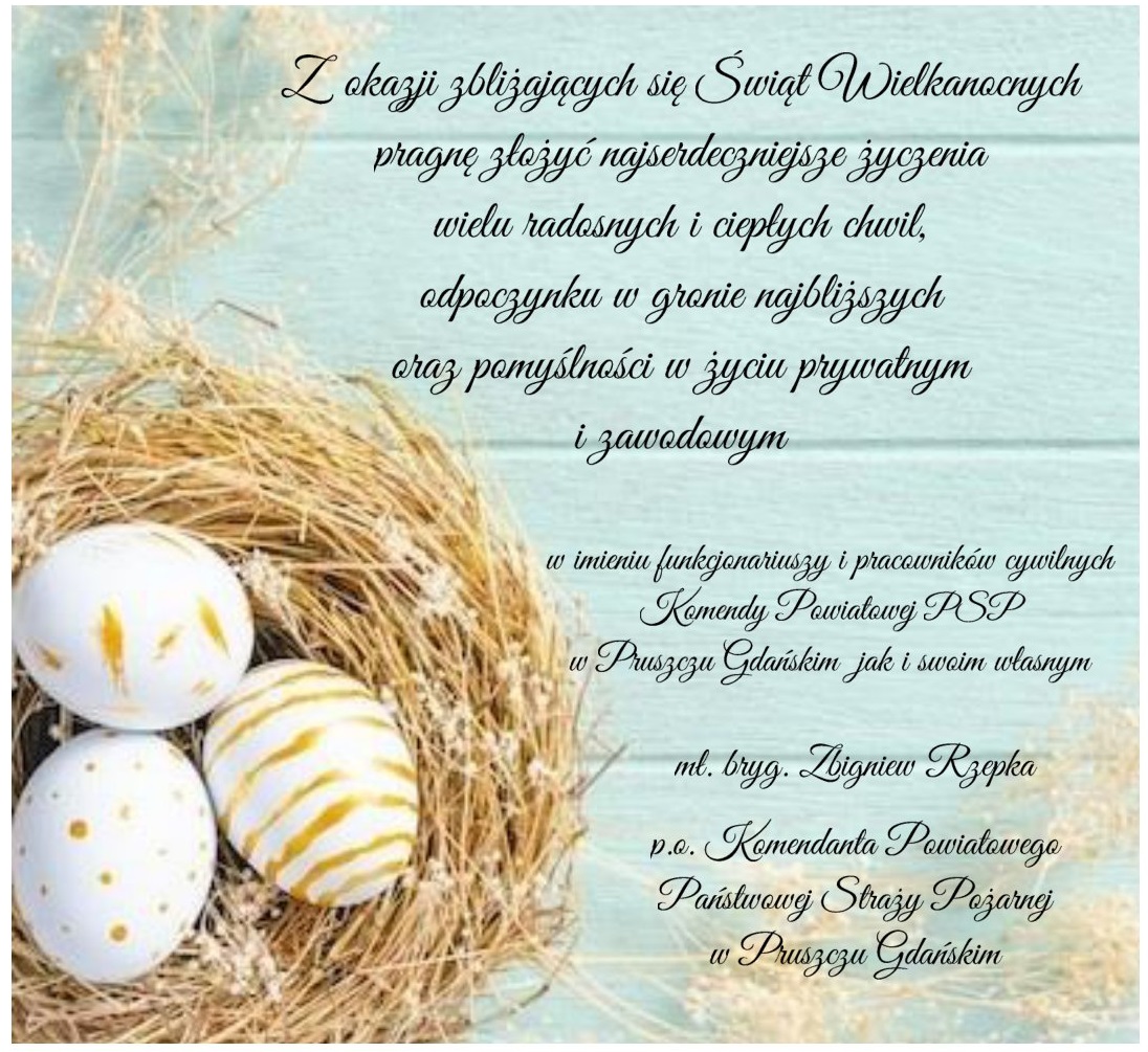 ŻYCZENIA WIELKANOCNE P. O. KOMENDANTA POWIATOWEGO PSP W PRUSZCZU GDAŃSKIM 30.03.2024 Zdjęcia (1) Pokaż zdjęcie 1 z galerii.
