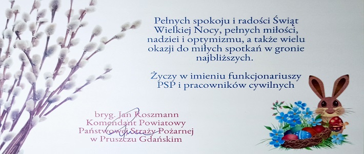 ŻYCZENIA WIELKANOCNE KOMENDANTA POWIATOWEGO PSP W PRUSZCZU GDAŃSKIM 04.04.2023 Zdjęcia (1) Pokaż zdjęcie 1 z galerii.