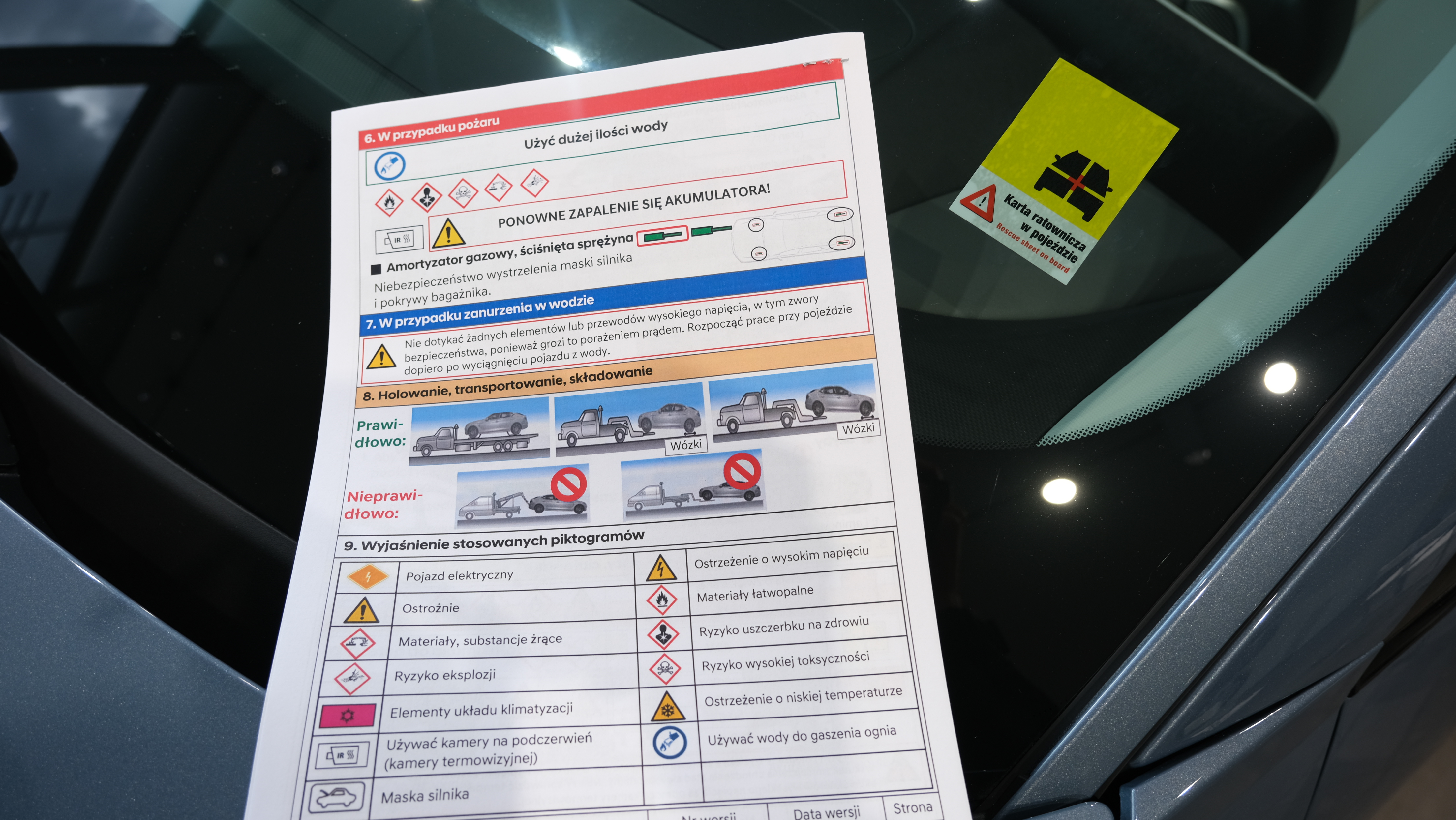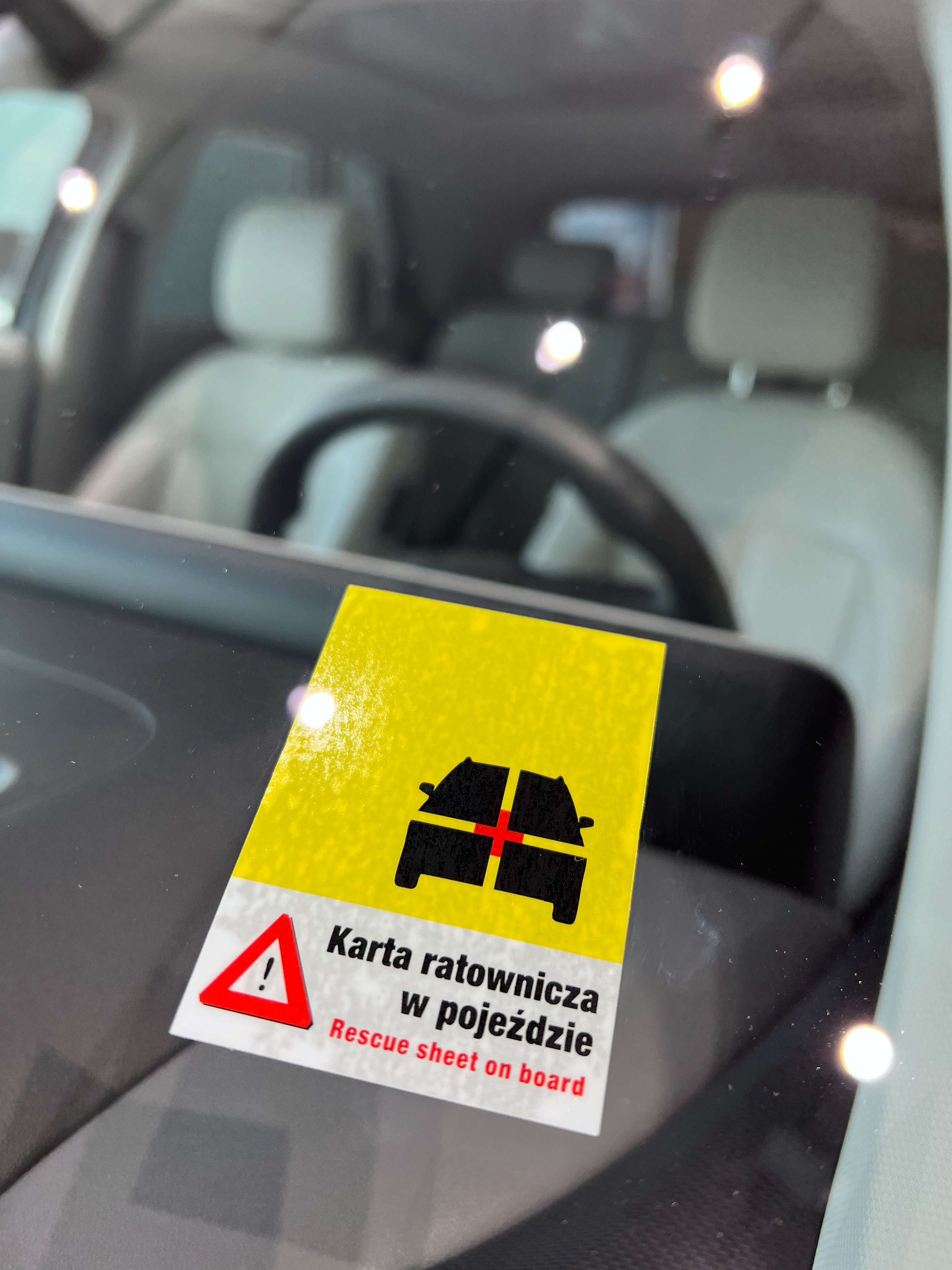Służba ratownicza musi wiedzieć, że w samochodzie znajduje się Karta Ratownicza. Temu służy umieszczenie na samochodzie specjalnej nalepki. Nalepkę informacyjną należy przykleić od wnętrza pojazdu w lewym dolnym rogu szyby przedniej (od strony kierowcy).