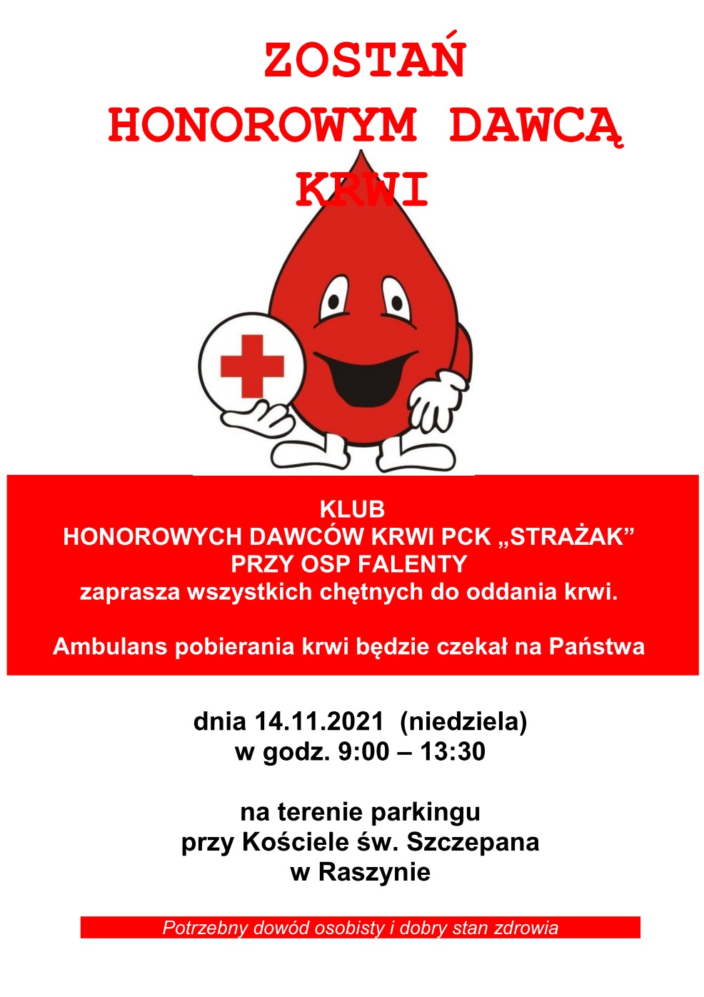 Klub Honorowych Dawców Krwi PCK "Strażak" przy OSP Falenty zaprasza wszystkich chętnych do oddania krwi.
