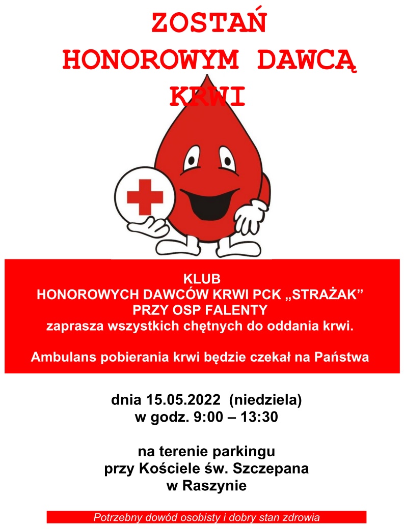 Klub Honorowych Dawców Krwi PCK "Strażak" przy OSP Falenty zaprasza wszystkich chętnych do oddania krwi.