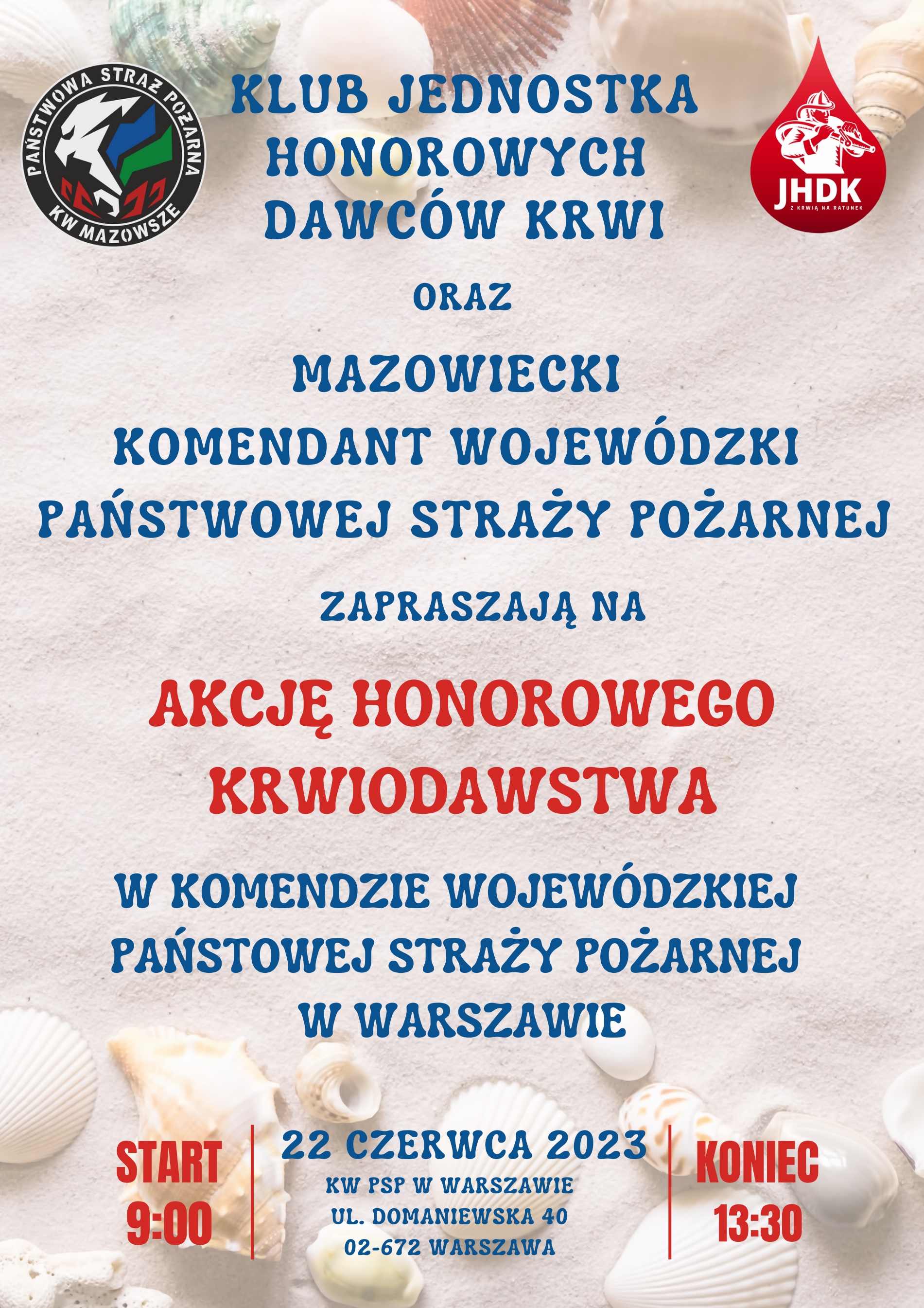 Mazowiecki Komendant Wojewódzki PSP nadbryg. Jarosław Piotrowski oraz Zarządu Klubu „Jednostka Honorowych Dawców Krwi” przy KW PSP w Warszawie serdecznie zapraszam na najbliższą akcję honorowego krwiodawstwa w KW PSP w Warszawie, która odbędzie się w dniu 22 czerwca br. w godz. 9:00 - 13:30.