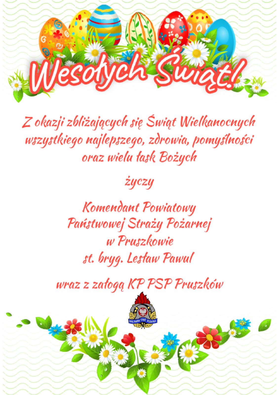 Życzenia Wielkanocne Komendanta Powiatowego PSP w Pruszkowie 15.04.2022 Zdjęcia (1) Pokaż zdjęcie 1 z galerii.