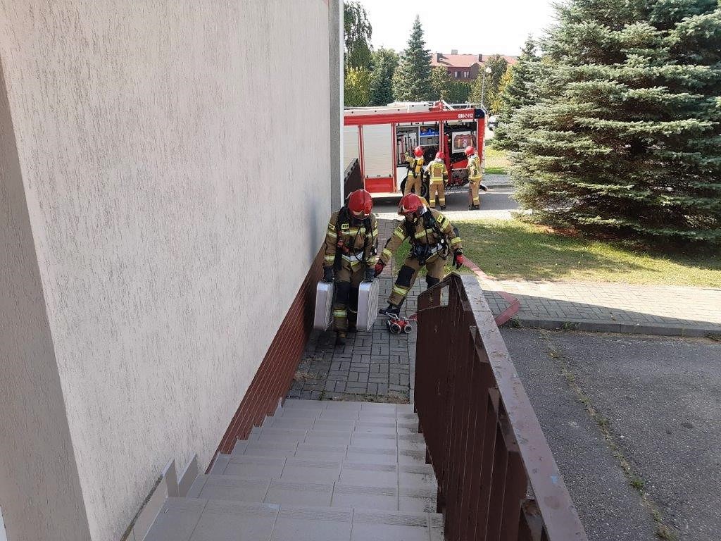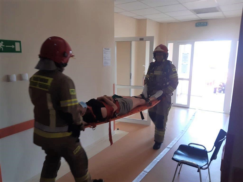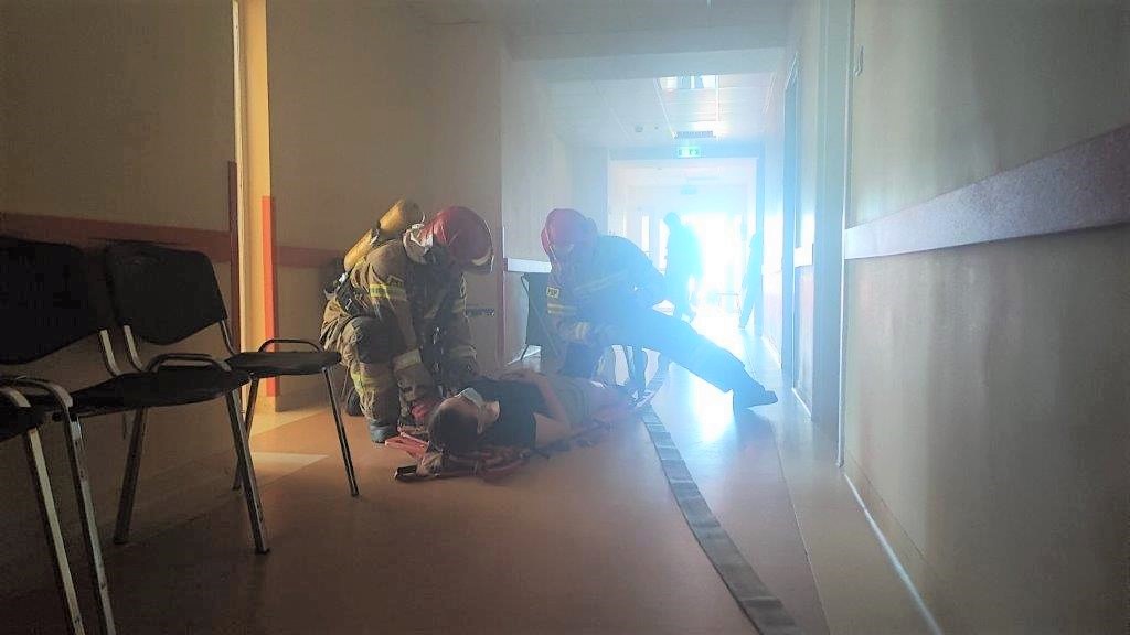 Strażacy przystąpili do akcji gaśniczej i przeszukali zadymione piętro w celu wykluczenia obecności osób poszkodowanych. W zadymionej strefie była jedna osoba poszkodowana, którą trzeba było ewakuować i udzielić jej kwalifikowanej pierwszej pomocy. Do symulowanego pożaru doszło na piętrze w pomieszczeniu zabiegowym w skutek zwarcia instalacji elektrycznej.