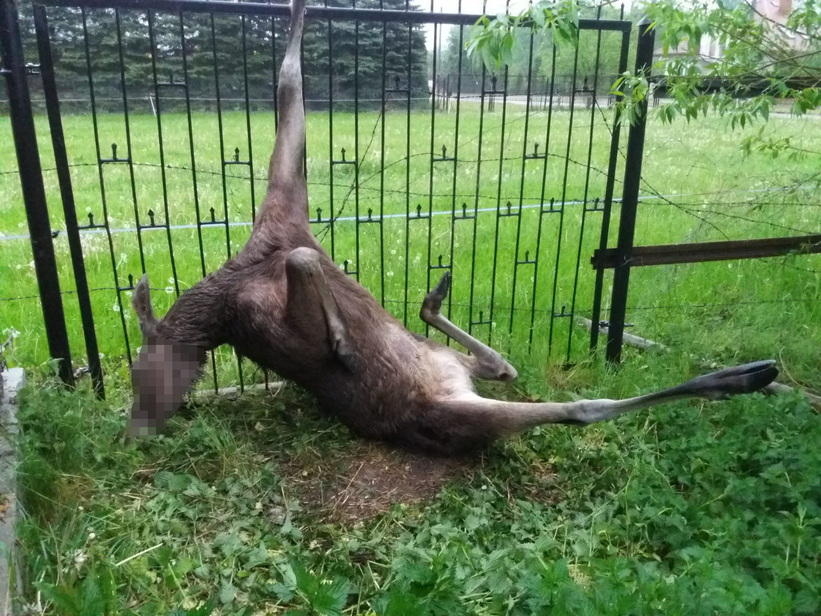 17 maja bieżącego roku około godz. 04:48 do Stanowiska Kierowania KP PSP w Przasnyszu wpłynęło zgłoszenie, że samica łosia zawisła na pręcie ogrodzenia za przednie lewe kopyto na niezamieszkałej posesji w Przasnyszu na ul. Leszczynowej.