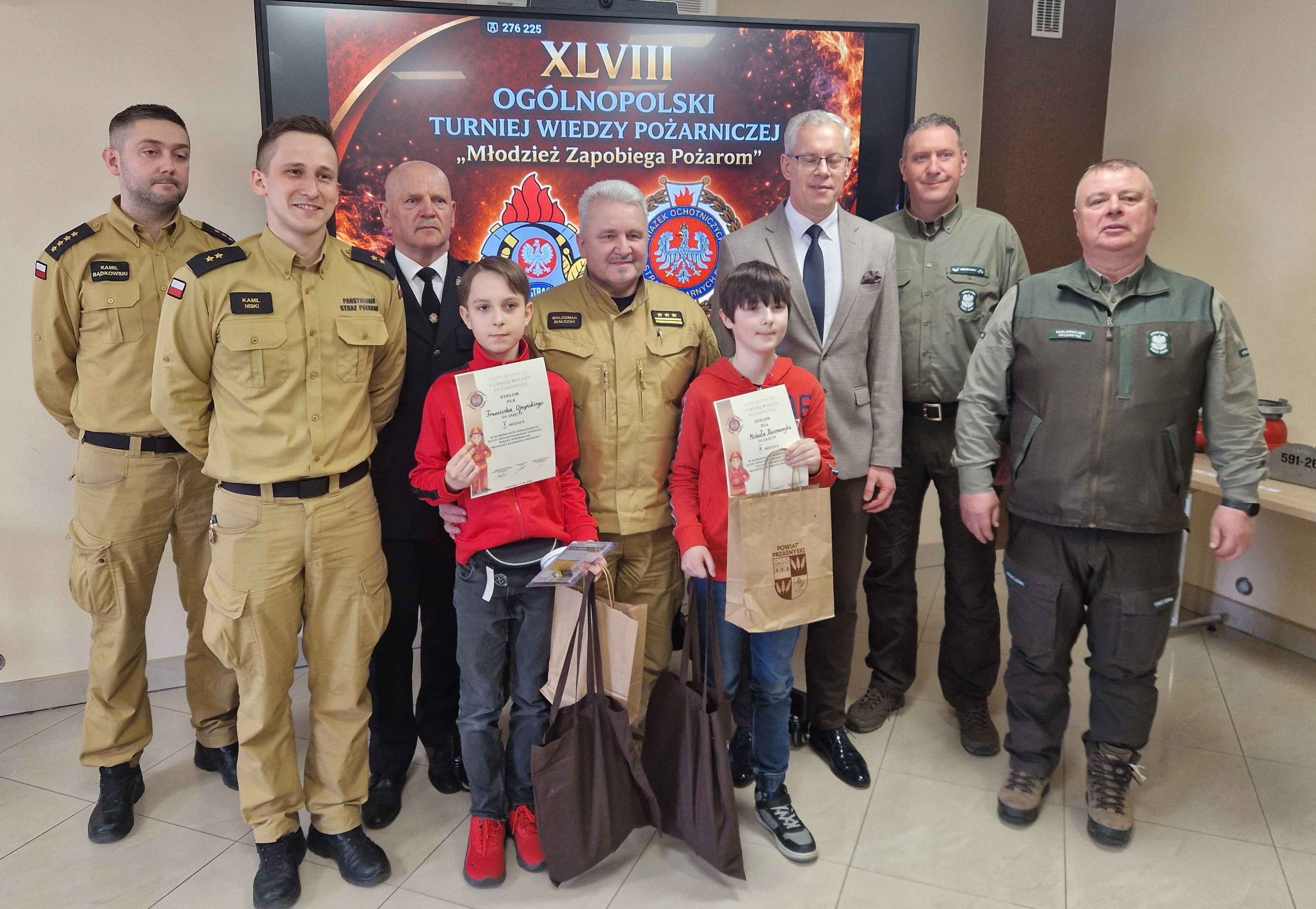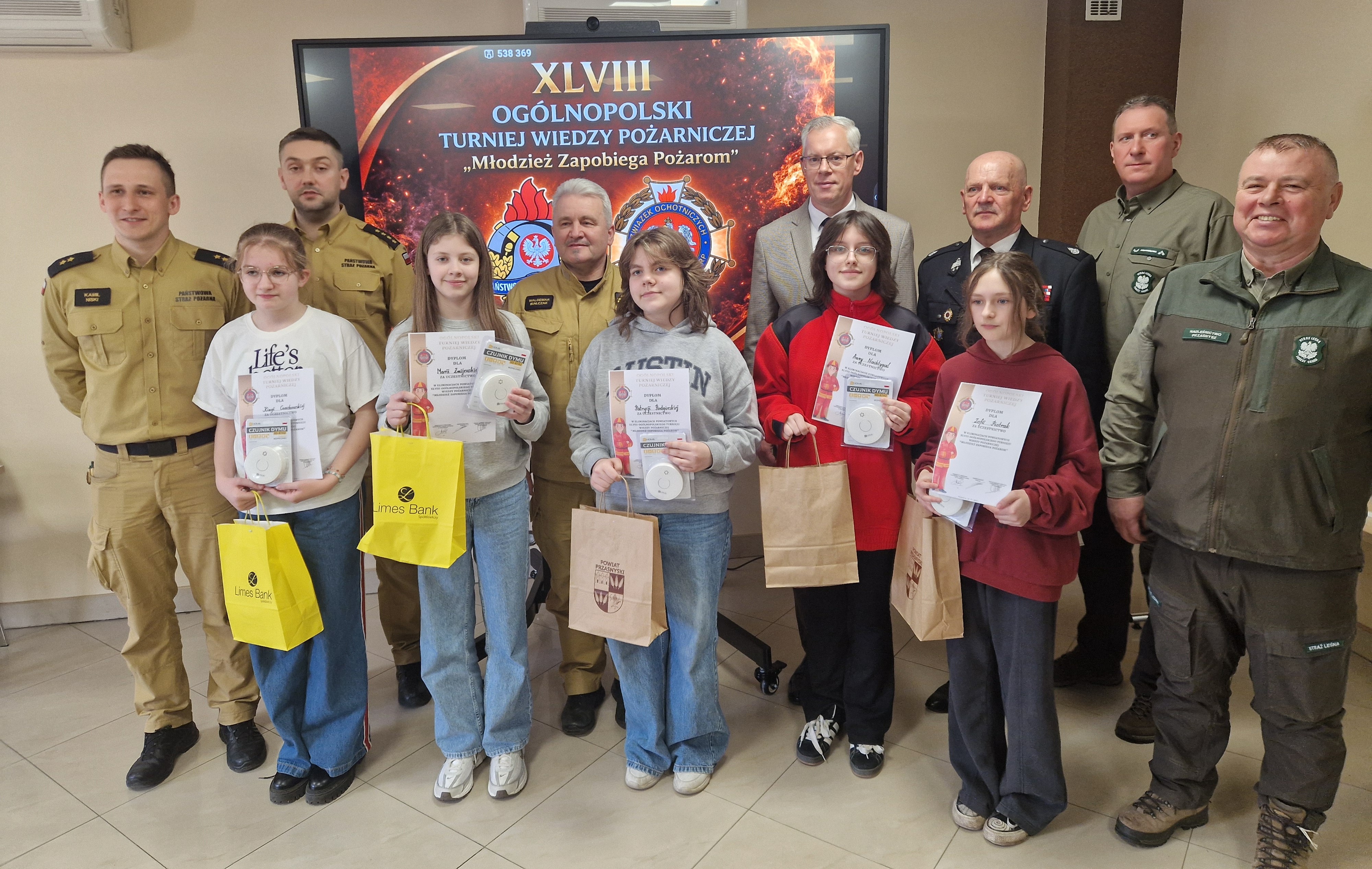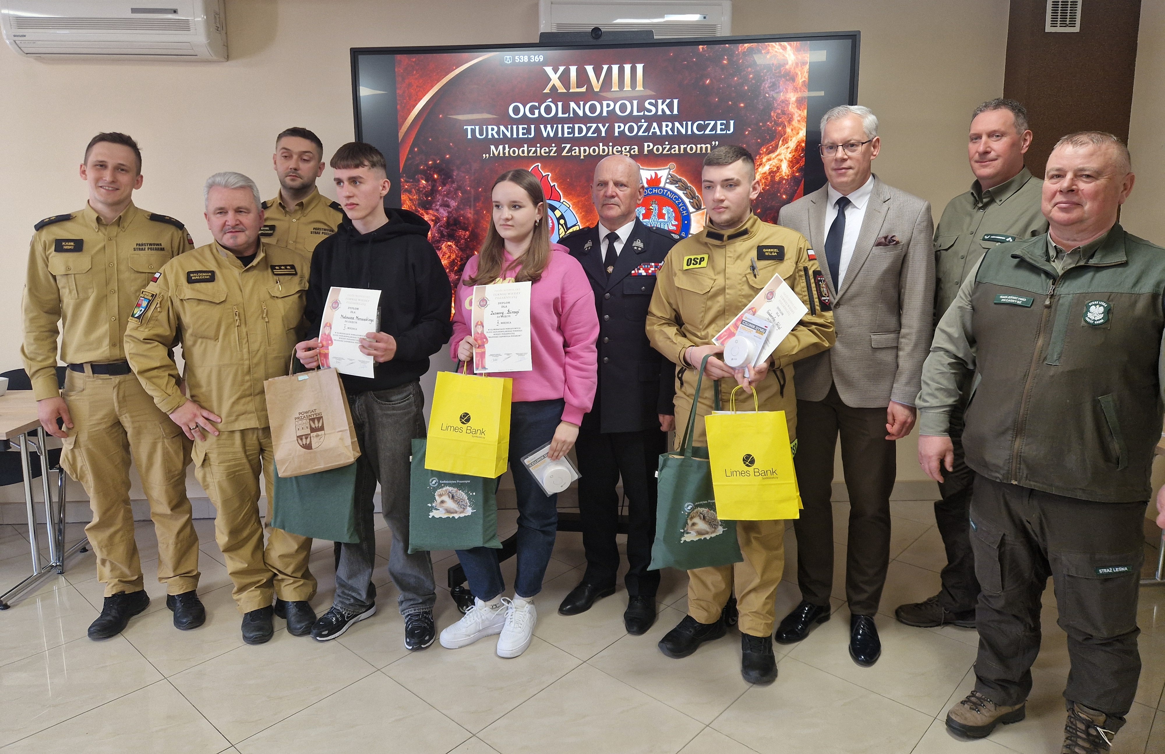 Patronat nad wydarzeniem objął Starosta Przasnyski. Dzięki wsparciu sponsorów – Starostwa Powiatowego, LIMES Bank Spółdzielczy w Chorzelach oraz Nadleśnictwa Przasnysz – konkurs był bogaty w nagrody. Wszyscy uczestnicy otrzymali dyplomy oraz upominki, które wręczyli: Wicestarosta Przasnyski Jarosław Szmulski, Prezes Zarządu Oddziału Powiatowego ZOSP RP w Przasnyszu dh. Bogdan Rzepczyński, Komendant Powiatowy PSP w Przasnyszu st. bryg. Waldemar Białczak oraz przedstawiciele Nadleśnictwa Przasnysz – Dariusz Sobotka i Paweł Reszko.