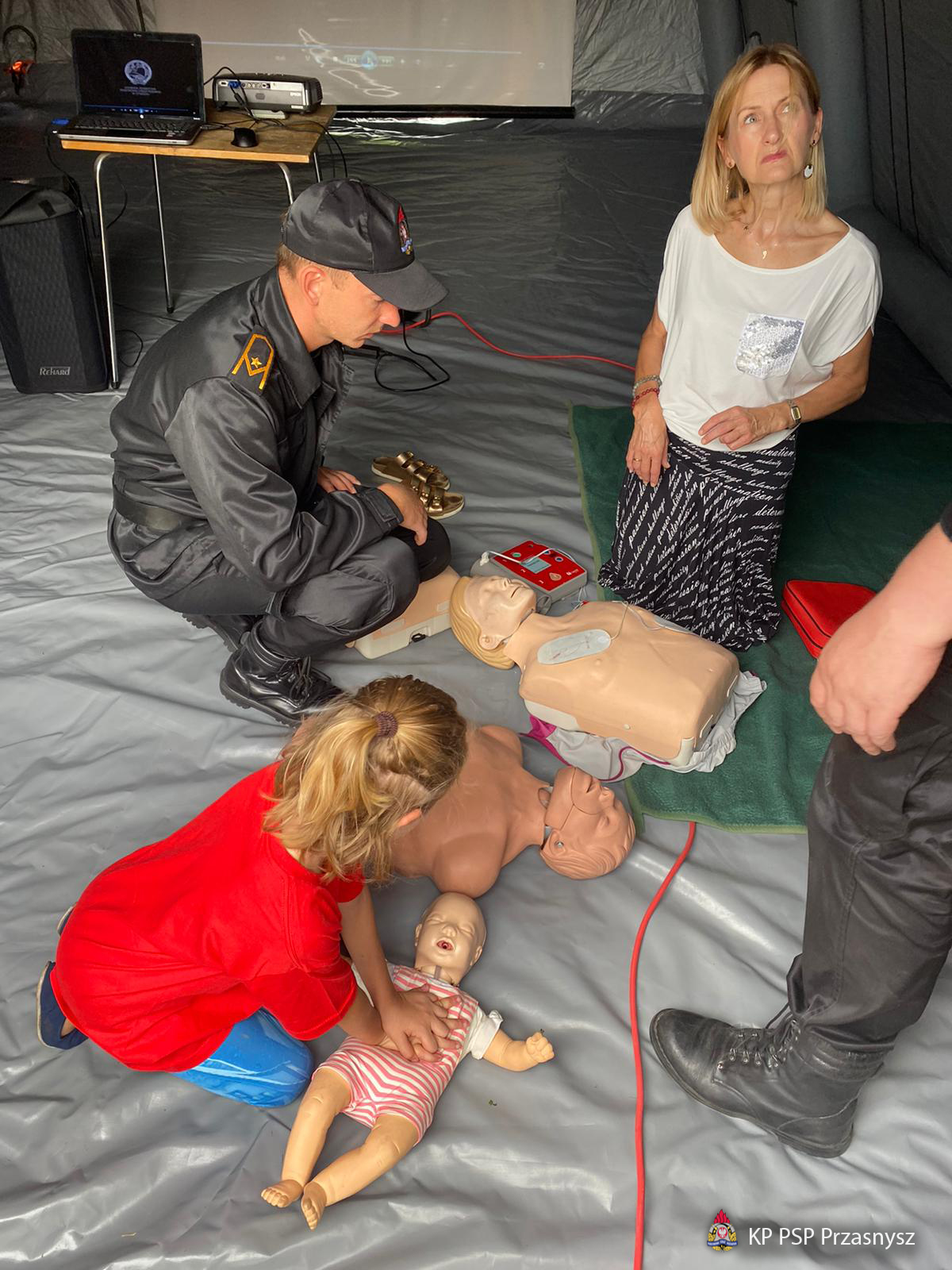 Dodatkowo strażacy instruowali zebranych jak udzielać pierwszej pomocy oraz prezentowali sprzęt specjalistyczny, który jest wykorzystywany podczas akcji ratowniczo-- gaśniczych.