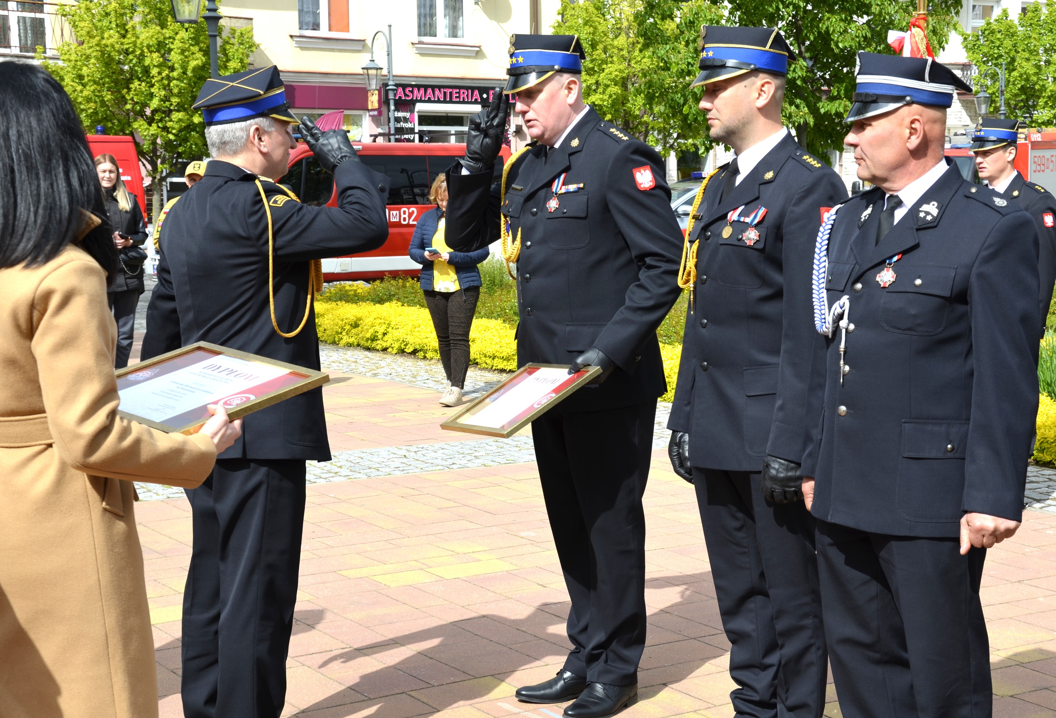 4 funkcjonariuszy. - Odznakami Świętego Floriana „Za Zasługi dla Społeczności Lokalnej” – 3 druhów OSP.