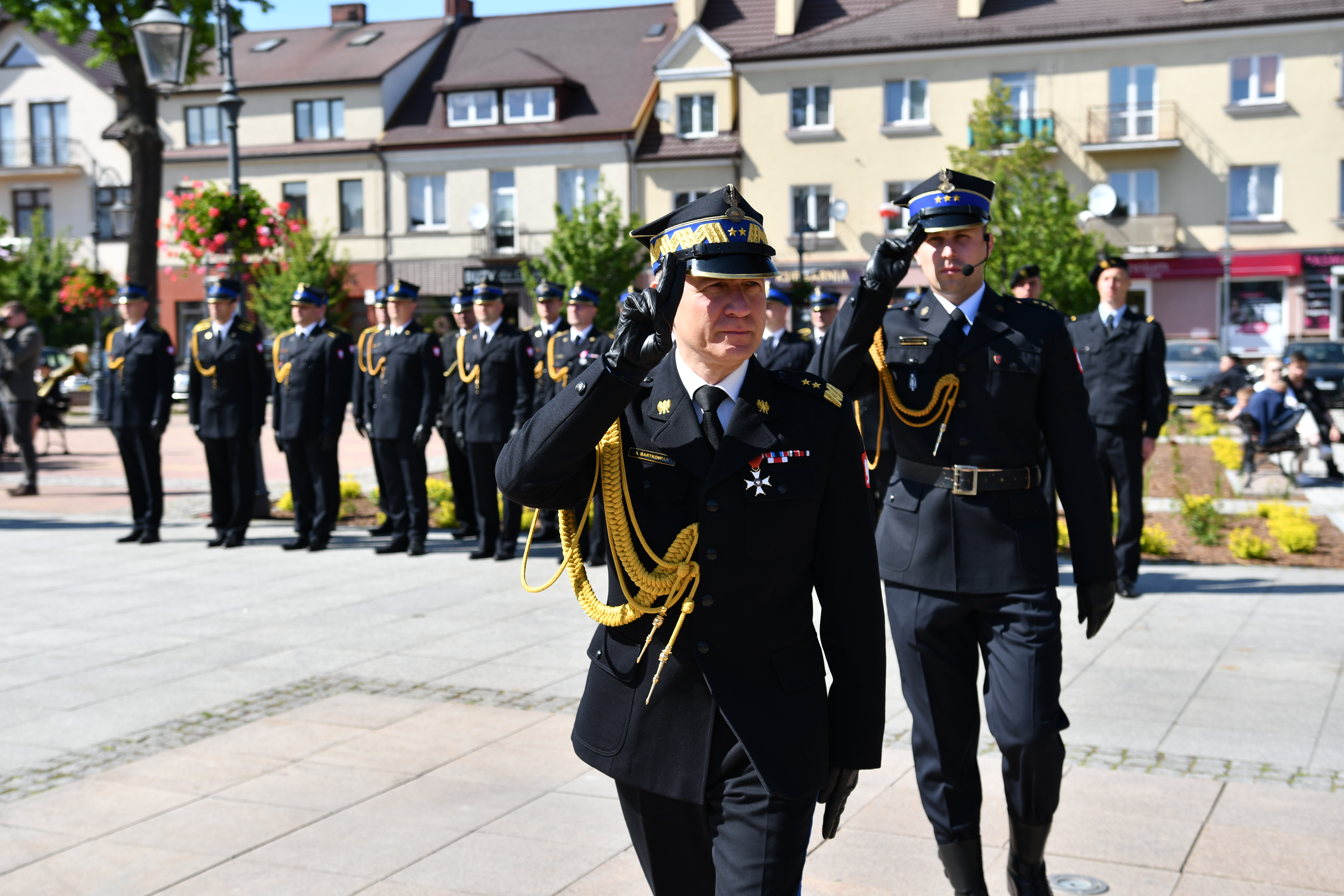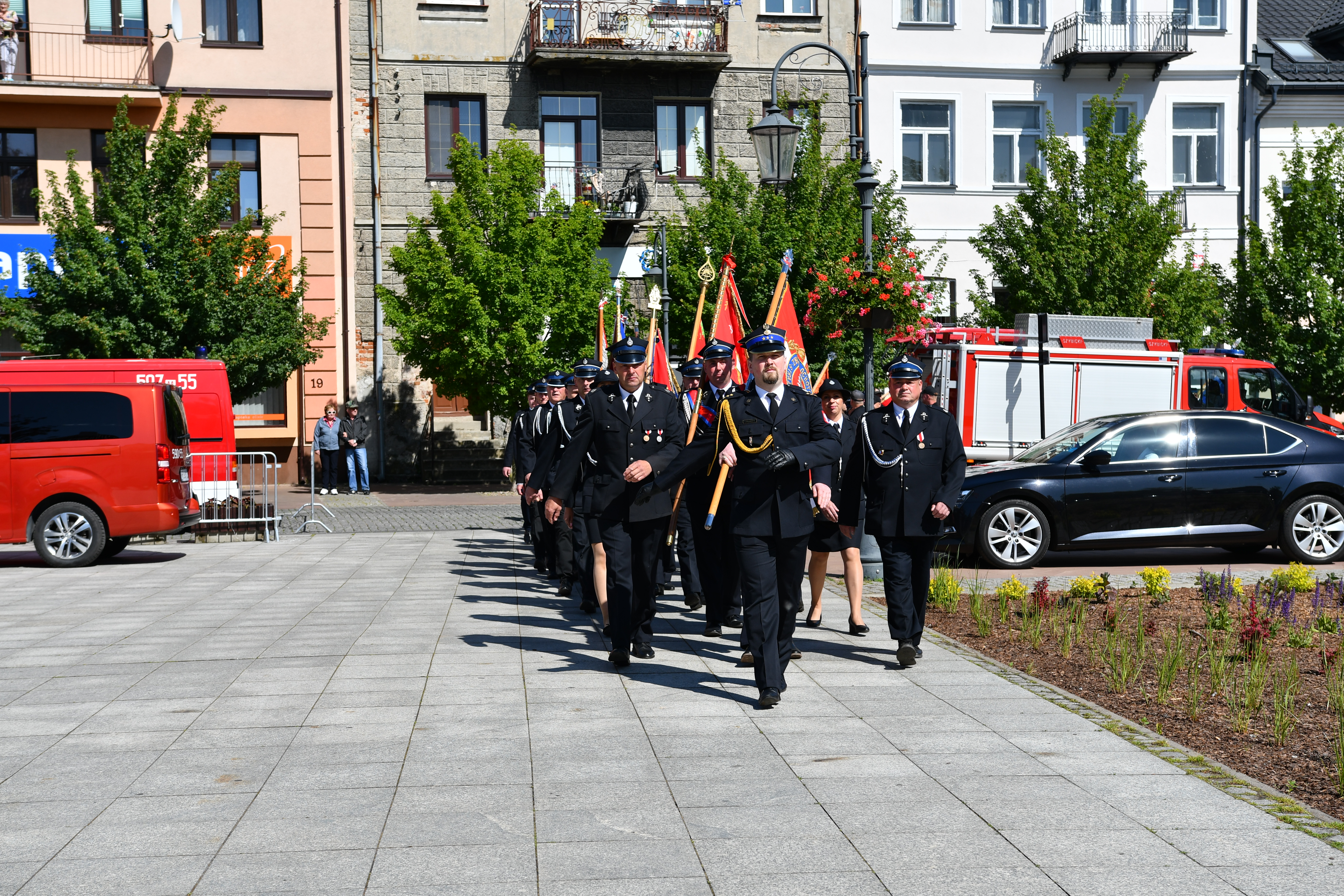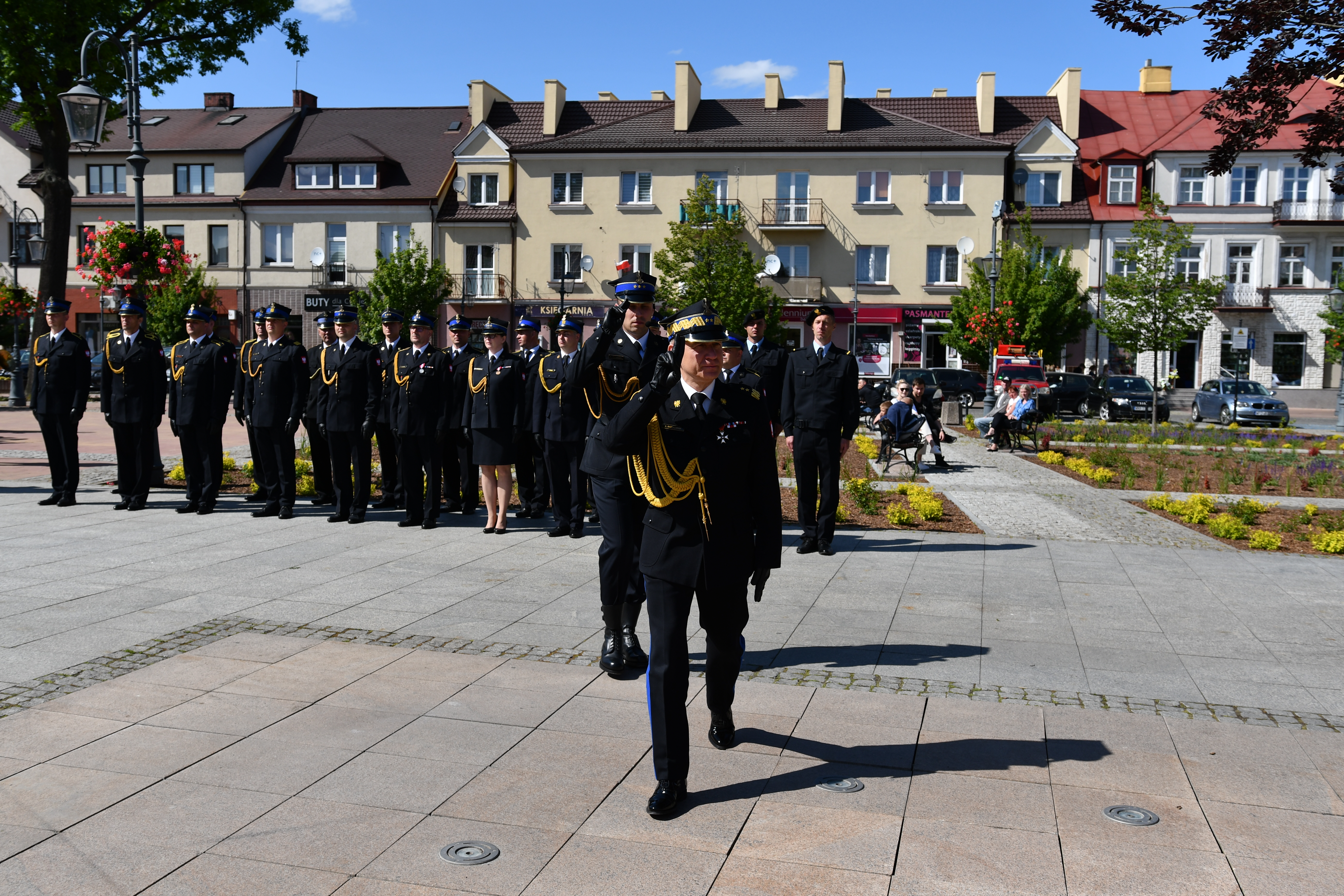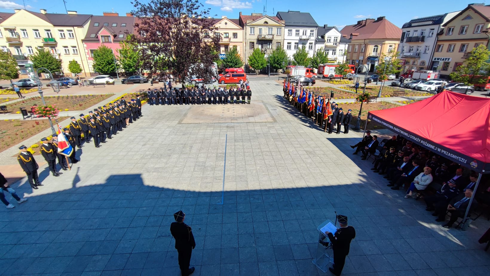 Po mszy nastąpił przemarsz pododdziałów na Rynek Miejski w Przasnyszu gdzie odbył się uroczysty apel, zapoczątkowany złożeniem meldunku przez dowódcę uroczystości kpt. Radosława Krzemińskiego Komendantowi Głównemu Państwowej Straży Pożarnej gen.bryg Andrzejowi Bartkowiakowi, który dokonał przeglądu pododdziałów i przywitał się z pocztami sztandarowymi. Następnie podniesiono flagę państwową i odegrano Mazurek Dąbrowskiego-Hymn Polski.