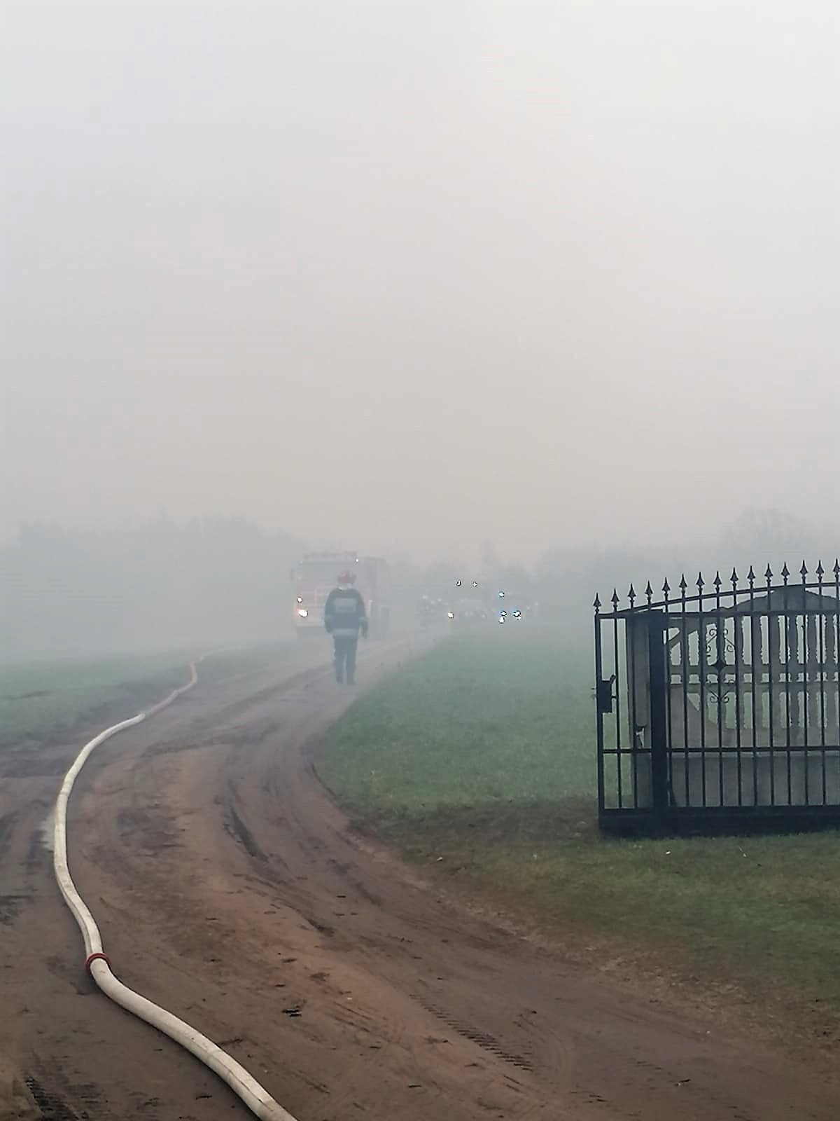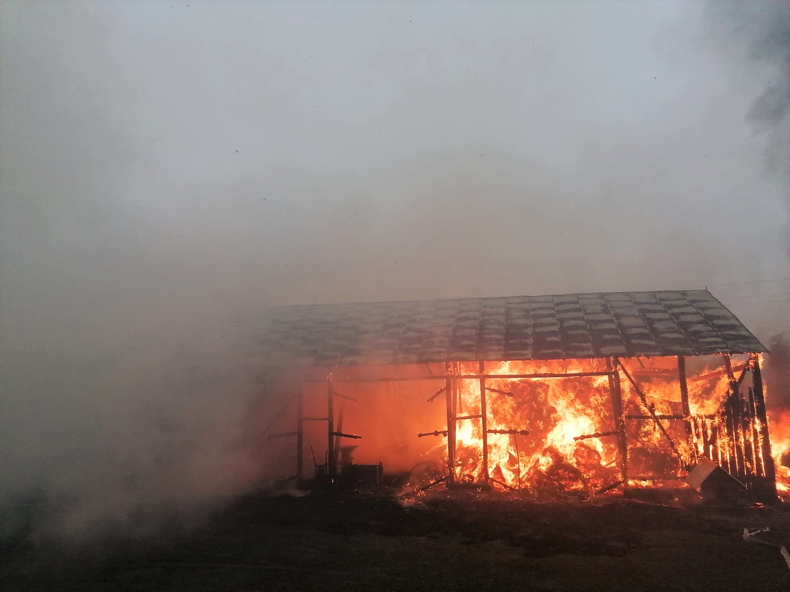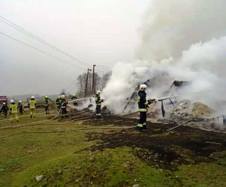 Po przybyciu na miejsce zdarzenia straży pożarnej zastano drewnianą stodołę całkowicie objętą pożarem krytą blachą. Do budynku stodoły dostawiony był murowany garaż.