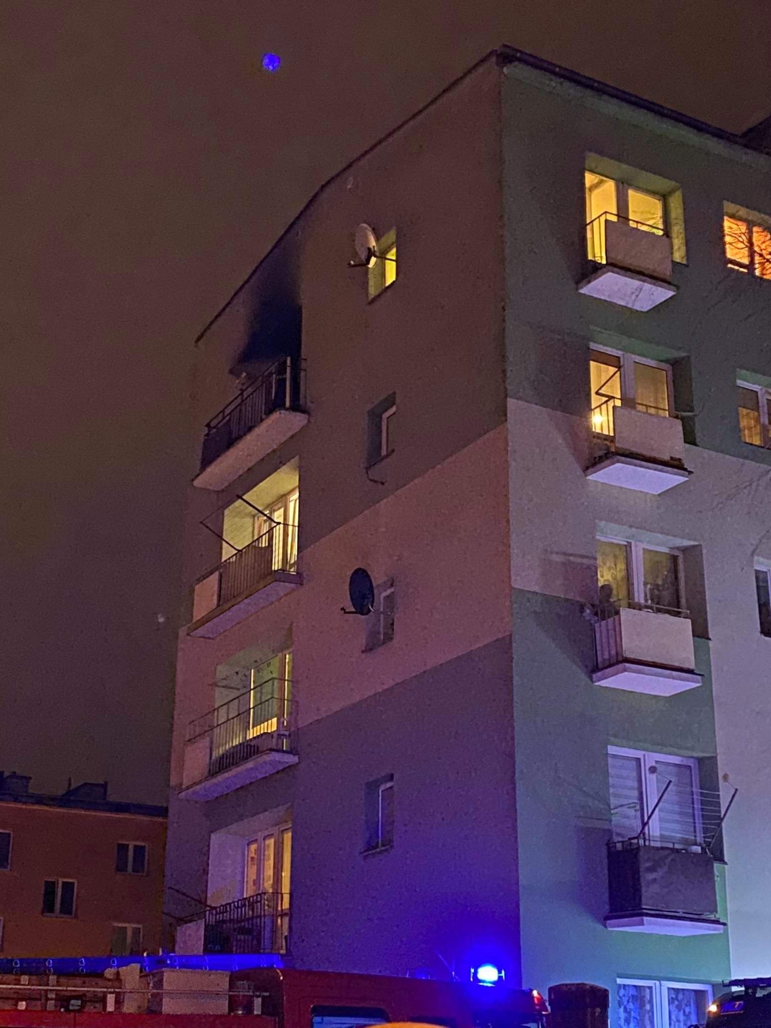 W dniu 28 lutego 2021 r. około godz. 23:00 do Stanowiska Kierowania Komendanta Powiatowego wpłynęło zgłoszenie o pożarze w mieszkaniu na 4 piętrze przy ul. Sosnowej 4 w Przasnyszu. Natychmiast na miejsce zdarzenia zadysponowano 5 zastępów straży pożarnej w tym specjalistyczny podnośnik.