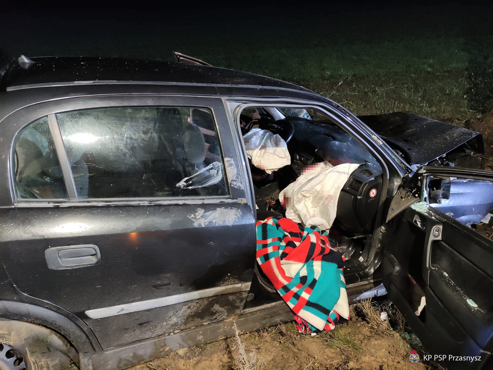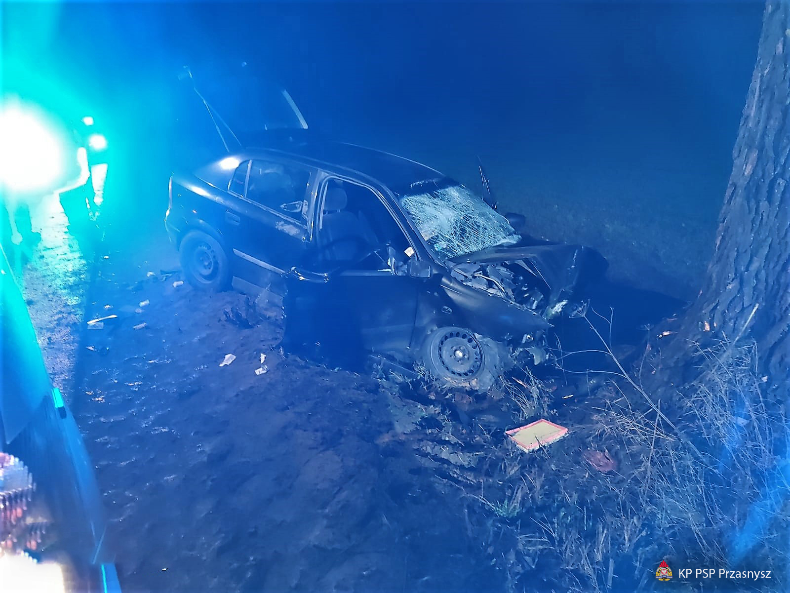 W chwili przybycia straży pożarnej, pojazd osobowy Opel Astra po uderzeniu w drzewo znajdował się w przydrożnym rowie. Wewnątrz auta znajdował się poszkodowany mężczyzna, któremu ZRM udzielał medycznych czynności ratunkowych.