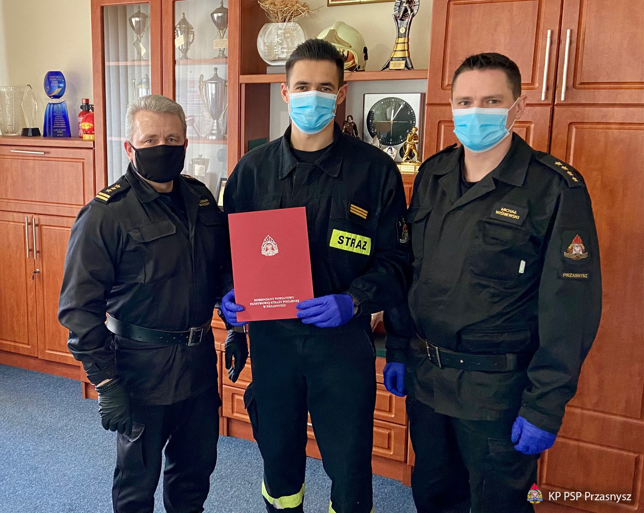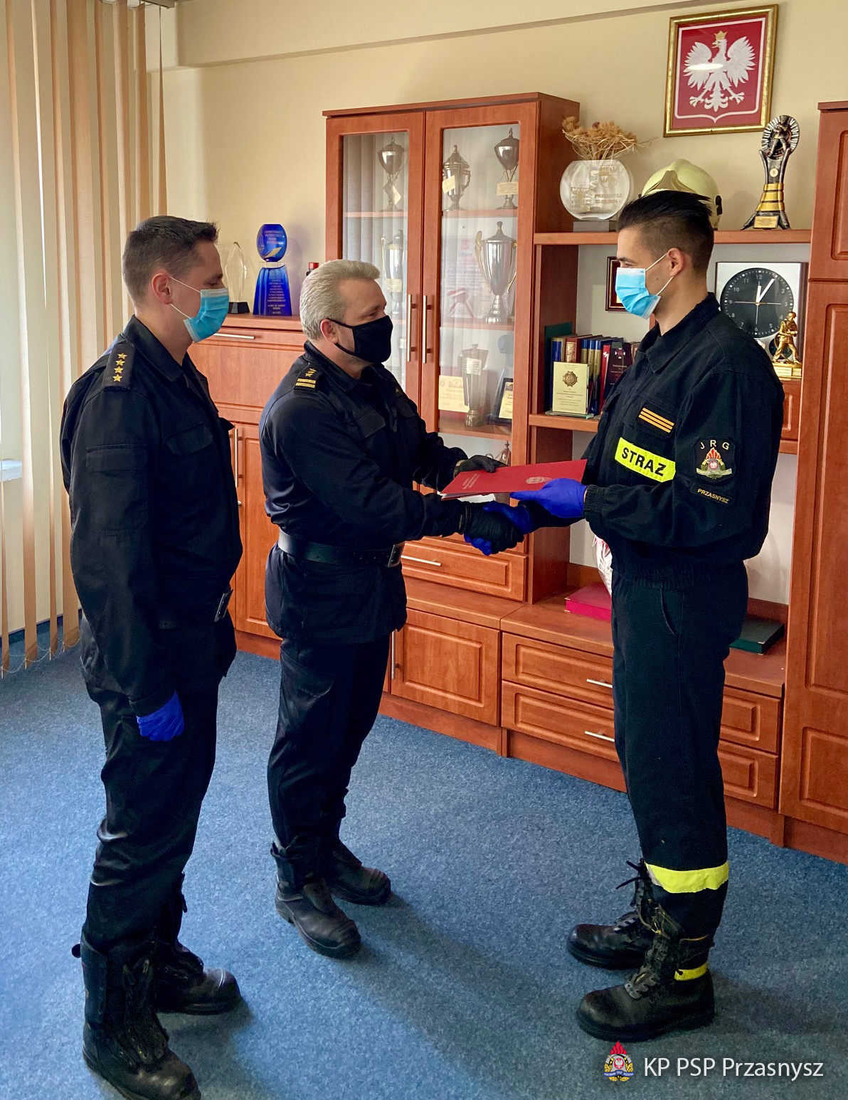 W dniu 19 marca 2021 r. Komendant Powiatowy PSP w Przasnyszu st.bryg. Waldemar Białczak w obecności Zastępcy Dowódcy Jednostki Ratowniczo-Gaśniczej st.kpt. Michała Wiśniewskiego wyróżnił jednego ze strażaków Jednostki Ratowniczo-Gaśniczej PSP w Przasnyszu za wzorową postawę i wykazaną odwagę podczas akcji ratowniczo-gaśniczej.