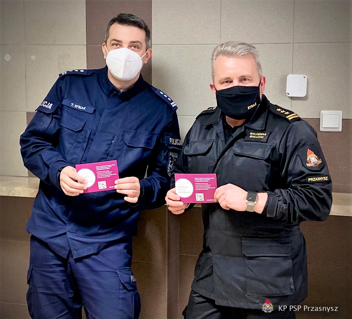 Komendant Powiatowy Państwowej Straży Pożarnej w Przasnyszu st.bryg. Waldemar Białczak oraz Komendant Powiatowy Policji insp. Tomasz Łysiak zapoczątkowali proces szczepień w przasnyskim szpitalu dla funkcjonariuszy służb mundurowych.