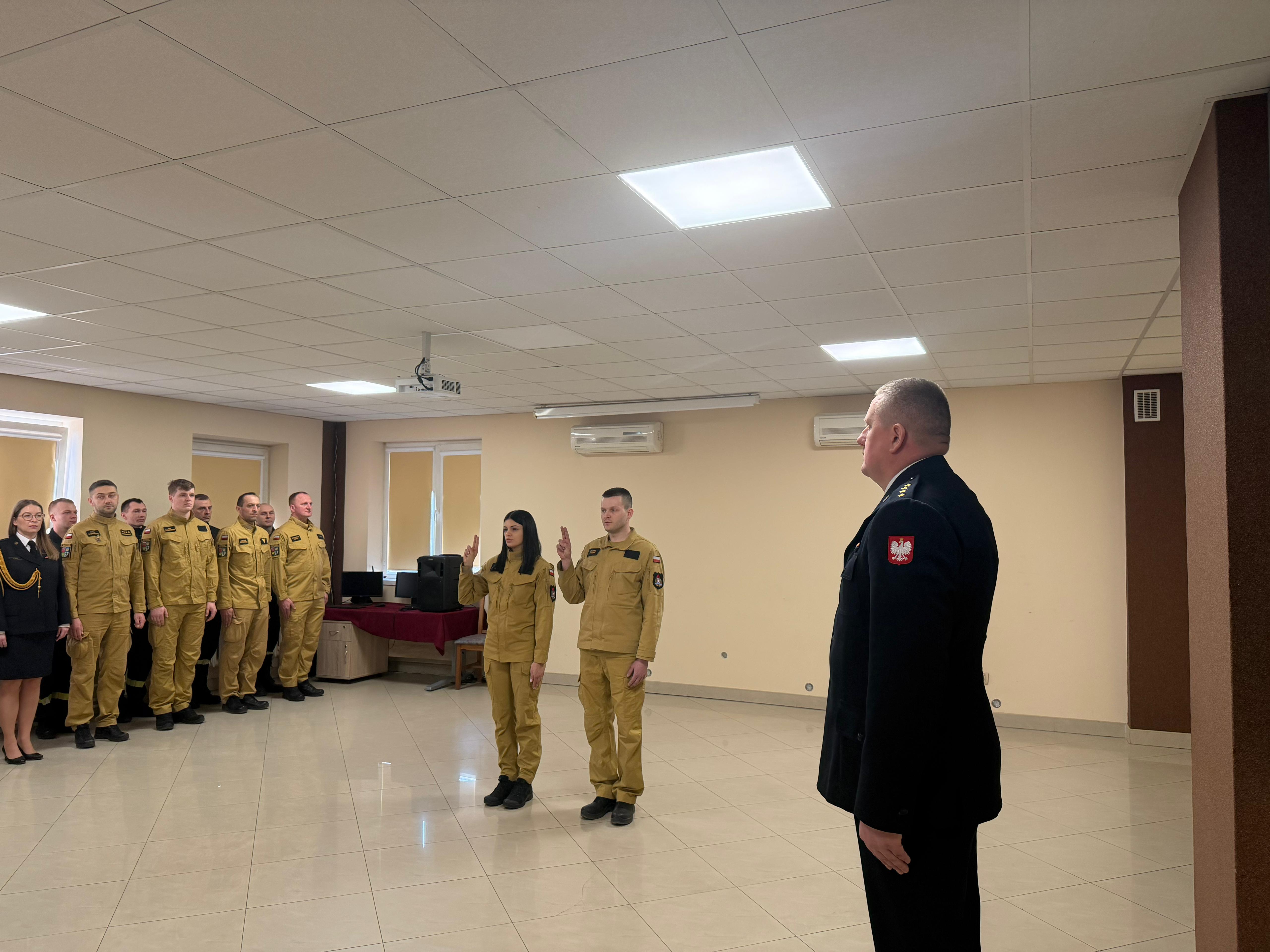 Rotę ślubowania przed Komendantem Powiatowym PSP w Przasnyszu wypowiedzieli str. Martyna Grabowska oraz str. Daniel Tański. Po złożeniu ślubowania i podpisaniu aktu ślubowania nowi strażacy usłyszeli słowa powitania w szeregach Państwowej Straży Pożarnej, oficjalnie rozpoczynając służbę w naszej formacji.