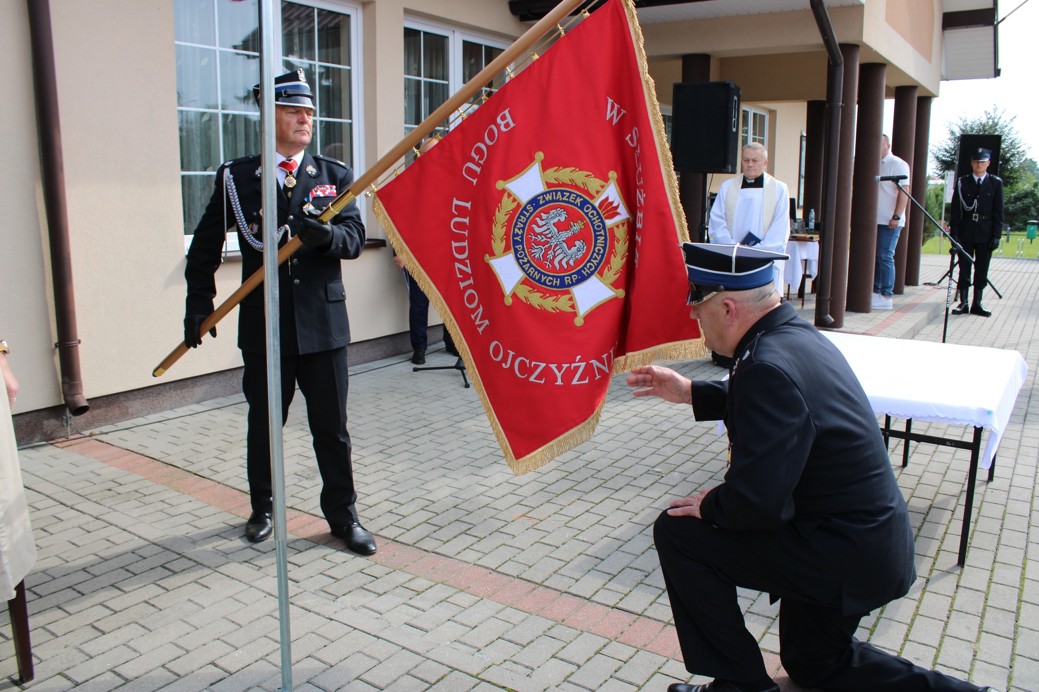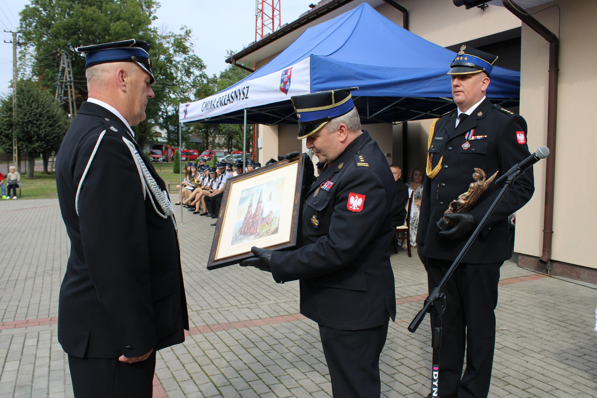 Przedstawiciele Komendy wystąpili również w imieniu Mazowieckiego Komendanta Wojewódzkiego Państwowej Straży Pożarnej, przekazując jednostce OSP Obrąb pamiątkowy obraz oraz statuetkę z okazji jubileuszu 100-lecia. Ich obecność podkreśliła wsparcie PSP dla jednostek OSP, ich znaczącą rolę w systemie bezpieczeństwa oraz szczególną wartość lokalnej służby na rzecz mieszkańców powiatu.