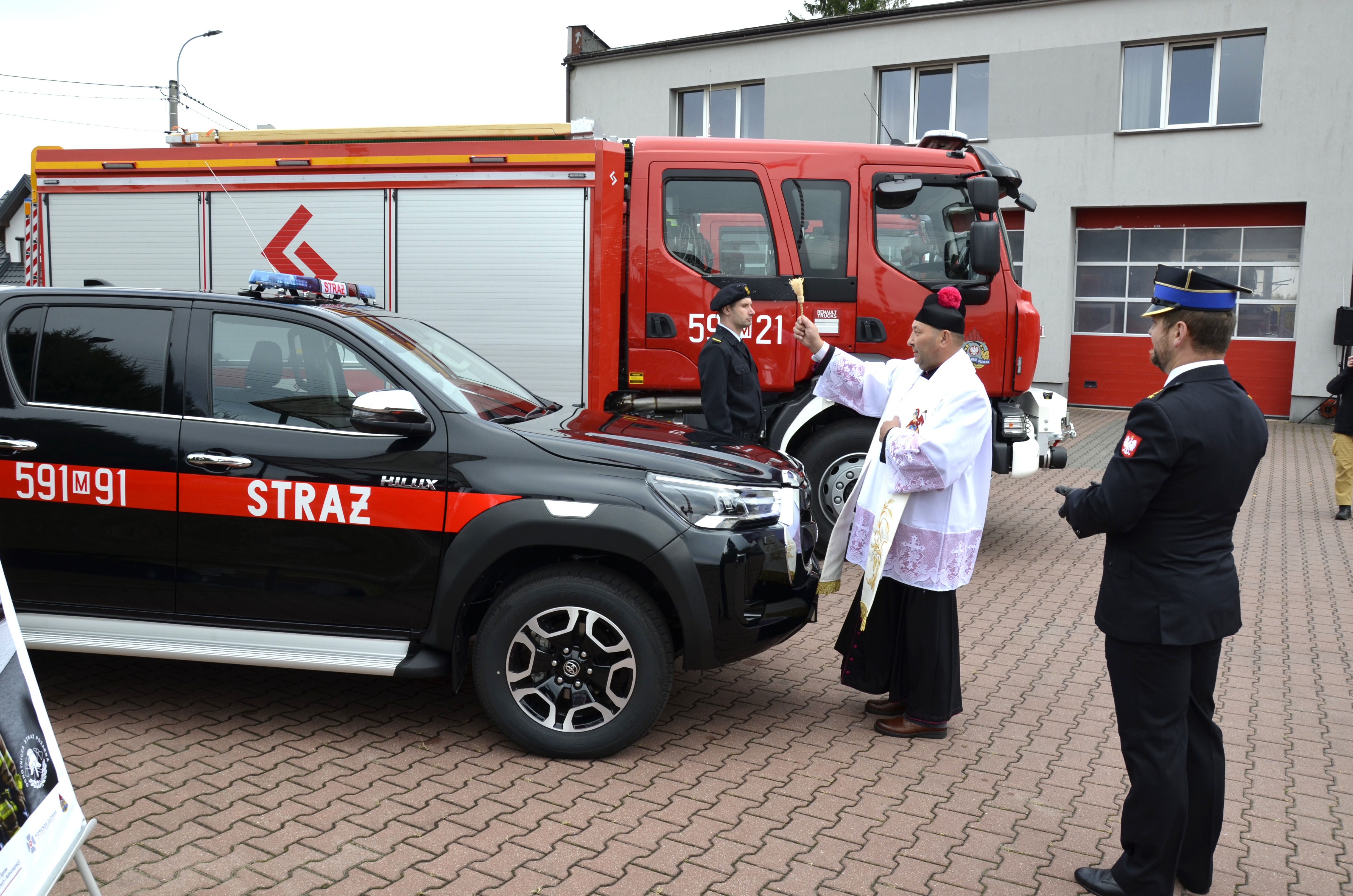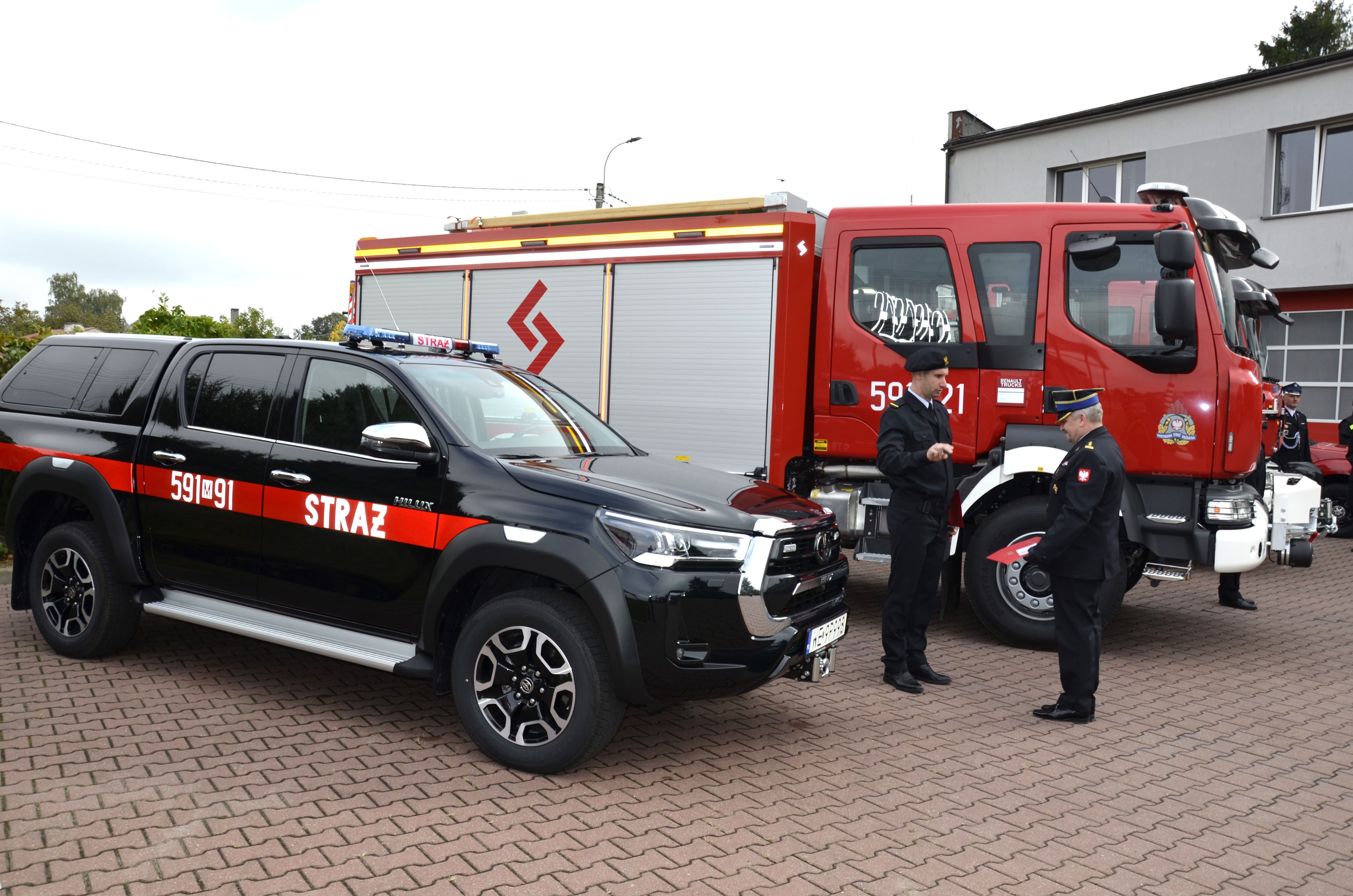 Lekki samochód rozpoznawczo- ratowniczy Toyota Hilux, który został sfinansowany ze środków powiatu przasnyskiego, Narodowego Funduszu Ochrony Środowiska i Gospodarki Wodnej, Wojewódzkiego Funduszu Ochrony Środowiska i Gospodarki Wodnej, Funduszu Ubezpieczeń będącego w dyspozycji Komendanta Głównego PSP. Koszt pojazdu to 270 tyś zł.