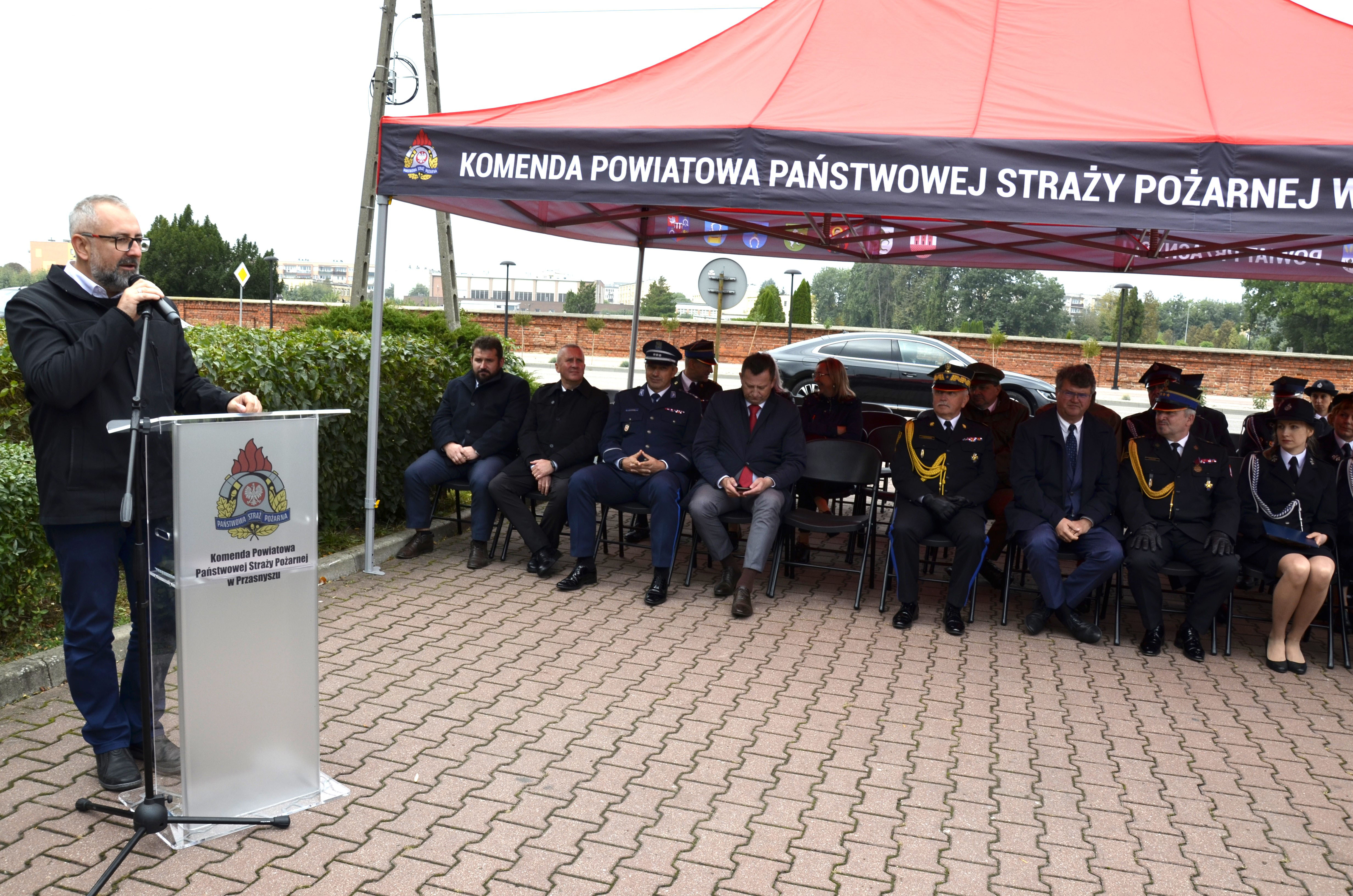 Po oficjalnym rozpoczęciu głos zabrał Komendant Powiatowy Państwowej Straży Pożarnej w Przasnyszu st.bryg. Waldemar Białczak, który przywitał zaproszonych gości i podziękował wszystkim zaangażowanym w pozyskanie nowych samochodów.