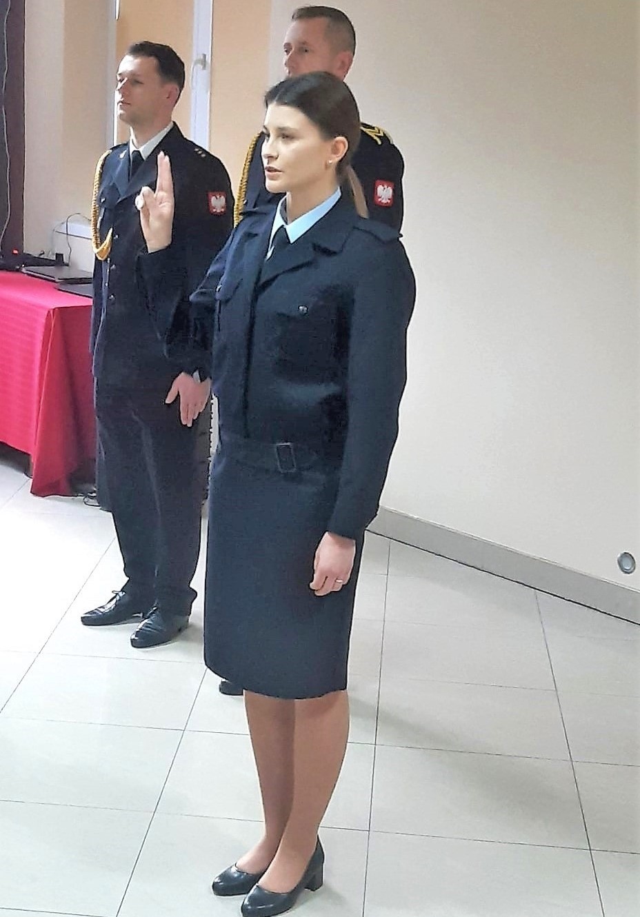 Po wypowiedzeniu słów roty str. Anna Ćwiek podpisała formularz aktu ślubowania, który przyjął i podpisał Komendant Powiatowy.