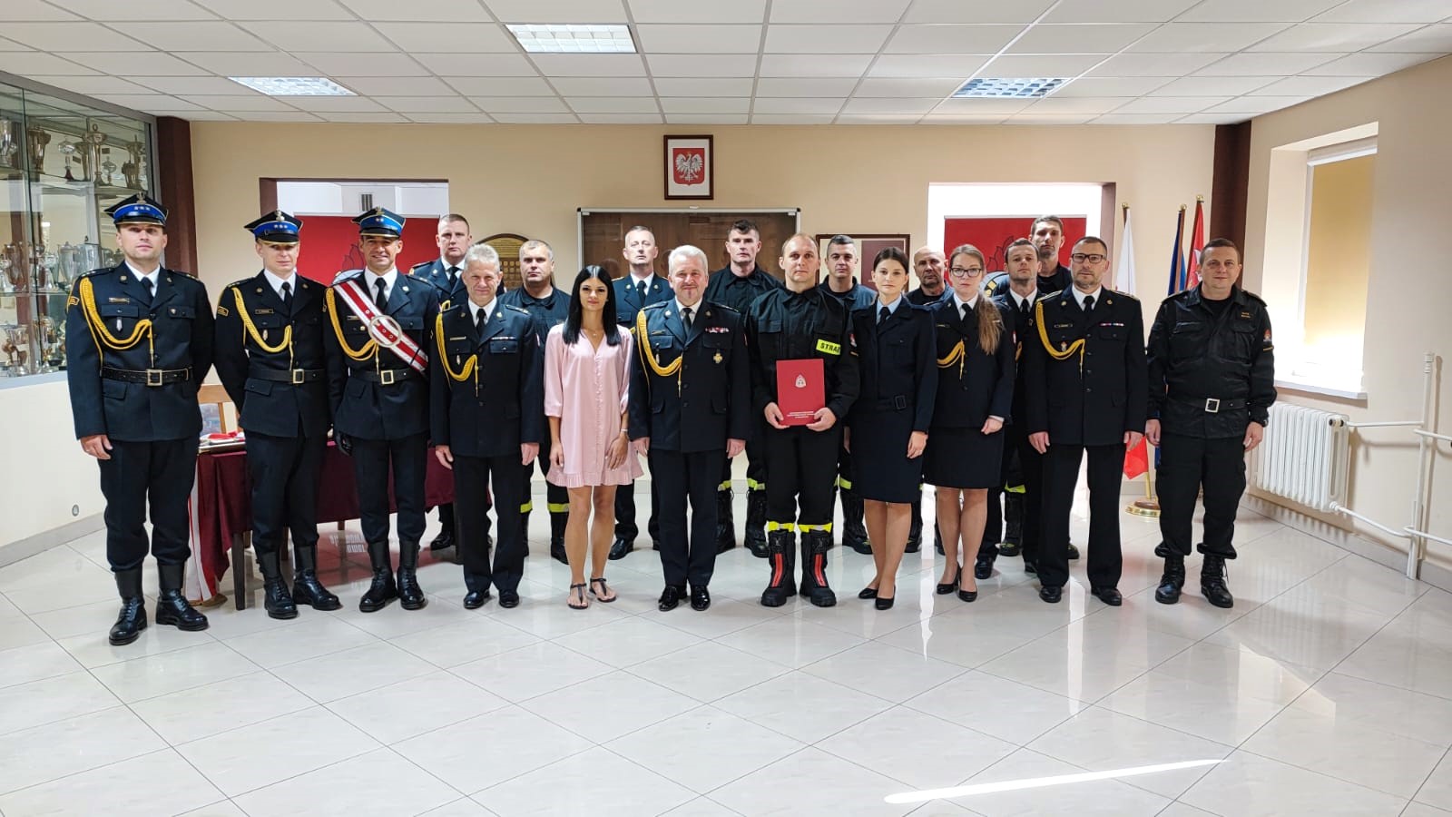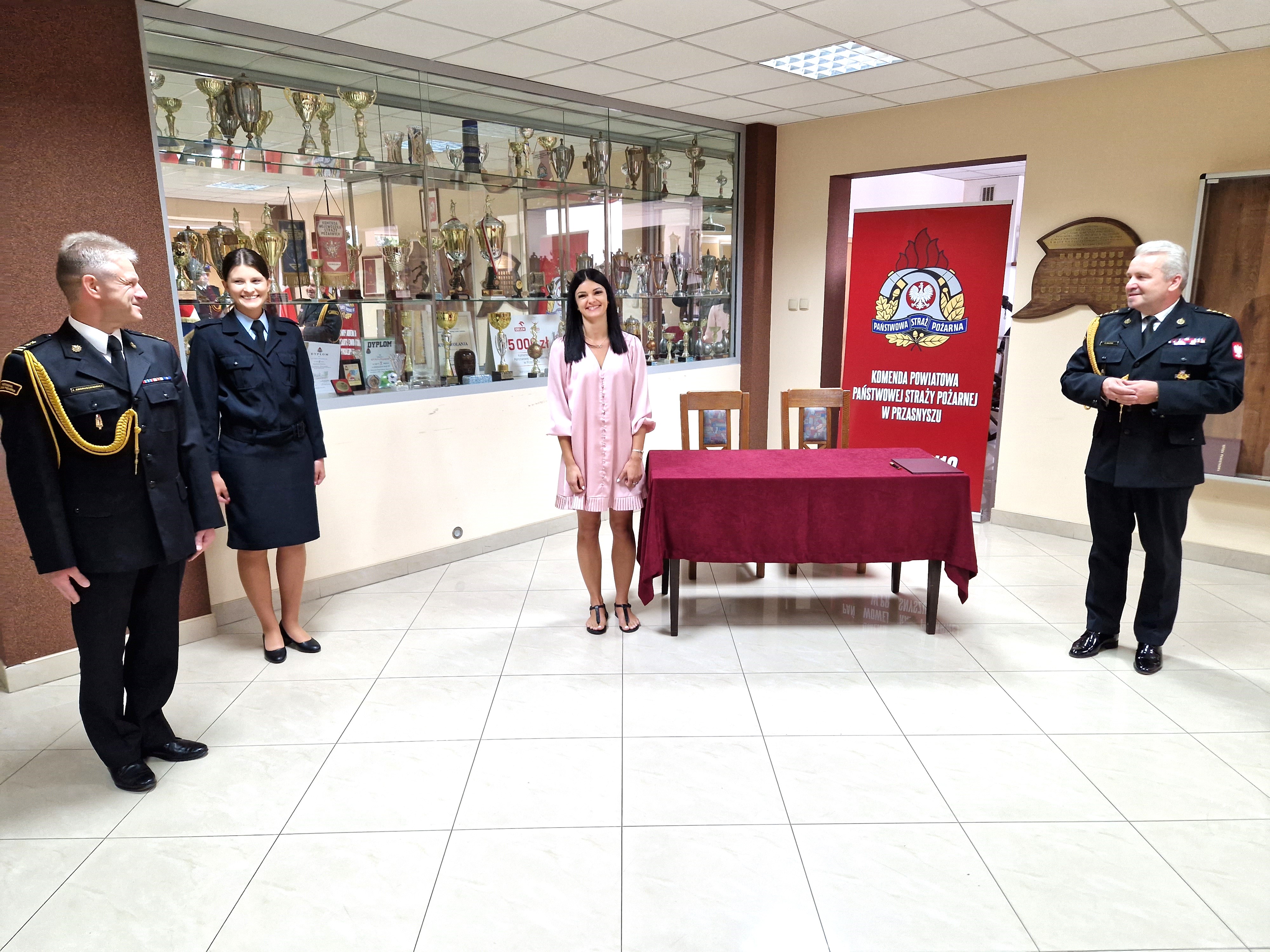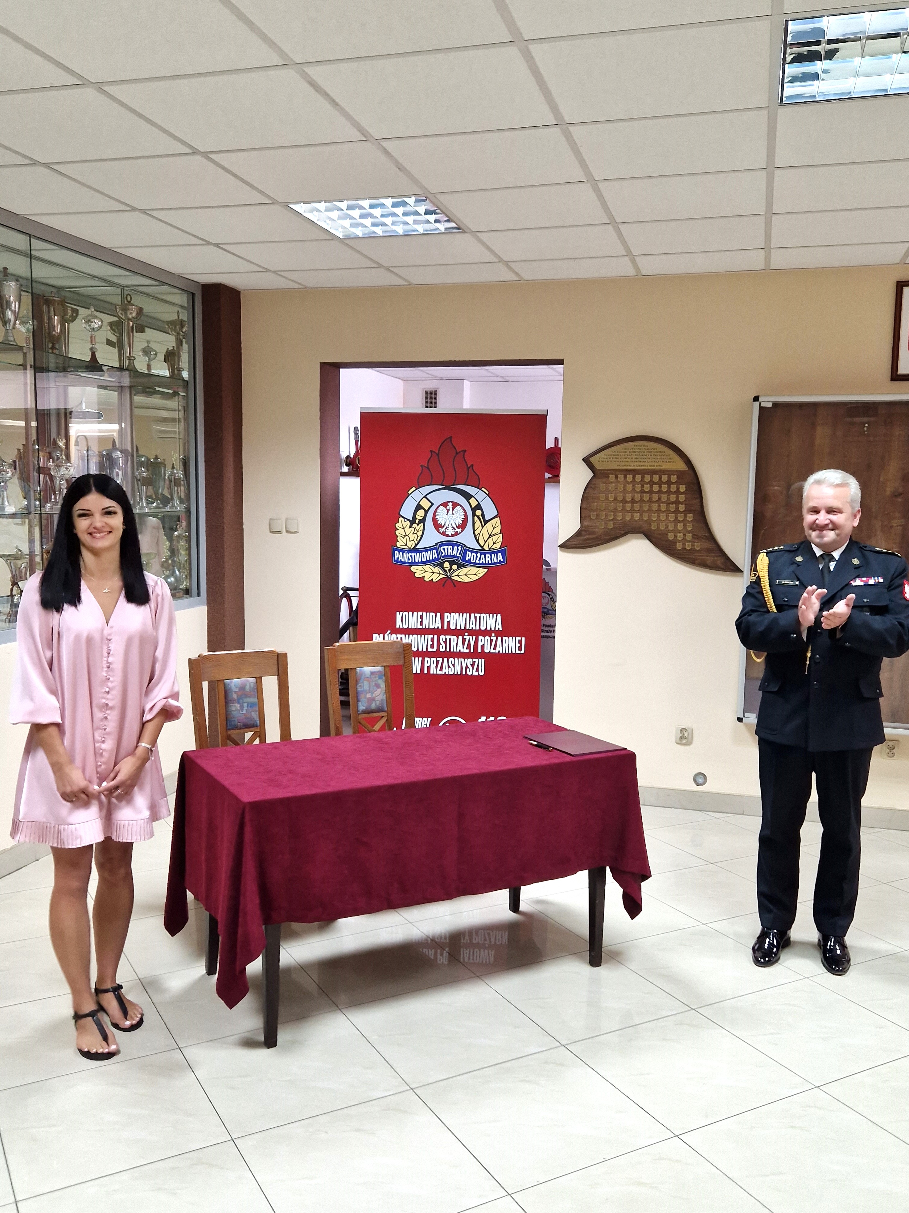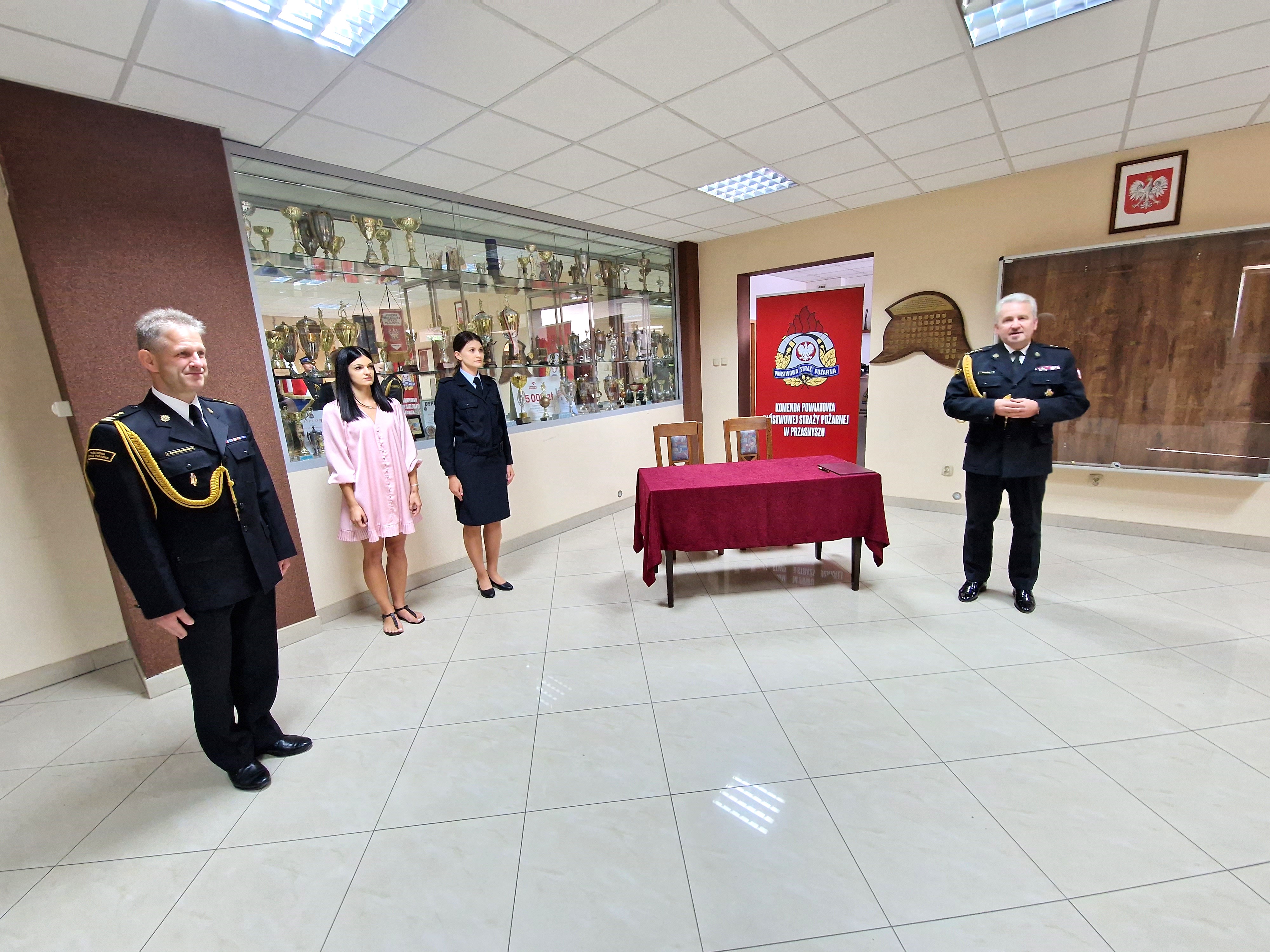 Podczas tej uroczystości Komendant Powiatowy przywitał także nowego pracownika Korpusu Służby Cywilnej , Panią Martynę Grabowską, która z dniem 1 wrześnie 2023 r. rozpoczęła pracę na stanowisku Starszego Specjalisty w Sekcji Kadrowo-Organizacyjnej KP PSP w Przasnyszu