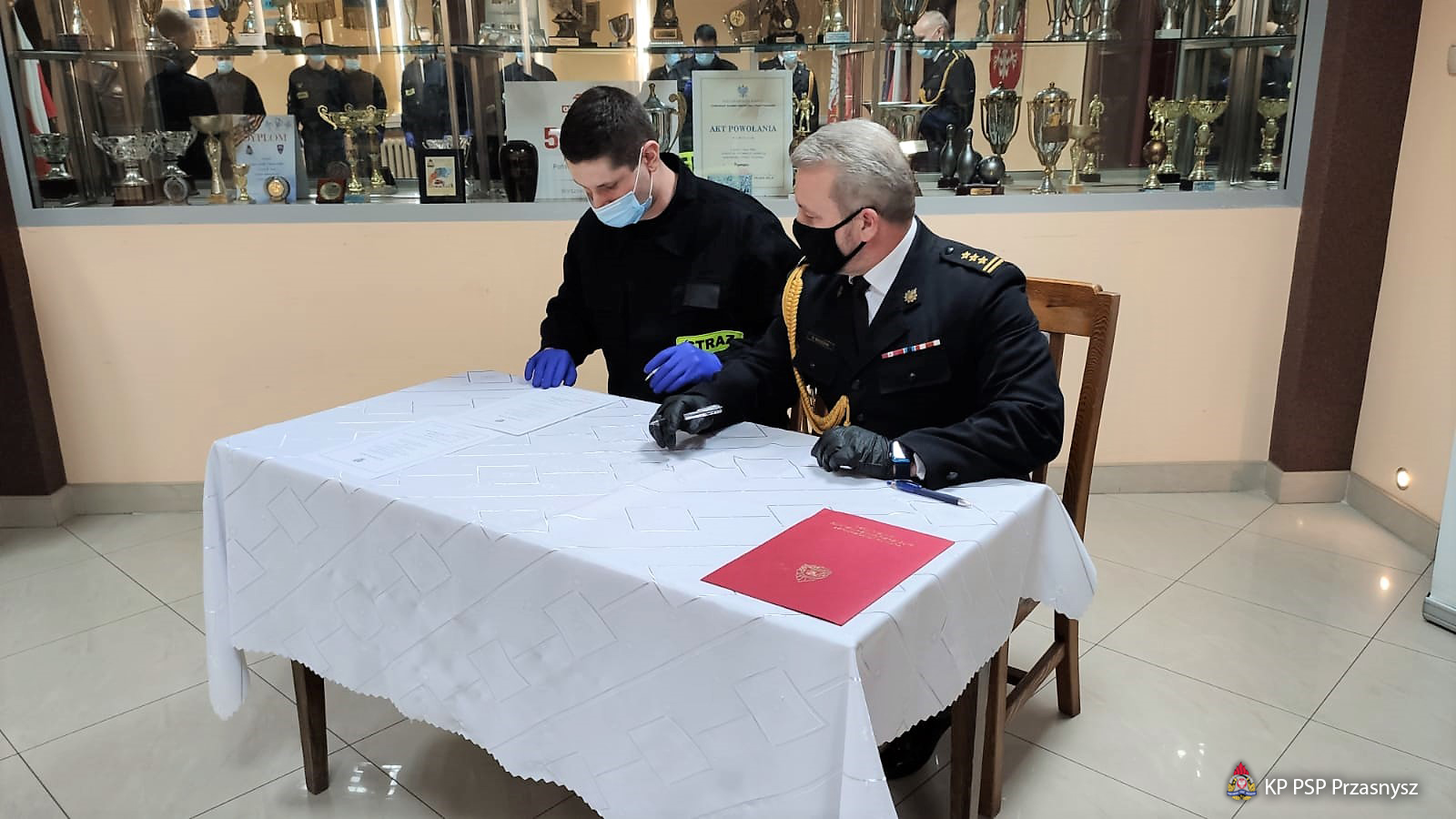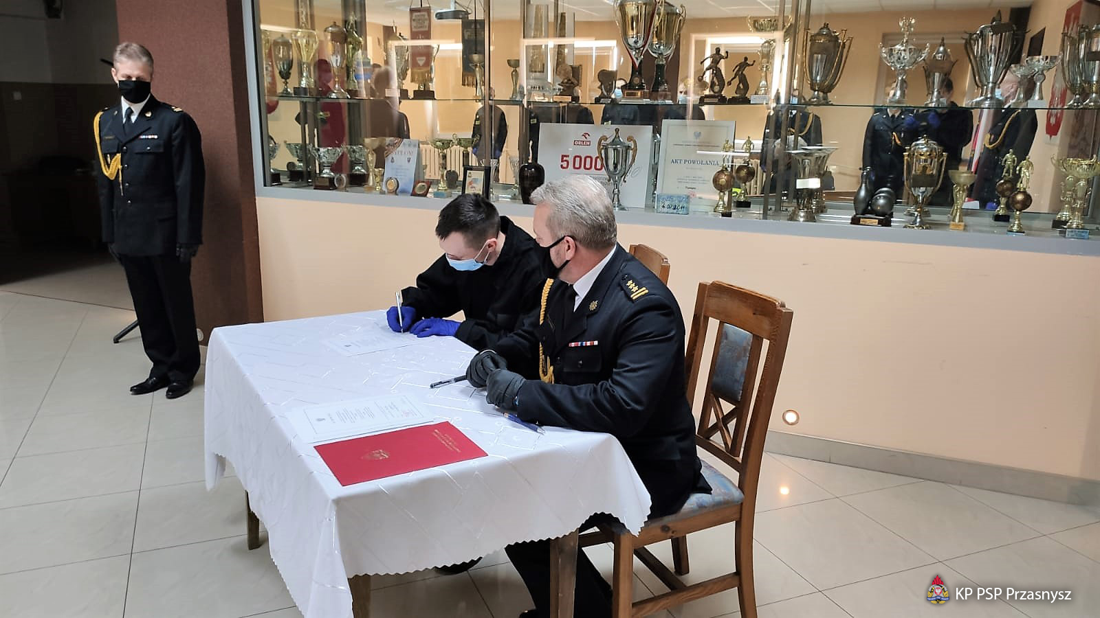 Po wypowiedzeniu słów roty strażacy złożyli podpisy pod aktami ślubowania, które przyjął Komendant Powiatowy.
