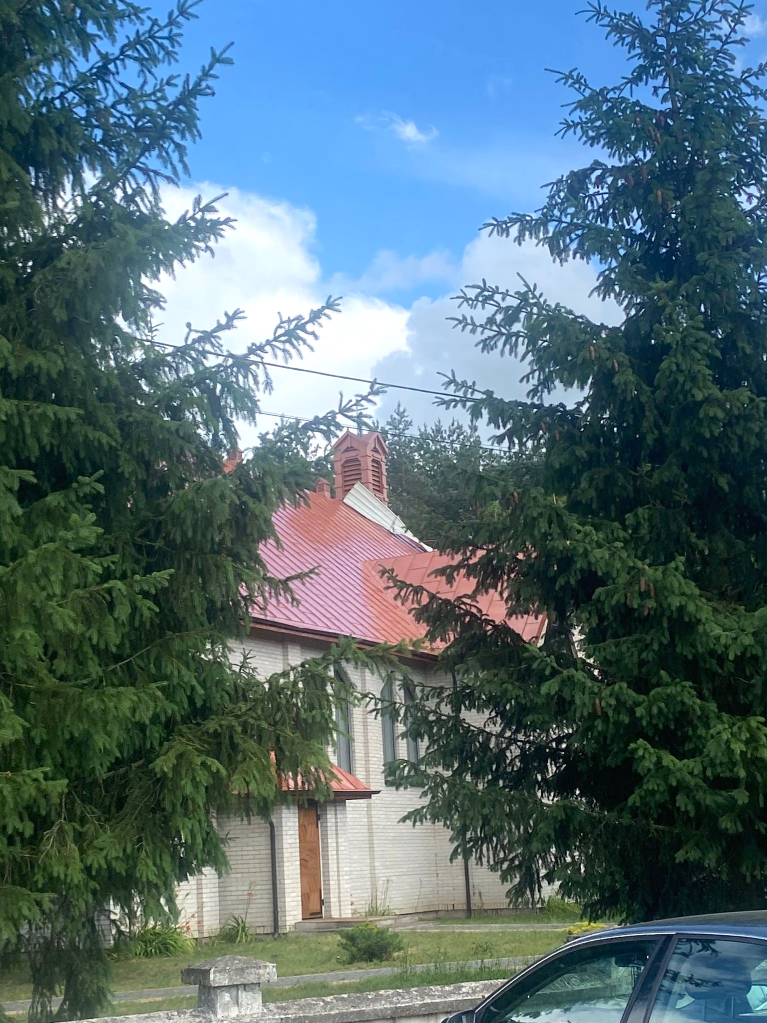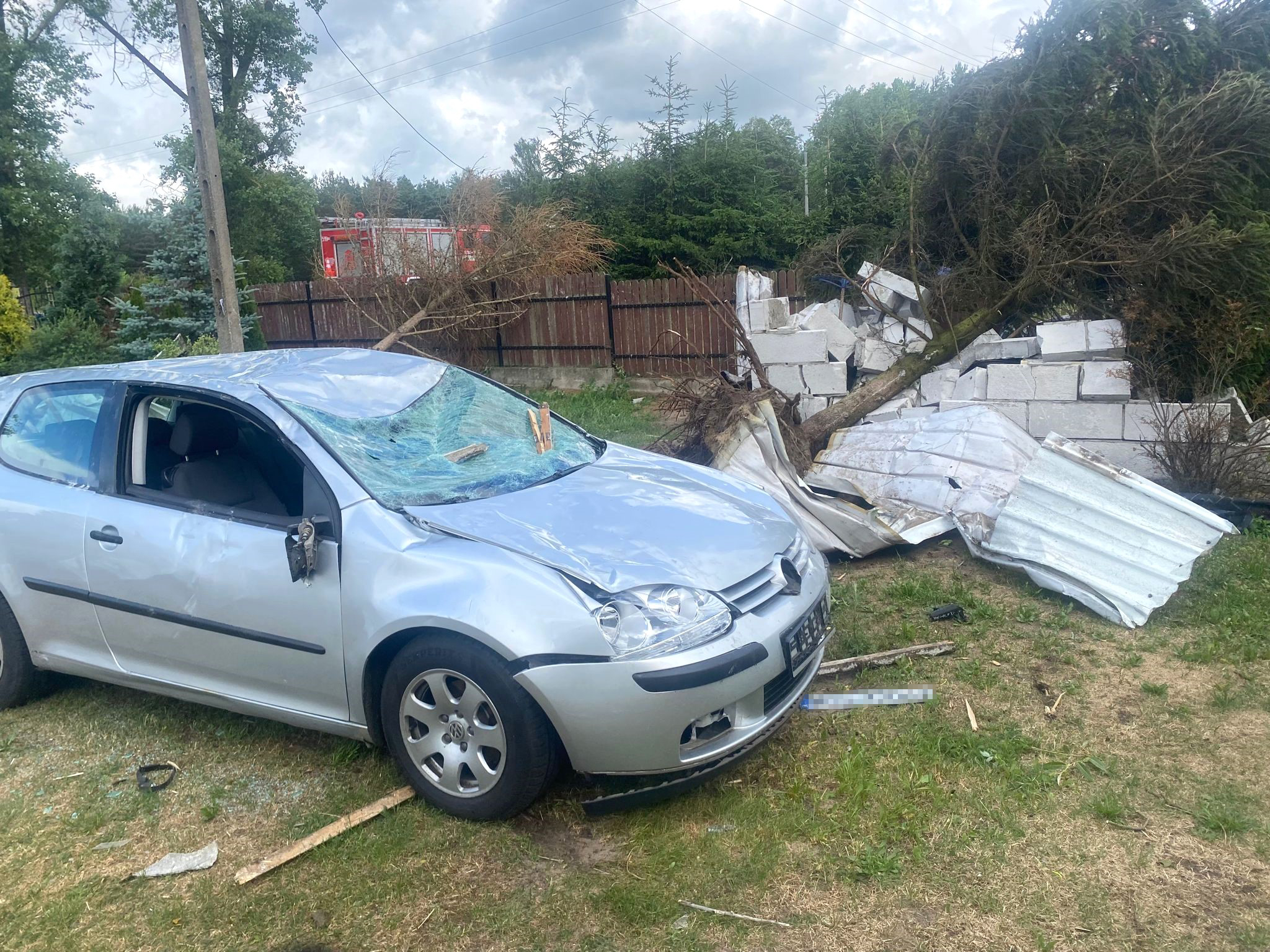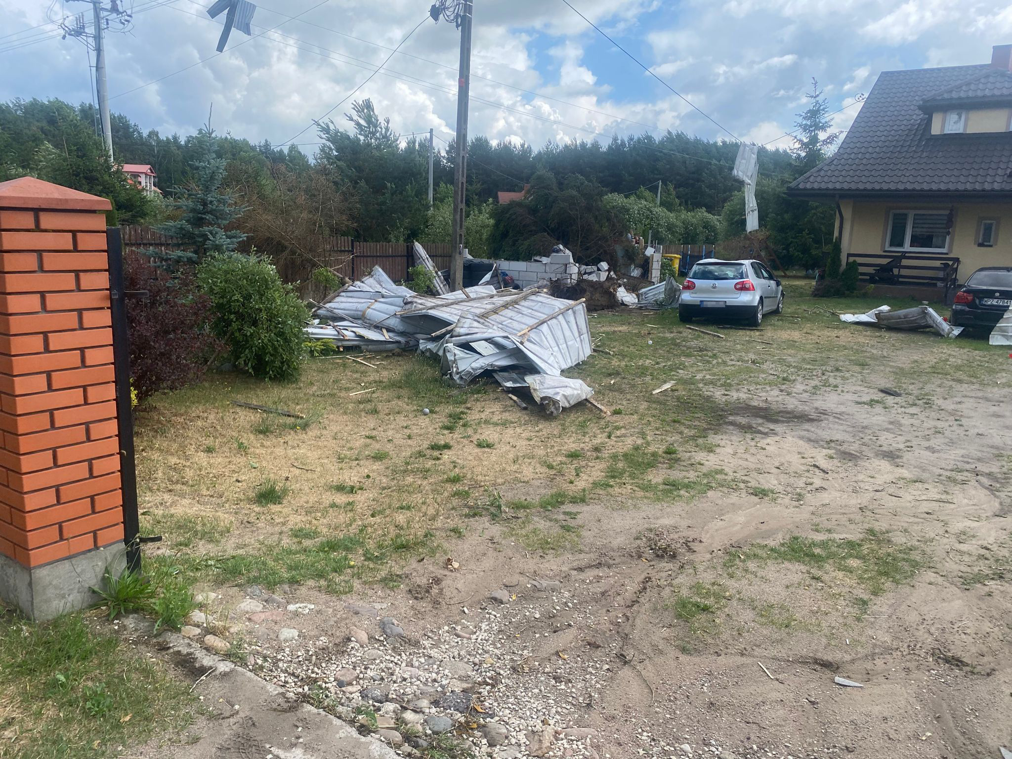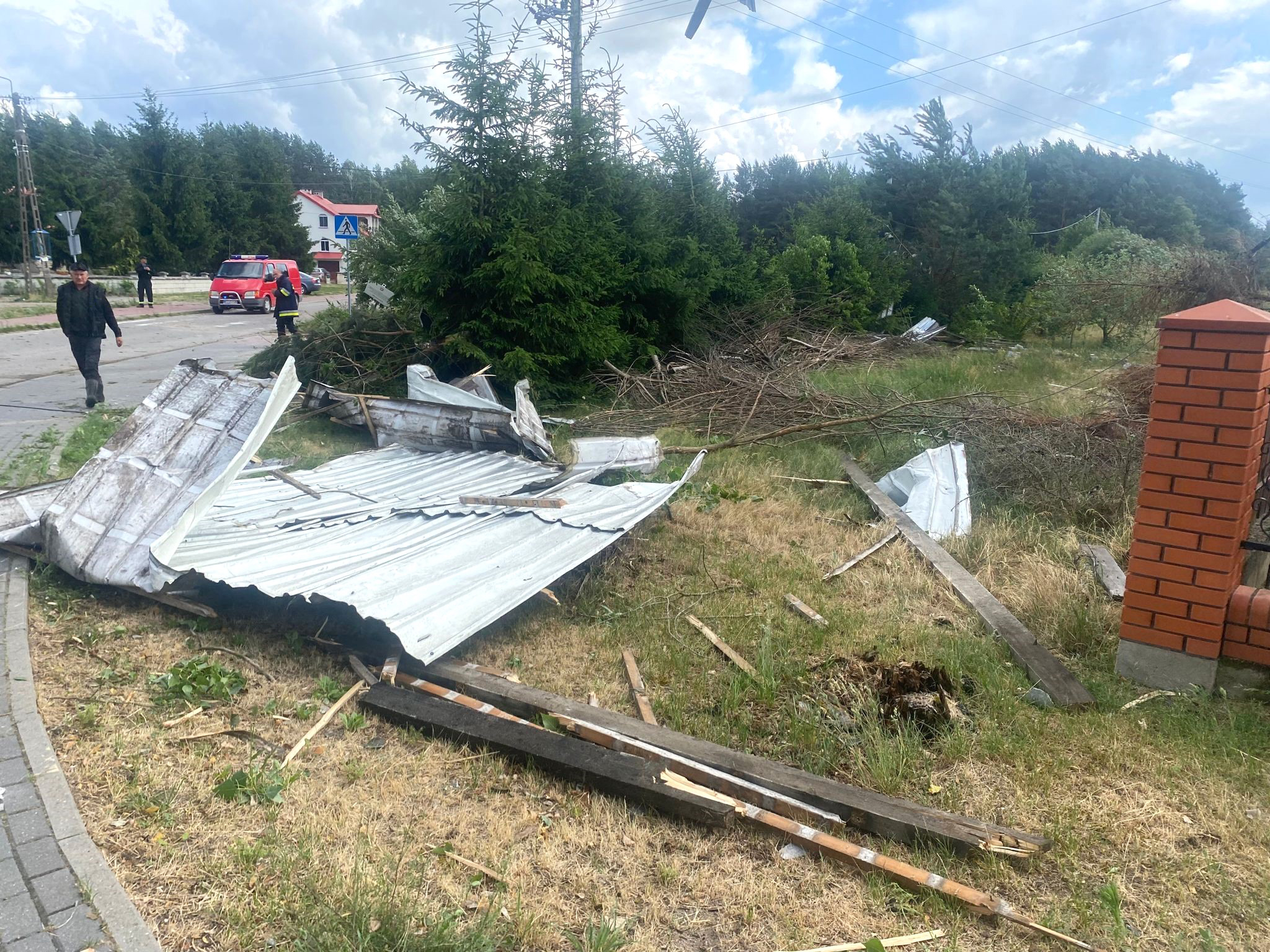 Po dojeździe jednostek ochrony przeciwpożarowej na miejscu zdarzenia zastano porozrzucane elementy konstrukcji dachu oderwane w całości przez silny wiatr z budynku gospodarczego - obory. Jeden z kawałków blachy trapezowej zawisł na napowietrznej linii energetycznej uszkadzając ją. Inny natomiast znajdował się na dachu pobliskiego kościoła na wysokości około 10 metrów od gruntu. Fragmenty blachy porozrzucane były również po sąsiednich posesjach.