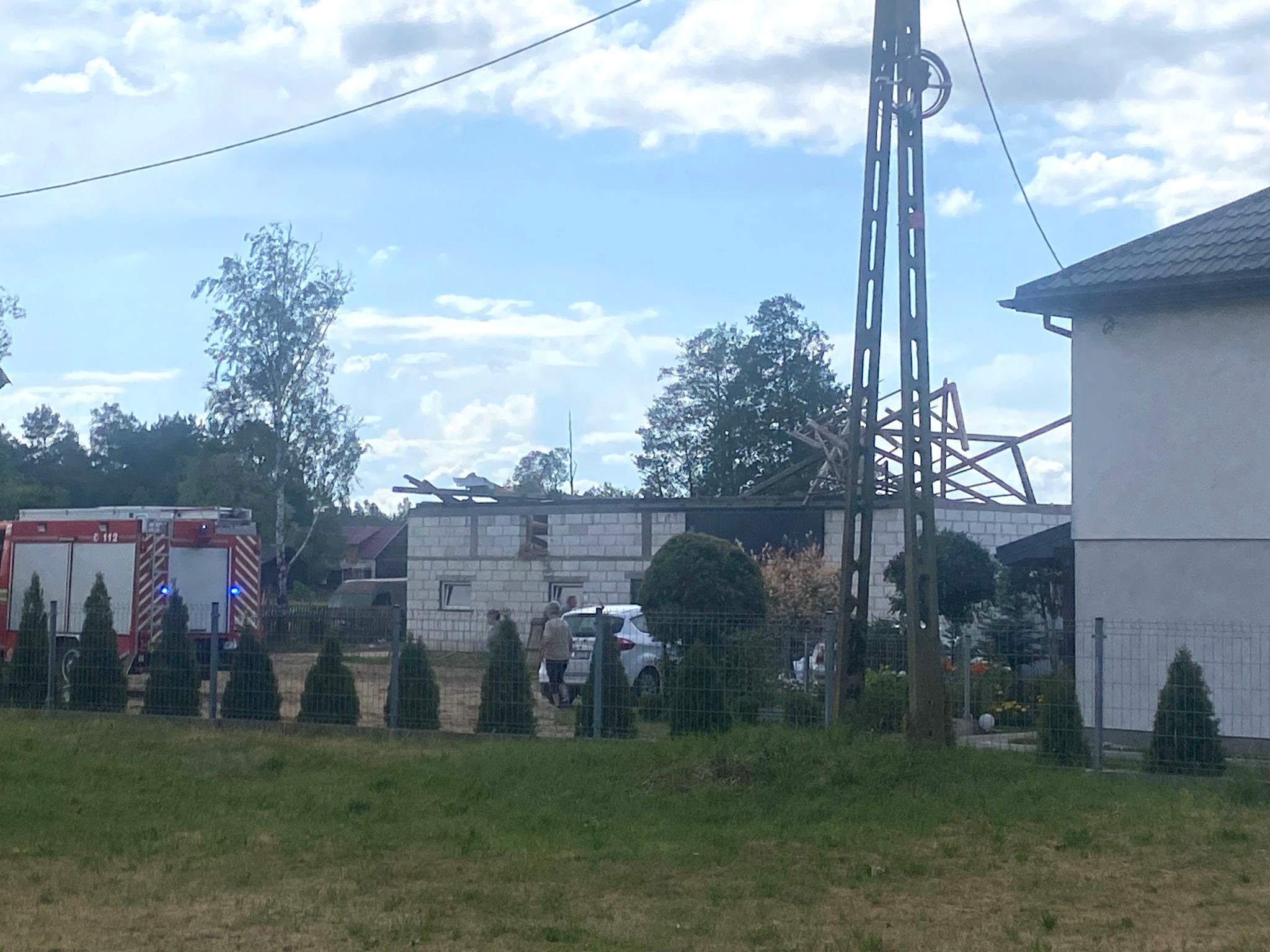Równocześnie ze strażakami swoje działania prowadziło Pogotowie Energetyczne - wymieniali naderwaną linię oraz korzystając z podnośnika hydraulicznego usunęli blachę wiszącą na linii. Zerwaniu uległ także światłowód internetowy który zamocowany był na słupach PGE i leżał on w poprzek drogi powiatowej. Ruch kołowy na drodze był całkowicie zamknięty.