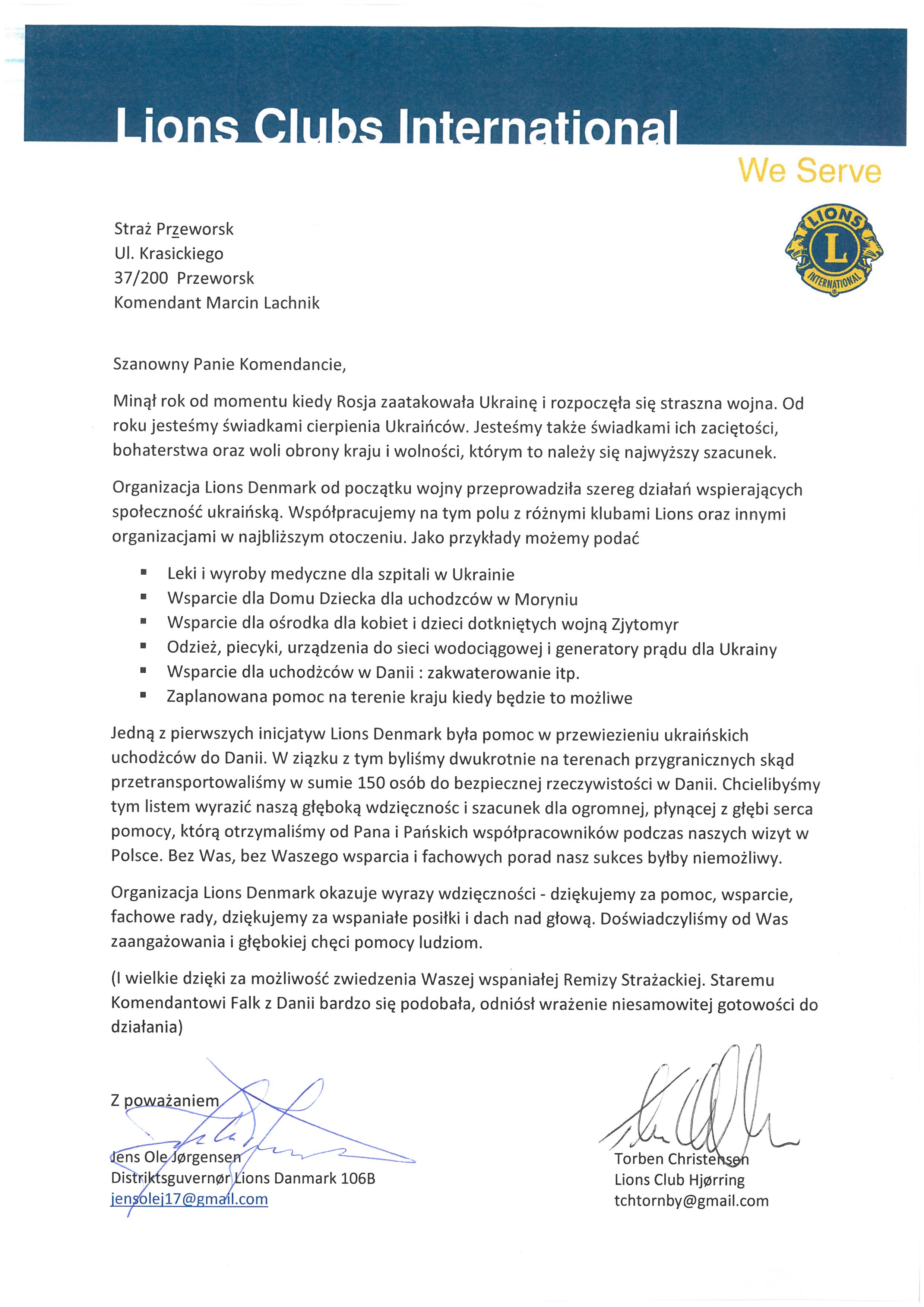 Podziękowania od Organizacji Lions z Danii za wspólne działania