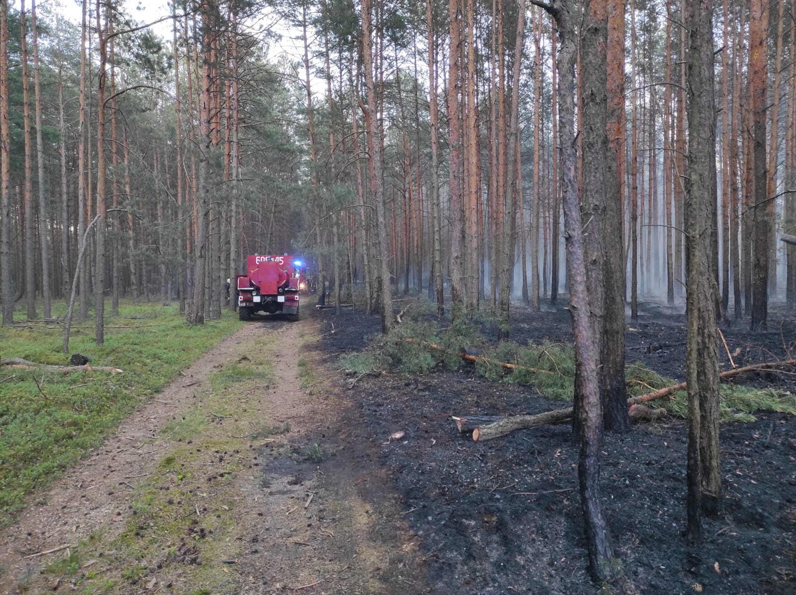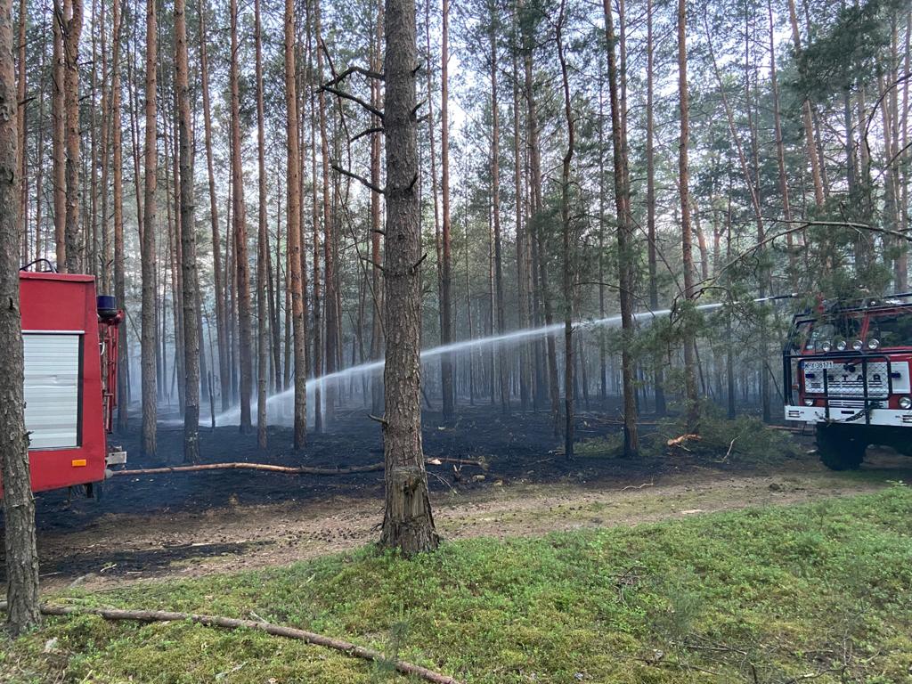 Dnia 10 czerwca br. o godzinie 15:38 do Stanowiska Kierowania Komendanta Powiatowego w Przysusze wpłynęło zgłoszenie dotyczące pożaru lasu w pobliżu miejscowości Odrzywół. Na miejsce zadysponowane zostały w pierwszym rzucie jednostki OSP z terenu gminy Odrzywół oraz Klwów. Po dotarciu pierwszych zastępów na miejsce zdarzenia stwierdzono pożar poszycia w prywatnym lesie sosnowym, który wciąż się rozwijał – nastąpiło dysponowanie kolejnych jednostek OSP z terenu powiatu przysuskiego, plutonu gaśniczego z powiatu grójeckiego oraz Grupy Operacyjnej Komendanta Powiatowego Państwowej Straży Pożarnej w Przysusze. Po przybyciu na miejsce Dowódcy Jednostki Ratowniczo Gaśniczej PSP w Przysusze sytuacja na lewym skrzydle była opanowana ze względu na możliwość dojazdu zastępów gaśniczych, natomiast po przeciwnej stronie pożar w dalszym ciągu intensywnie się rozprzestrzeniał. Po zlokalizowaniu pożaru na prawym skrzydle (ograniczenie rozprzestrzeniania) sytuacja została w pełni opanowana. W trakcie prowadzonych działań jednego zrzutu wody dokonał samolot gaśniczy będący w dyspozycji Lasów Państwowych. Dalsze działania zastępów polegały na dogaszeniu pojedynczych ognisk pożaru prądami wody i podręcznym sprzętem burzącym oraz sukcesywnym przelewaniu pogorzeliska. Działania, w których udział brało łącznie 17 zastępów trwały ponad 7 godzin. Spaleniu uległo około 6 hektarów lasu.