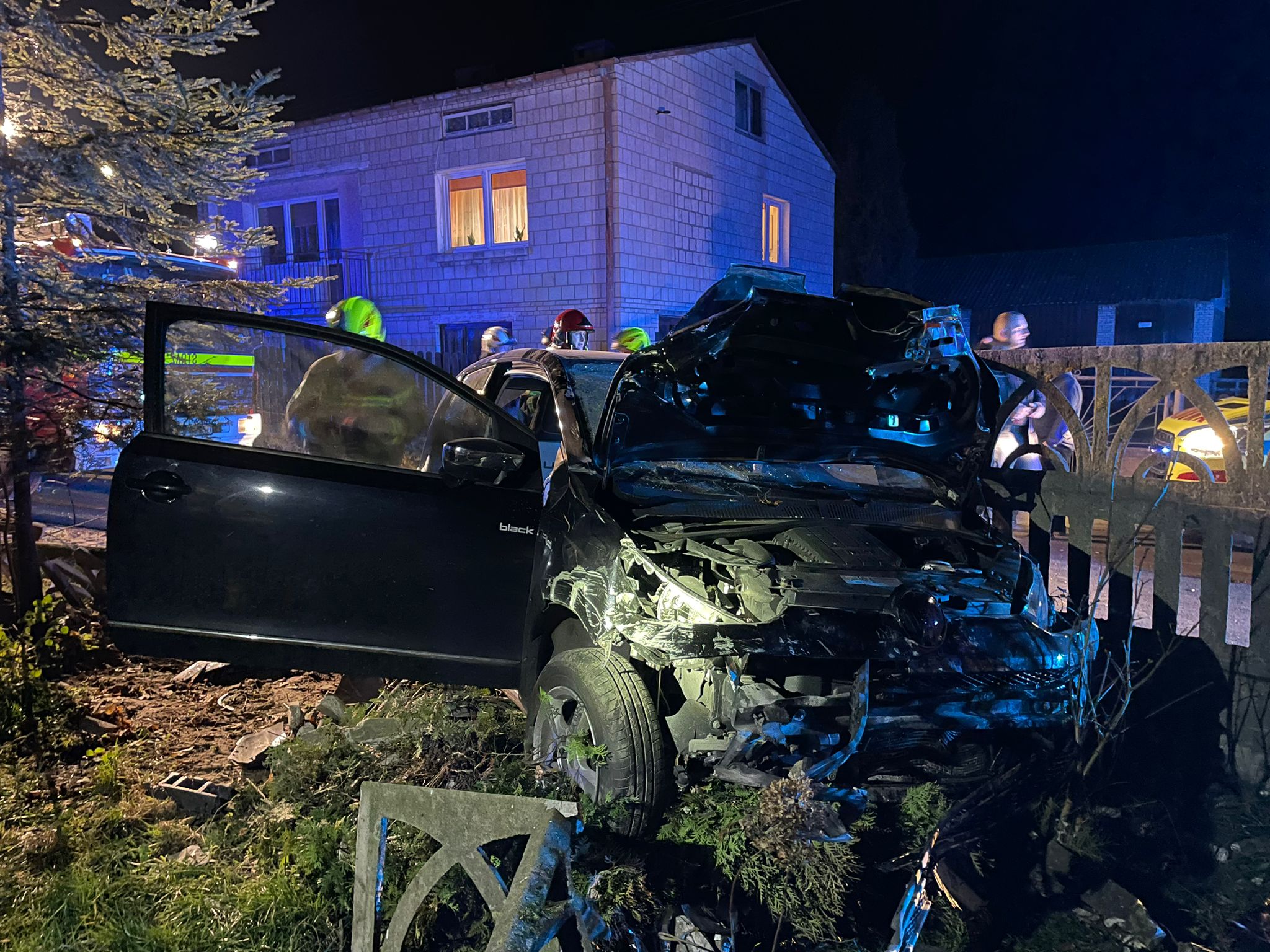 Dwa zastępy PSP oraz dwa zastępy OSP (Gielniów, Rozwady) zadysponowano do wypadku samochodu osobowego, który uderzył w betonowe ogrodzenie w miejscowości Brzezinki gm. Gielniów.