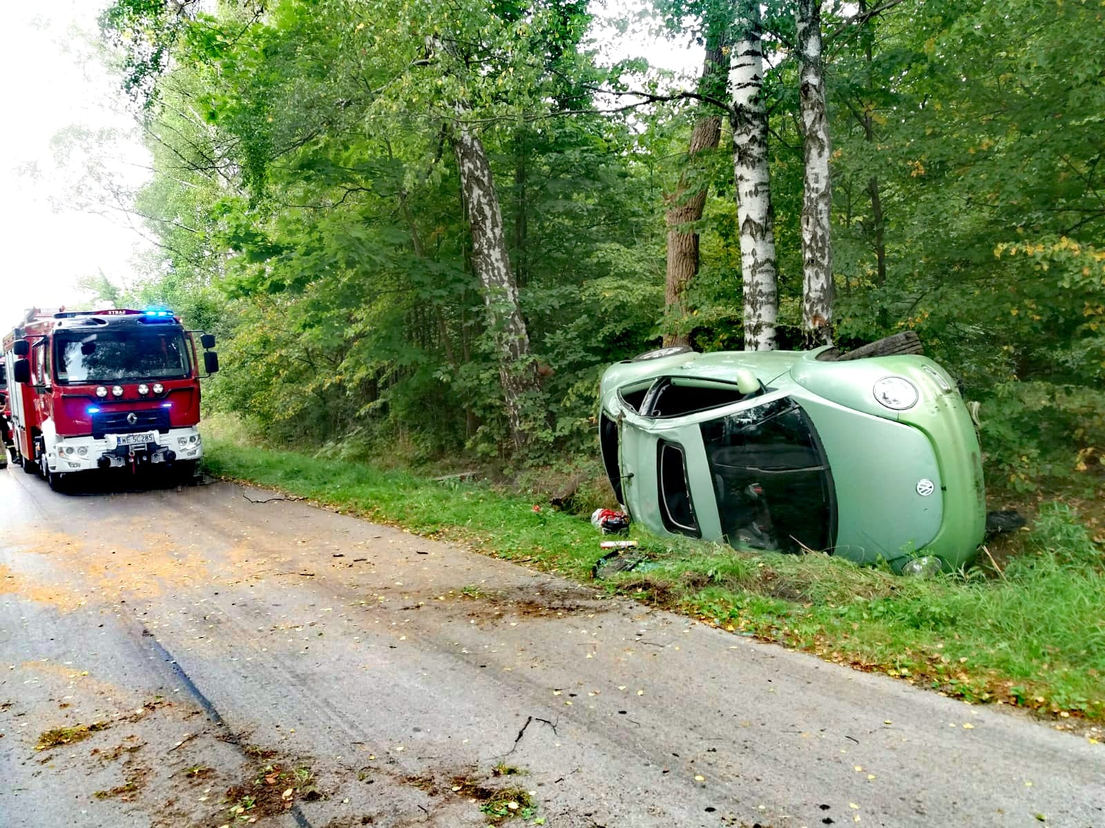 Trzy zastępy PSP oraz zastęp OSP Przysucha zadysponowano do dachowania samochodu osobowego w którym podróżowały dwie osoby w miejscowości Ruski Bród gm. Przysucha.