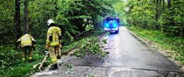 Zastęp OSP Przysucha został zadysponowany do usunięcia zagrożenia ze strony powalonego drzewa, tarasującego przejazd drogą powiatową w miejscowości Ruski Bród.