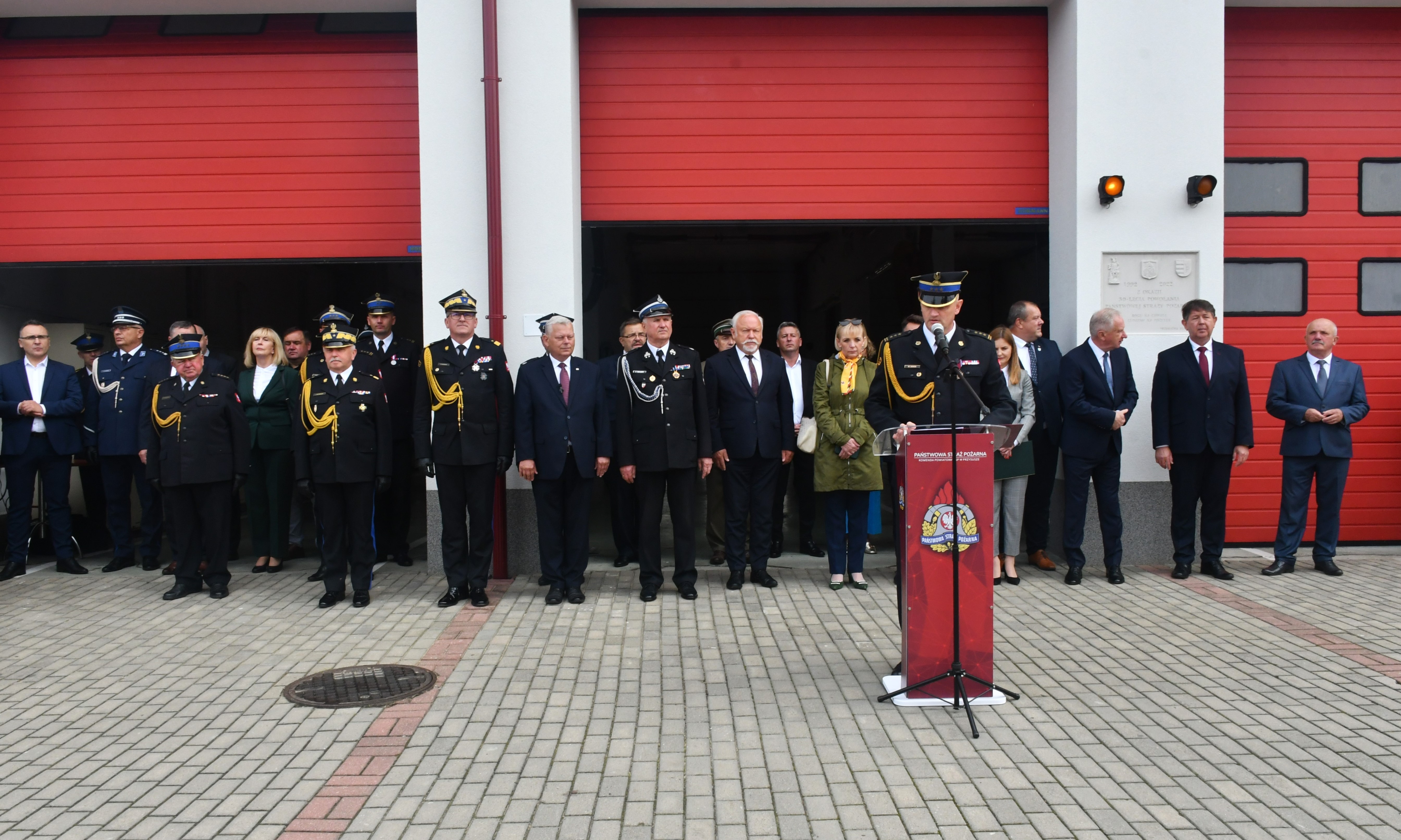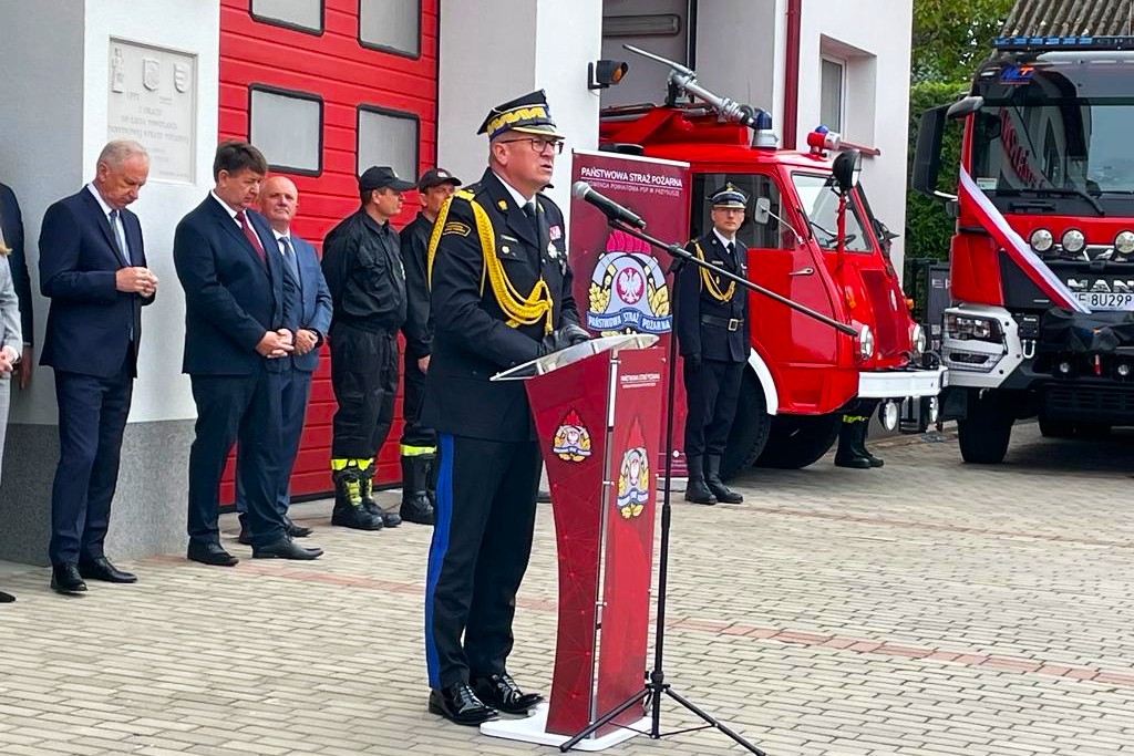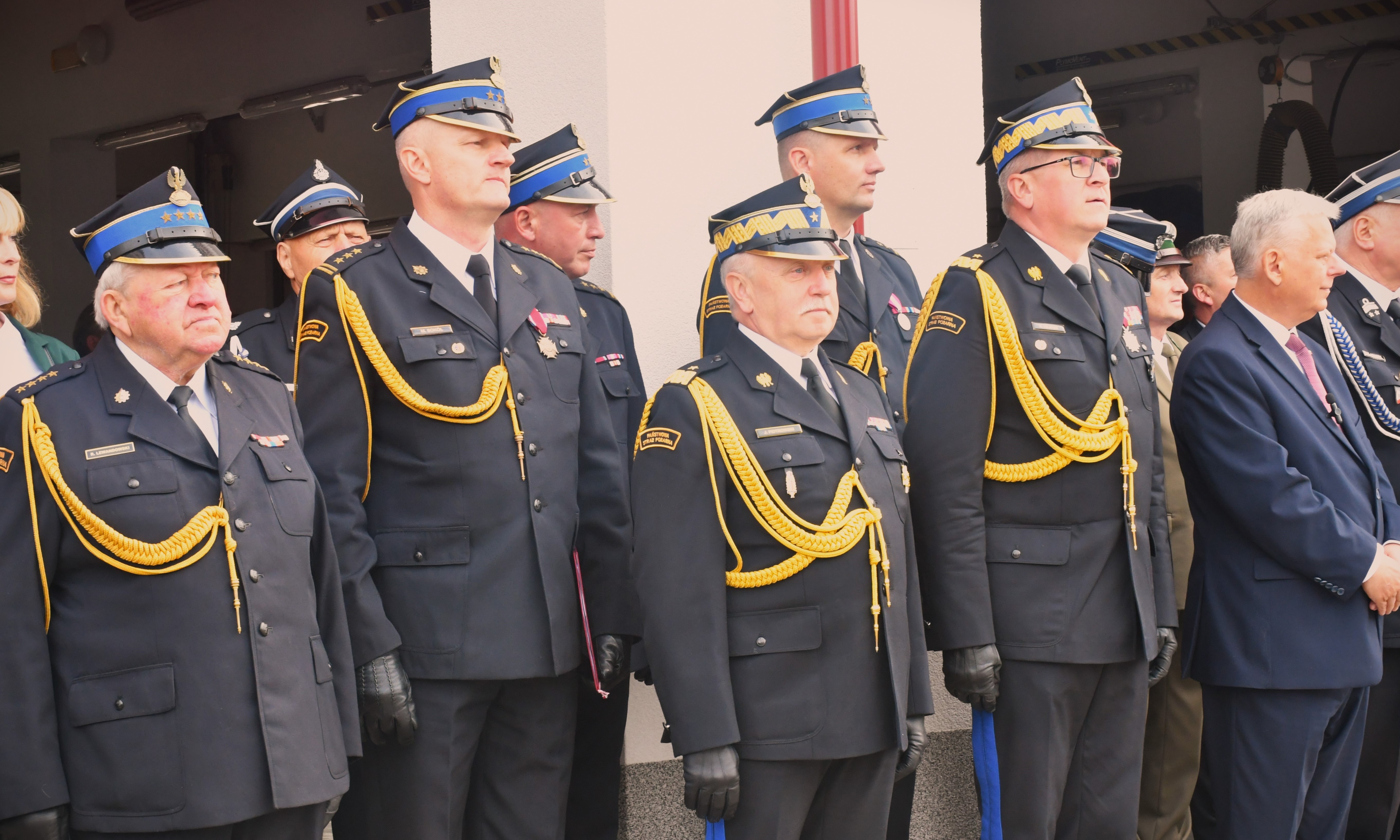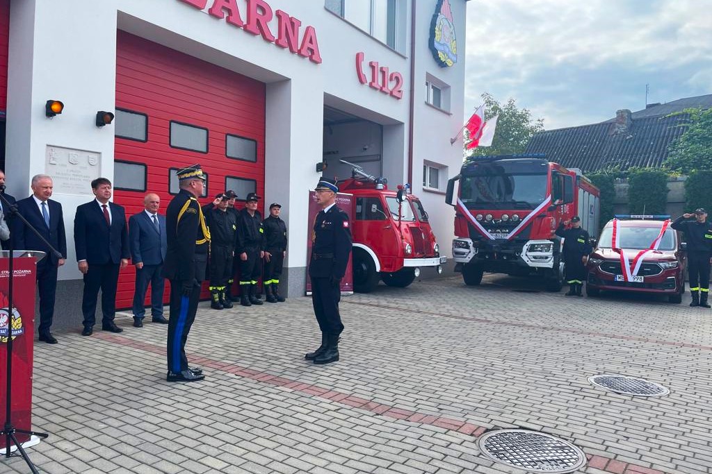 Następnie obyło się uroczyste przekazanie samochodów i sprzętu pożarniczego zakupionego w 2023 roku dla komendy powiatowej, która otrzymała ciężki samochód ratowniczo-gaśniczy MAN z pełnym wyposażeniem, lekki samochód kwatermistrzowski marki Ford Tourneo Connect oraz przyczepkę do przewozu quada. Poświęcenia budynku oraz nowego sprzętu dokonał ks. dr Sławomir Adamczyk.