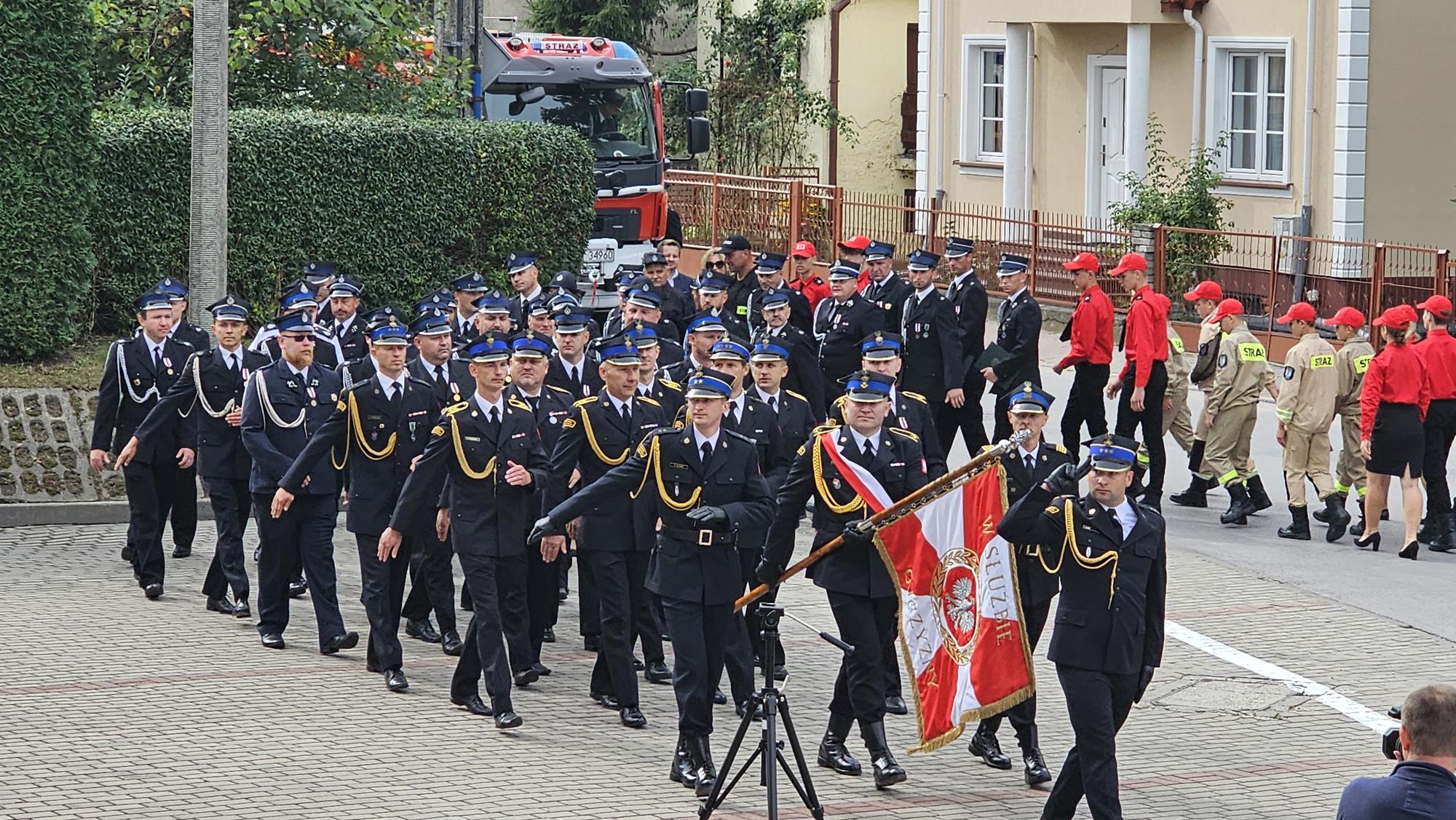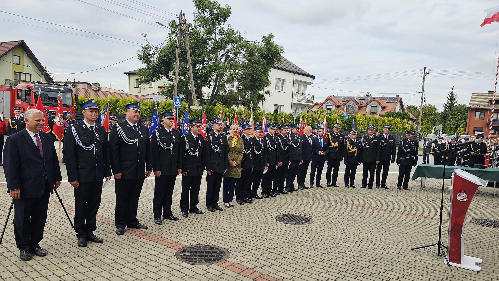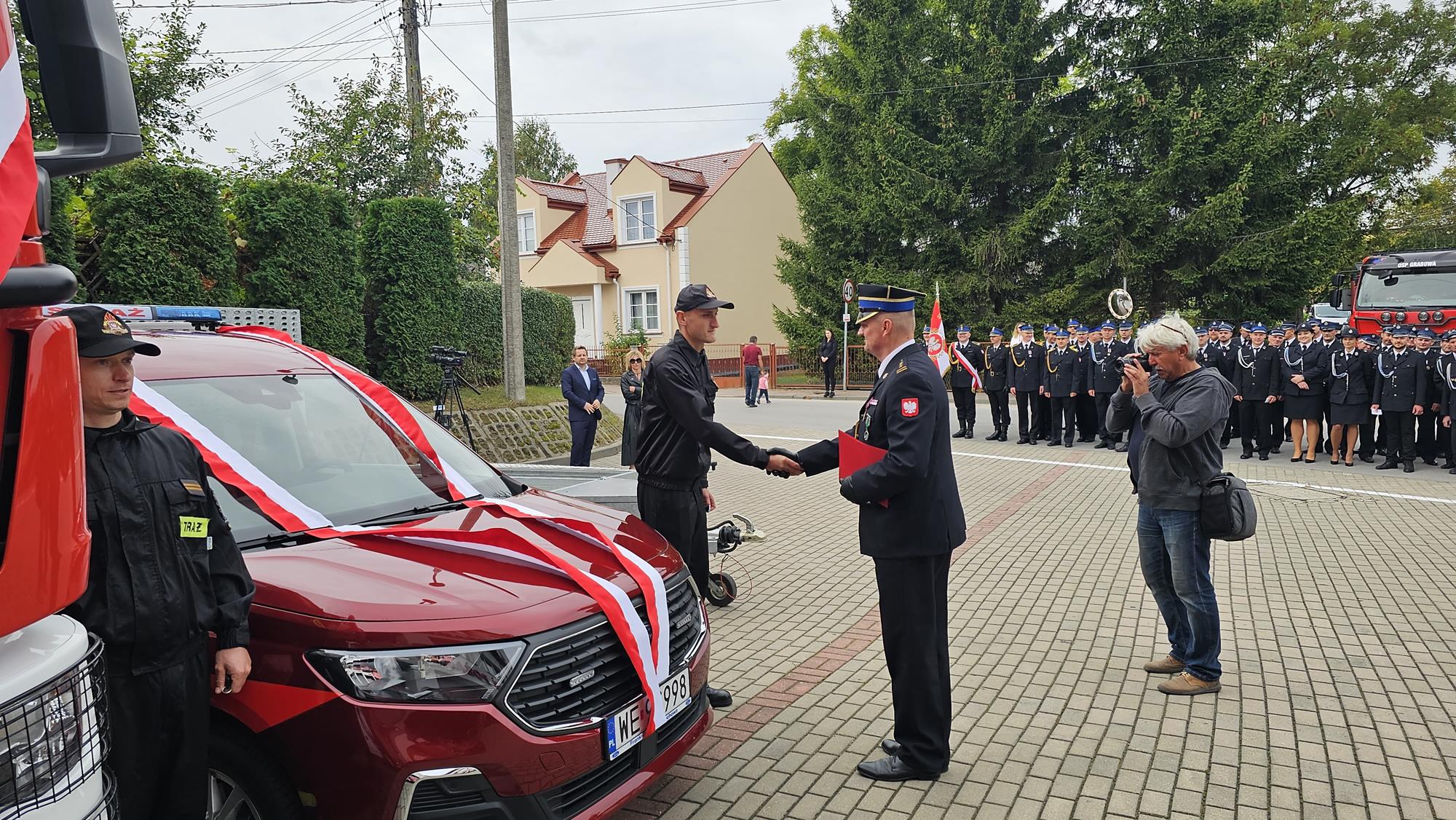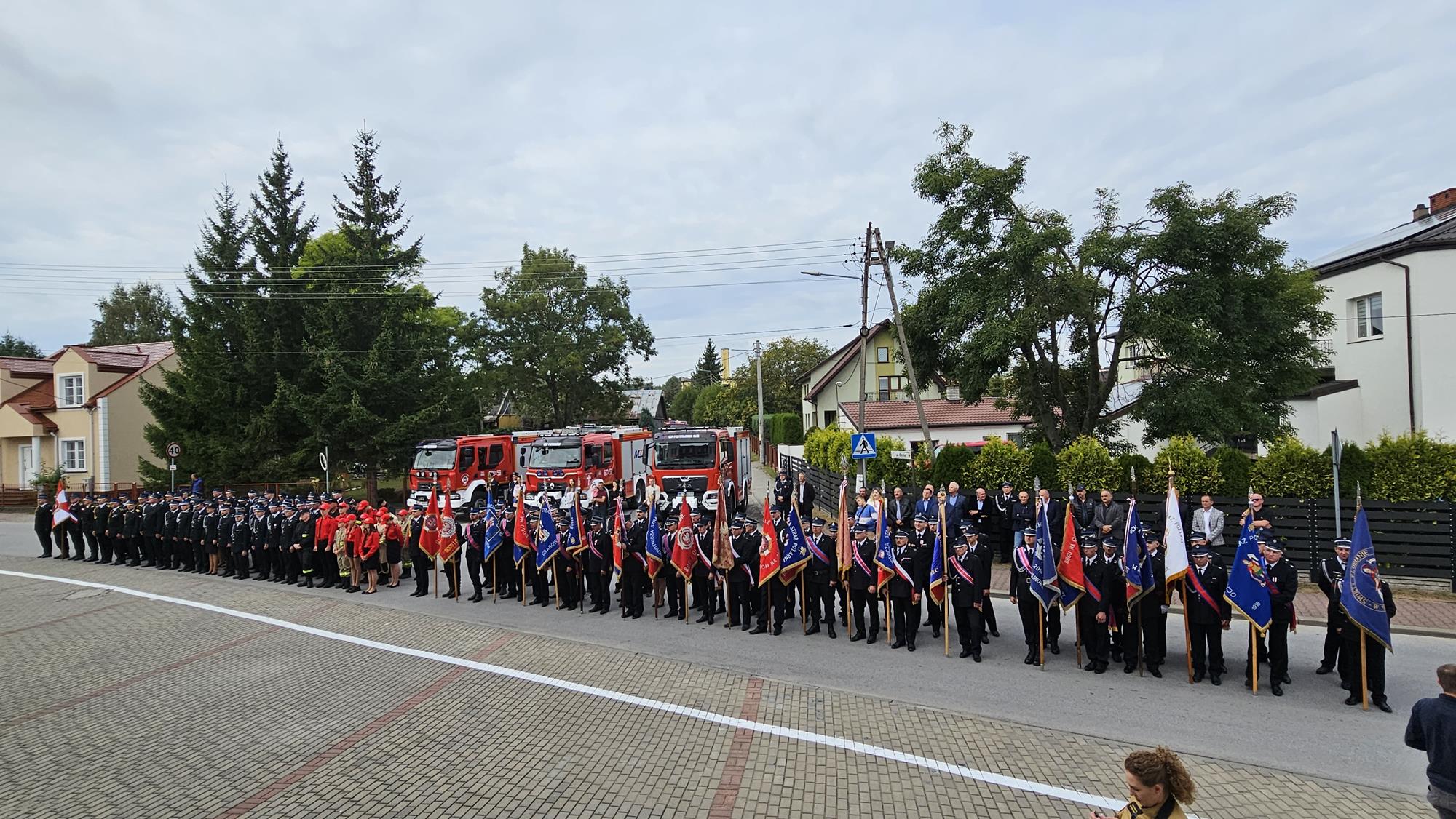 Następnie obyło się uroczyste przekazanie samochodów i sprzętu pożarniczego zakupionego w 2023 roku dla komendy powiatowej, która otrzymała ciężki samochód ratowniczo-gaśniczy MAN z pełnym wyposażeniem, lekki samochód kwatermistrzowski marki Ford Tourneo Connect oraz przyczepkę do przewozu quada. Poświęcenia budynku oraz nowego sprzętu dokonał ks. dr Sławomir Adamczyk.