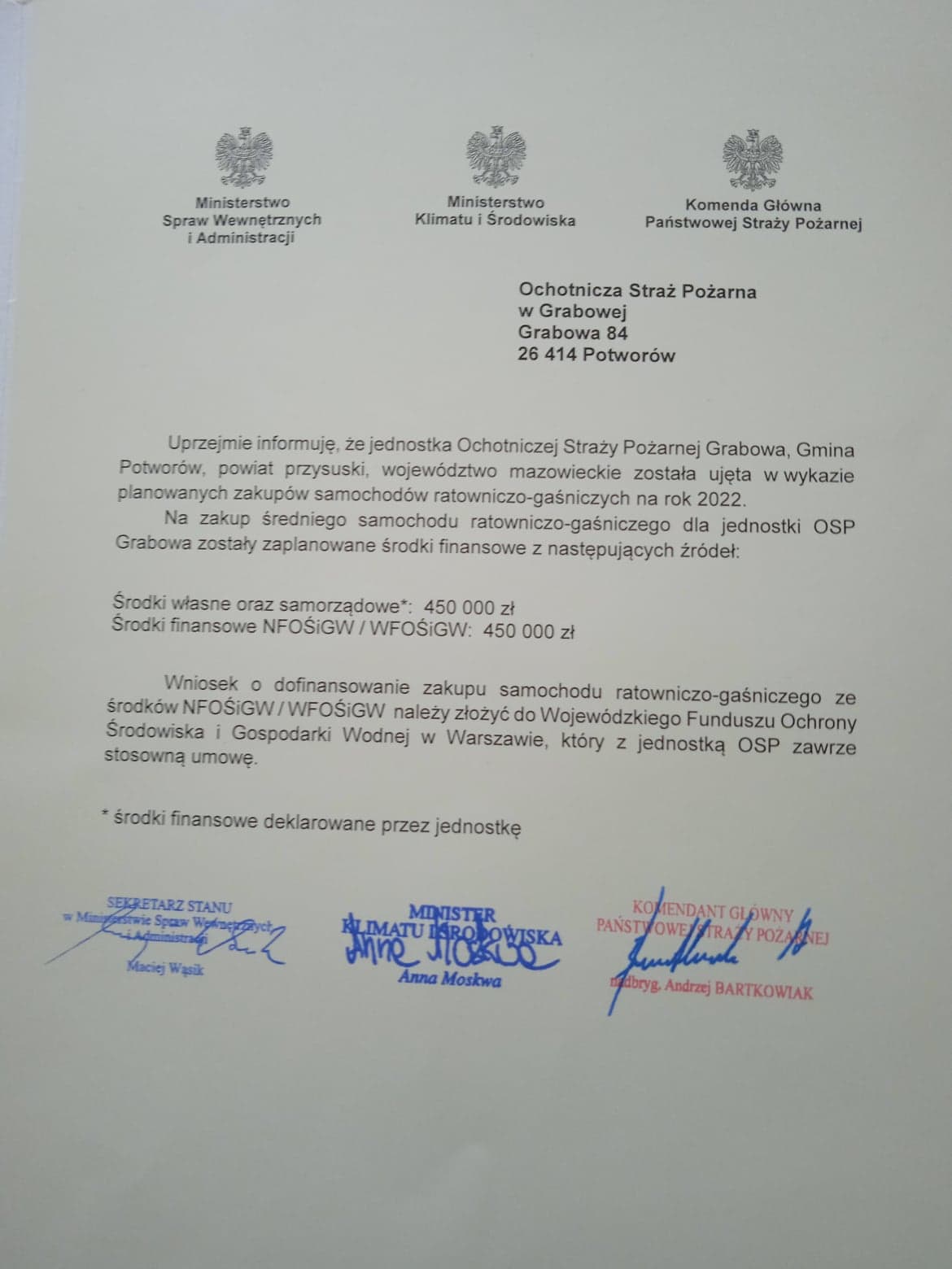 25 kwietnia 2022 r. w sali konferencyjnej Urzędu Gminy Potworów, przedstawiciel jednostki Ochotniczej Straży Pożarnej w Grabowej – Prezes dh Mariusz Żurowski oraz Wójt Gminy Potworów Pan Marek Klimek odebrali promesę na zakup średniego samochodu ratowniczo-gaśniczego. Promesę wręczył Starosta Przysuski Pan Marian Niemirski wraz z Komendantem Powiatowym PSP w Przysusze bryg. Marcinem Sokołem.