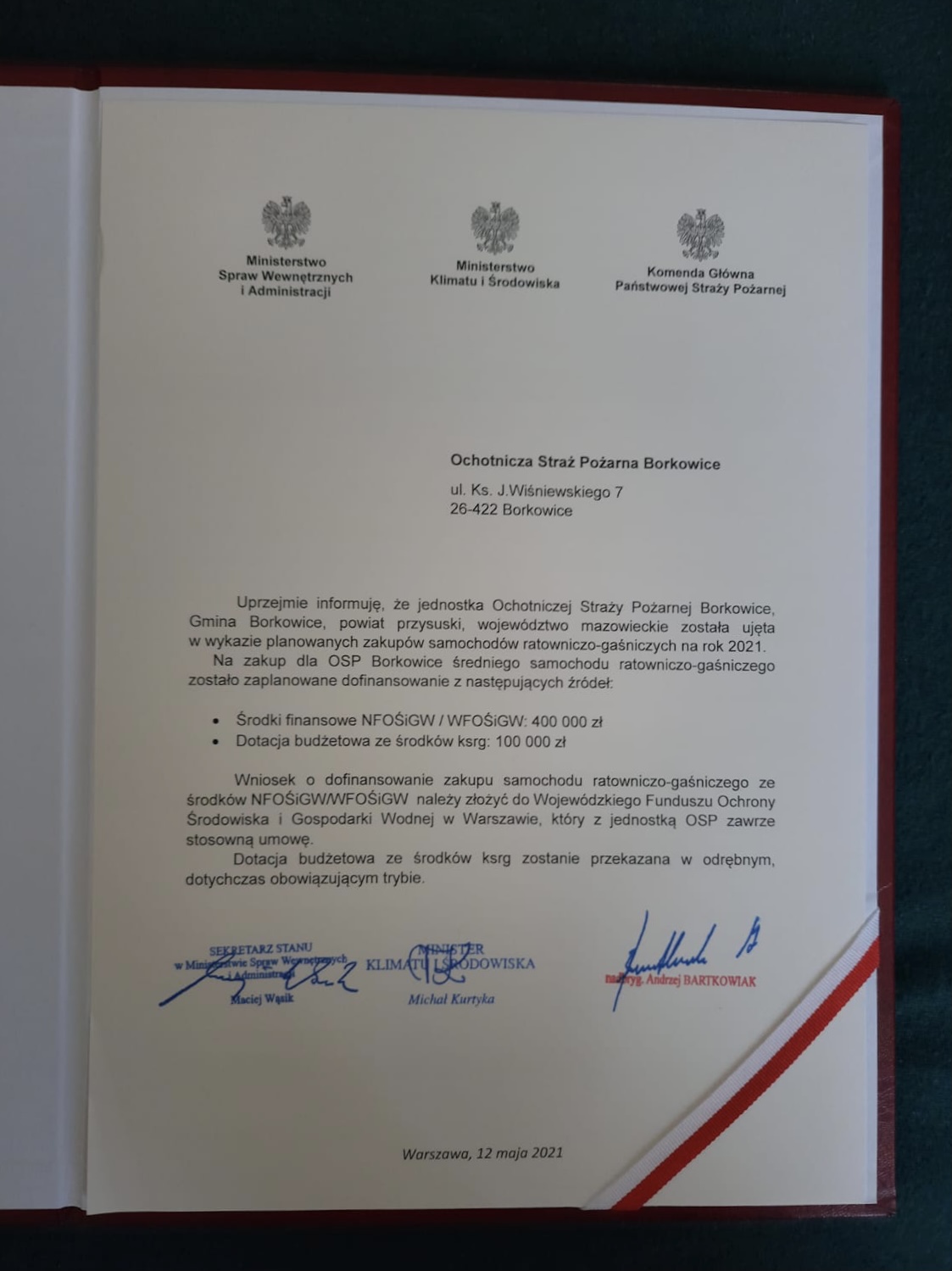 W projekt dofinansowania zakupu samochodów ratowniczych dla jednostek ochotniczych straży pożarnych osobiście zaangażowali się Pan Mariusz Kamiński - Minister Spraw Wewnętrznych i Administracji, Pan Maciej Wąsik - Wiceminister Spraw Wewnętrznych i Administracji, nadbryg. Andrzej Bartkowiak - Komendant Główny PSP oraz nadbryg. Jarosław Nowosielski - Mazowiecki Komendant Wojewódzki PSP.
