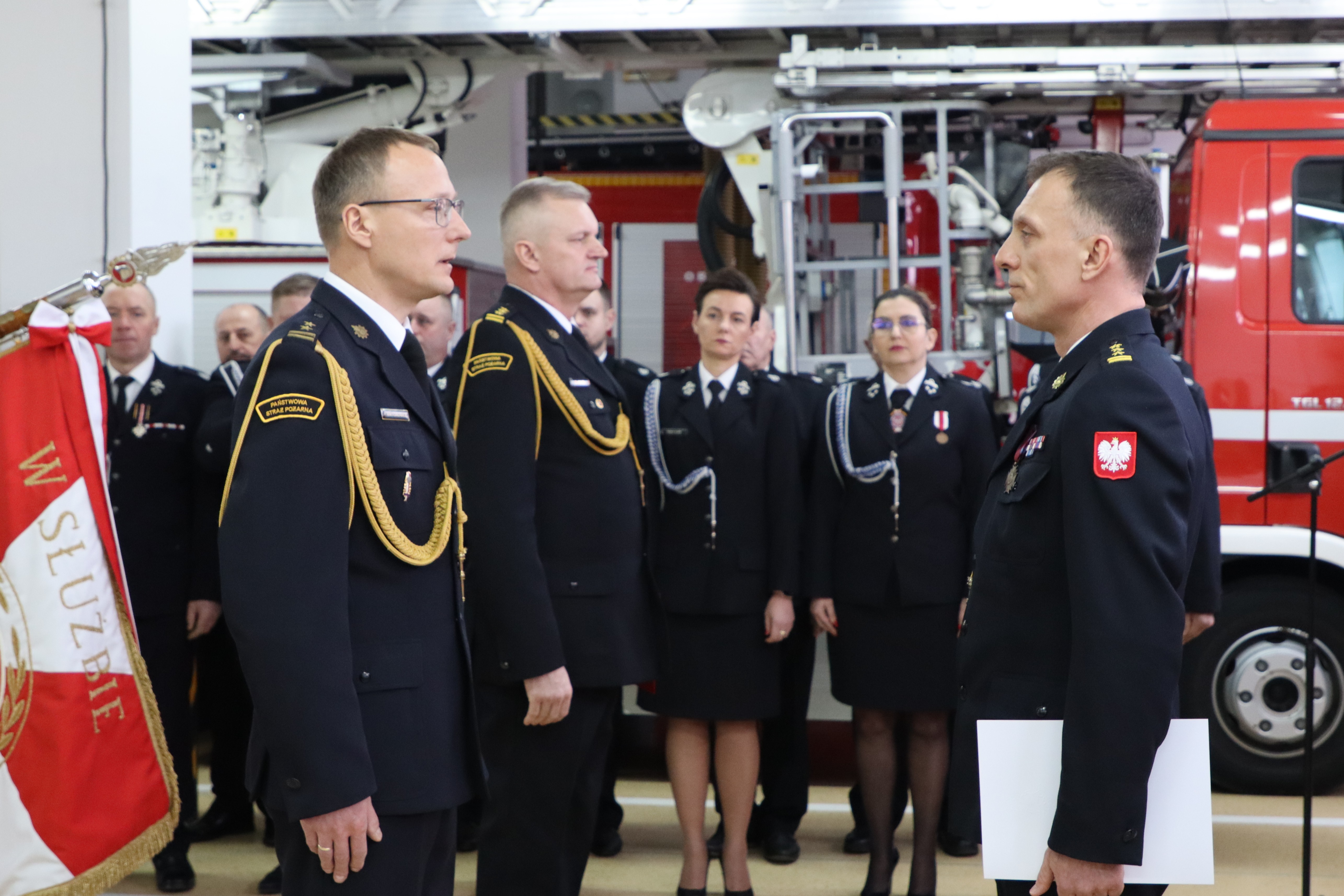Zdający obowiązki komendanta st. bryg. Marcin Sokół podziękował wszystkim zebranym za wieloletnią współpracę, wsparcie i pomoc, podkreślając, że służba w szeregach Państwowej Straży Pożarnej pozwoliła mu poznać i współpracować z wieloma wspaniałymi ludźmi. Szczególne słowa podziękowania skierował do funkcjonariuszy oraz pracowników cywilnych komendy za wspólne lata pracy, zrozumienie strażackich potrzeb oraz wzorową realizację służbowych zadań.