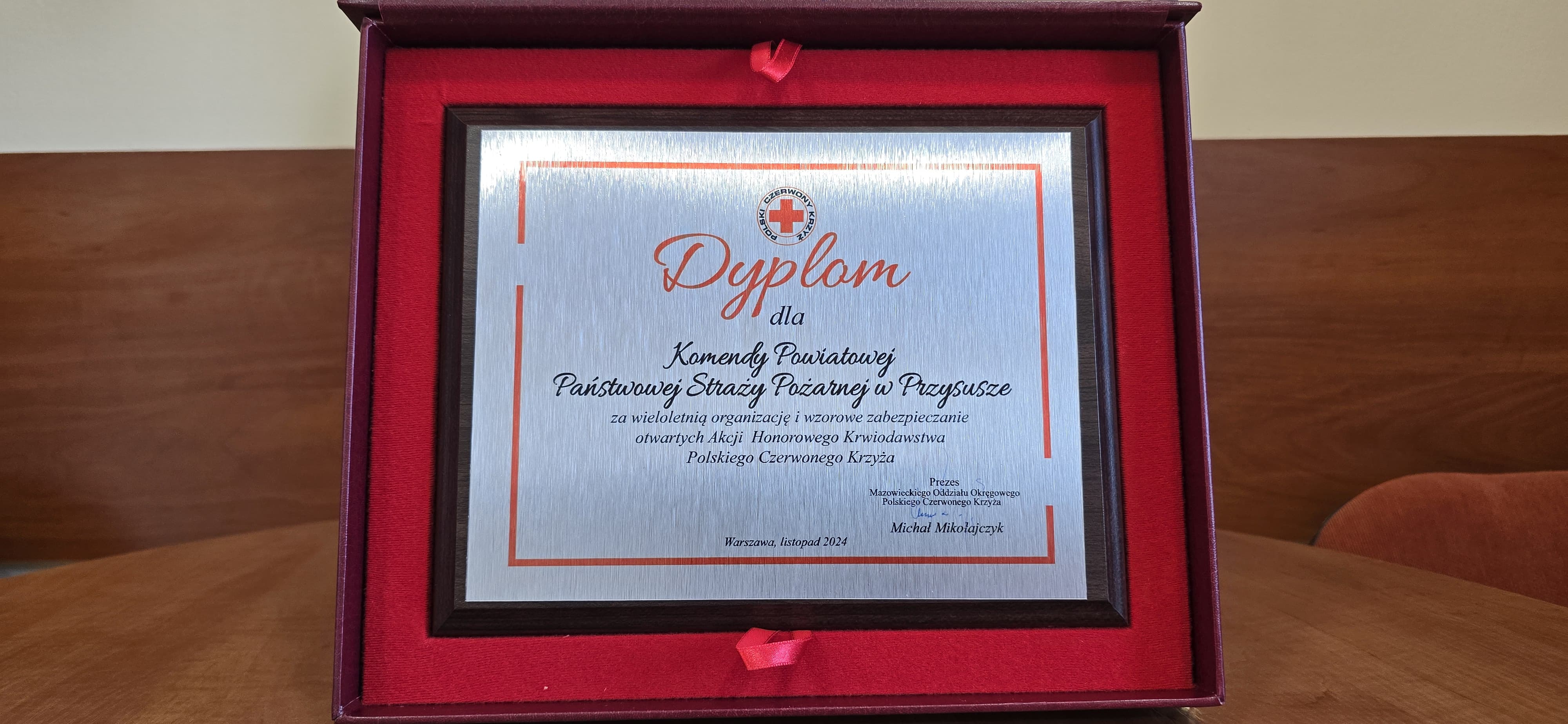 Funkcjonariusze odebrali dyplomy Mazowieckiej Okręgowej Rady Honorowego Krwiodawstwa oraz dyplom dla Komendy PSP w Przysusze za wieloletnią organizację i wzorowe zabezpieczanie otwartych Akcji Honorowego Krwiodawstwa Polskiego Czerwonego Krzyża.