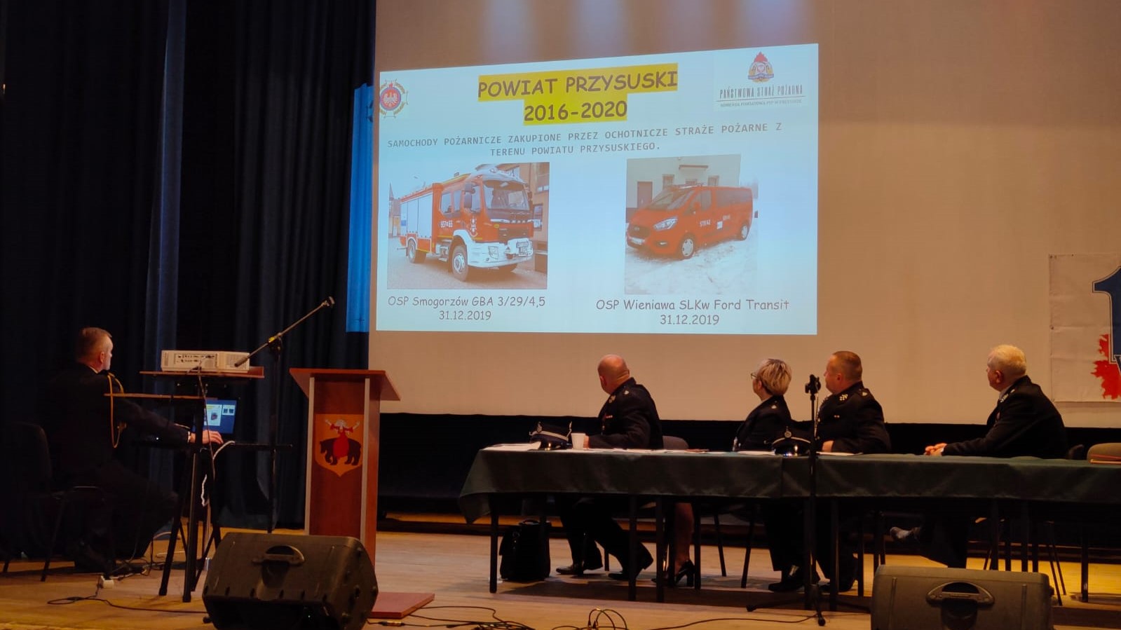 W panelu poświęconym dyskusji, Komendant Powiatowy Państwowej Straży Pożarnej w Przysusze bryg. Marcin Sokół przy wykorzystaniu przygotowanej prezentacji multimedialnej, omówił szereg zadań, które udało się zrealizować w omawianym okresie. Przedstawił informacje dotyczące statystyki wyjazdów jednostek ochrony p.poż. z terenu powiatu do zdarzeń. Dokonał podsumowania szkoleń zorganizowanych dla strażaków ratowników OSP, odniósł się również do działalności OSP w zakresie przeciwdziałania pandemii COVID-19. Komendant nakreślił zagadnienia z obszaru dotacji otrzymywanych przez jednostki OSP na zakup samochodów pożarniczych, sprzętu ratowniczo – gaśniczego, środków ochrony indywidualnej dla strażaków oraz remontów strażnic. W tym miejscu wskazał na źródła, z których pochodziły dotacje. Komendant zaprezentował także kilka charakterystycznych akcji ratowniczo – gaśniczych, przedłożył informacje o zorganizowanych powiatowych eliminacjach Ogólnopolskiego Turnieju Wiedzy Pożarniczej „Młodzież Zapobiega Pożarom”. Wspomniał o udziale strażaków w kampaniach społecznych służących zapoznaniu dzieci i osób dorosłych z zagrożeniami życia codziennego oraz sposobach bezpiecznego zachowania, w tym również o organizacji pikników strażackich w KP PSP w Przysusze. Pan bryg. Marcin Sokół wyszczególnił wszystkie jednostki OSP, które w ubiegłych pięciu latach świętowały swoje 100-lecia. Wspomniał także o zakupach nowych samochodów pożarniczych i sprzętu specjalistycznego dla KP PSP w Przysusze i jednostek OSP z terenu powiatu. Nadmienić należy, że w ostatnich pięciu latach do KP PSP w Przysusze trafiło 6 nowych pojazdów pożarniczych i 1 zabytkowy odrestaurowany przez strażaków tutejszej Jednostki Ratowniczo-Gaśniczej PSP, natomiast do jednostek OSP zakupiono 10 średnich samochodów ratowniczo-gaśniczych i 4 lekkie samochody pożarnicze.
