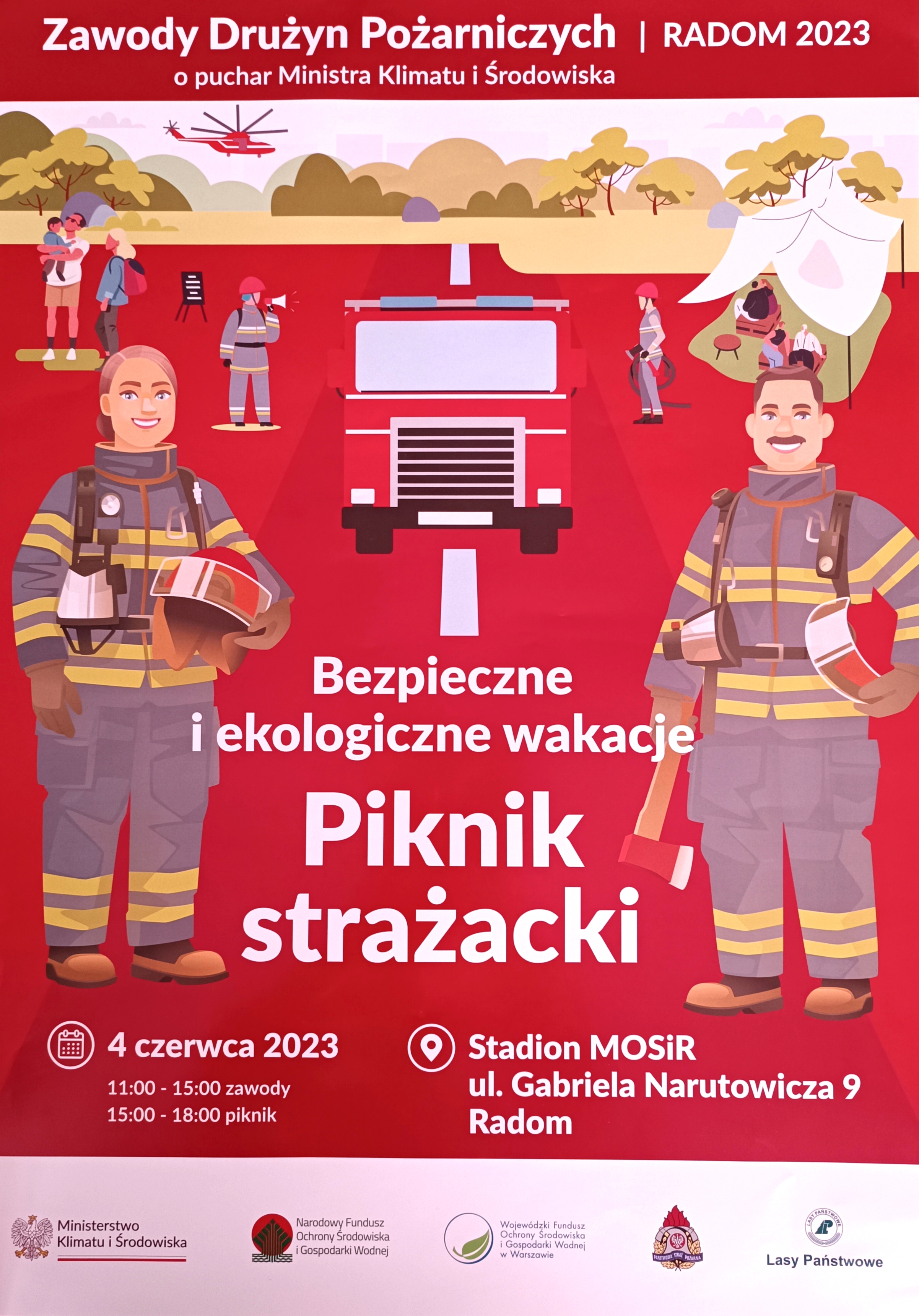 Dnia 04.06.2023 r. w Radomiu na stadionie Miejskiego Ośrodka Sportu i Rekreacji w Radomiu odbędą się zawody żeńskich i męskich drużyn pożarniczych OSP Ziemi Radomskiej o puchar Ministra Klimatu i Środowiska oraz piknik strażacki "Bezpieczne i ekologiczne wakacje".